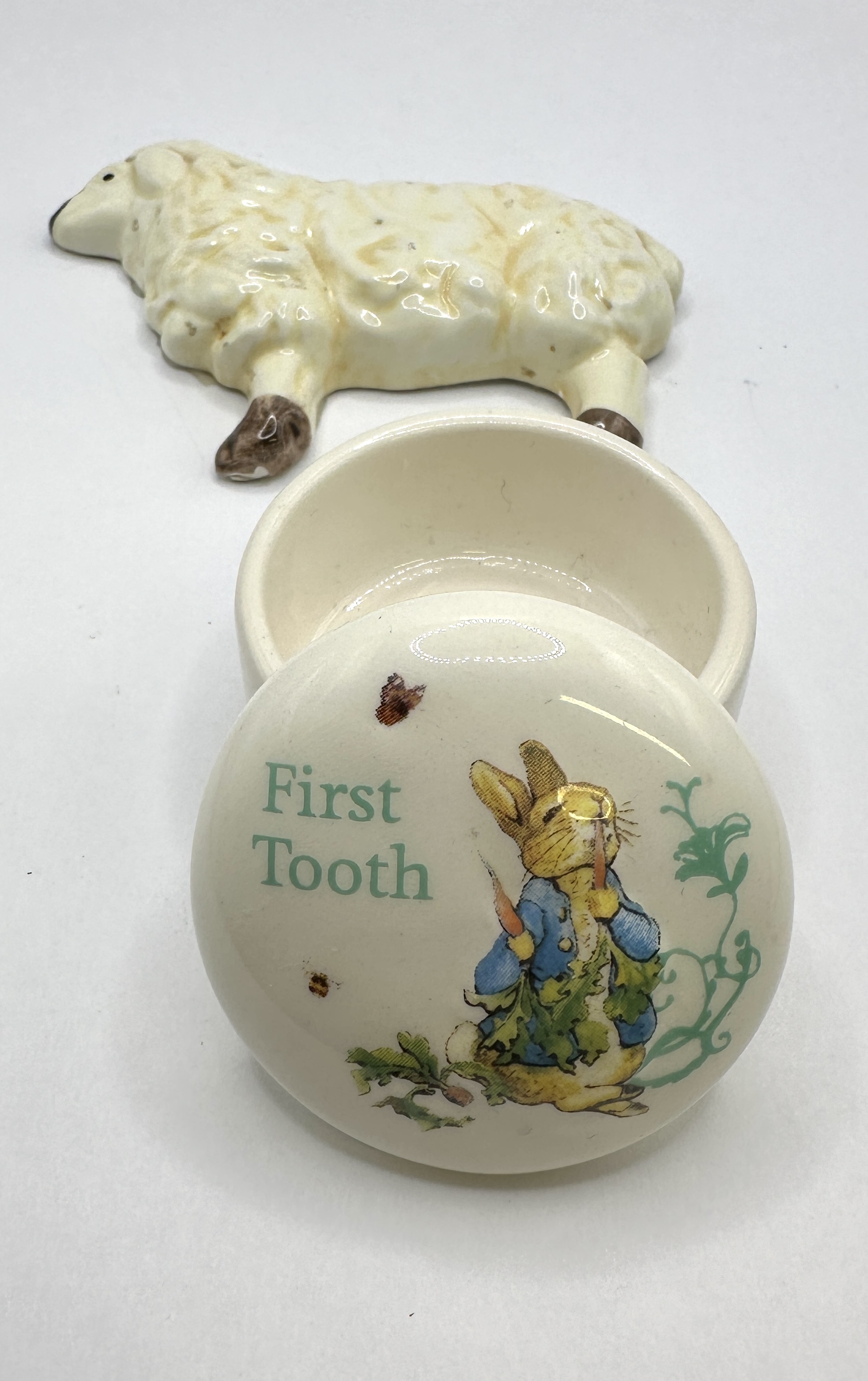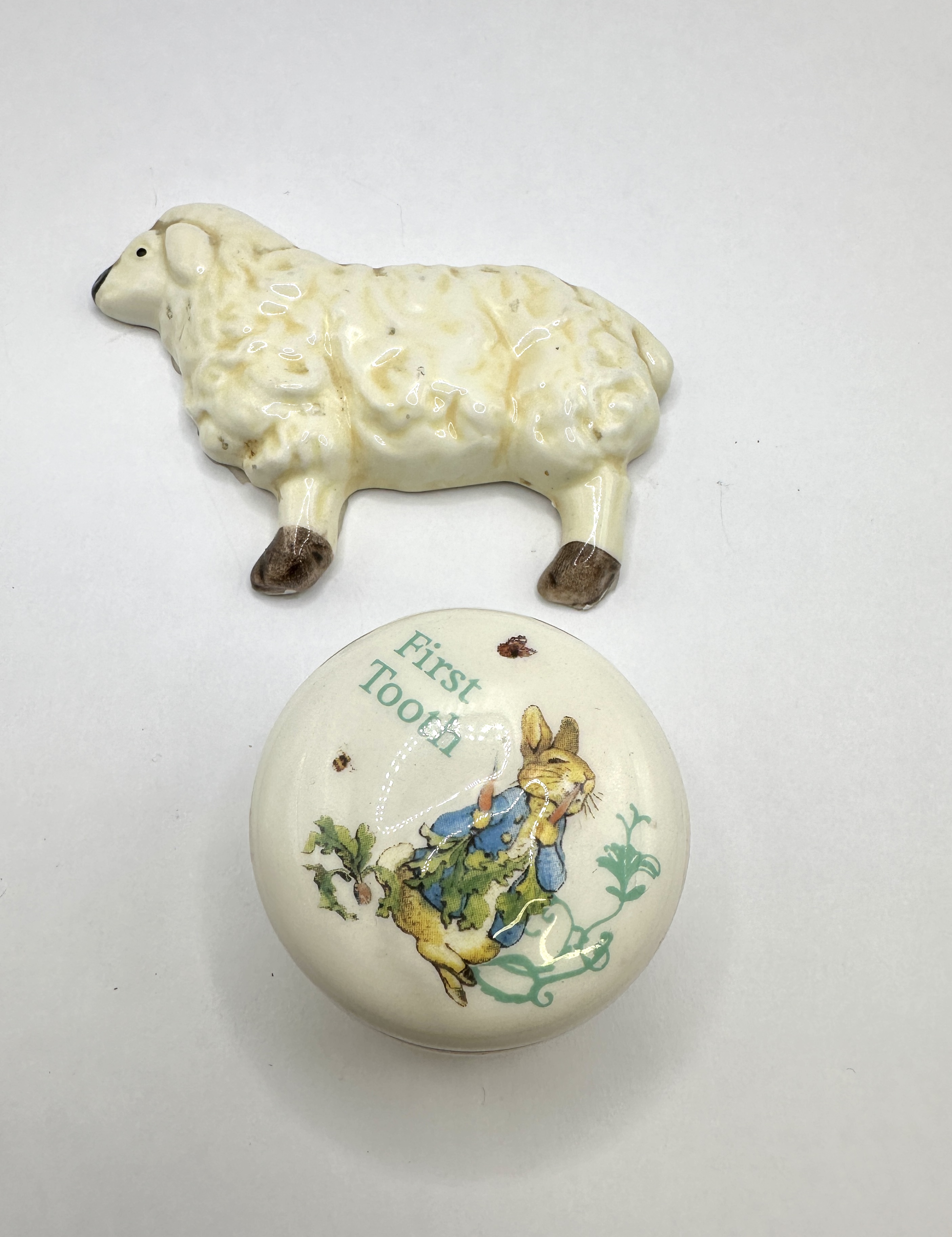 A collection of two glazed ceramic nursery items. The first item is a small, round, lidded keepsake box identified through web consensus as an Enesco Beatrix Potter Peter Rabbit First Tooth Box. The box is made of cream-colored ceramic. The lid is decorated with a transfer-printed image depicting Peter Rabbit wearing a blue jacket, surrounded by green foliage and small insects. The text “First Tooth” is rendered in green script across the lid. The second item is a small, dimensional figurine or plaque of a stylized sheep. The sheep features a heavily textured white glaze intended to simulate wool, contrasted with brown glaze accents applied to the legs and snout. Both items are glazed ceramicware designed for a children’s or nursery theme.
