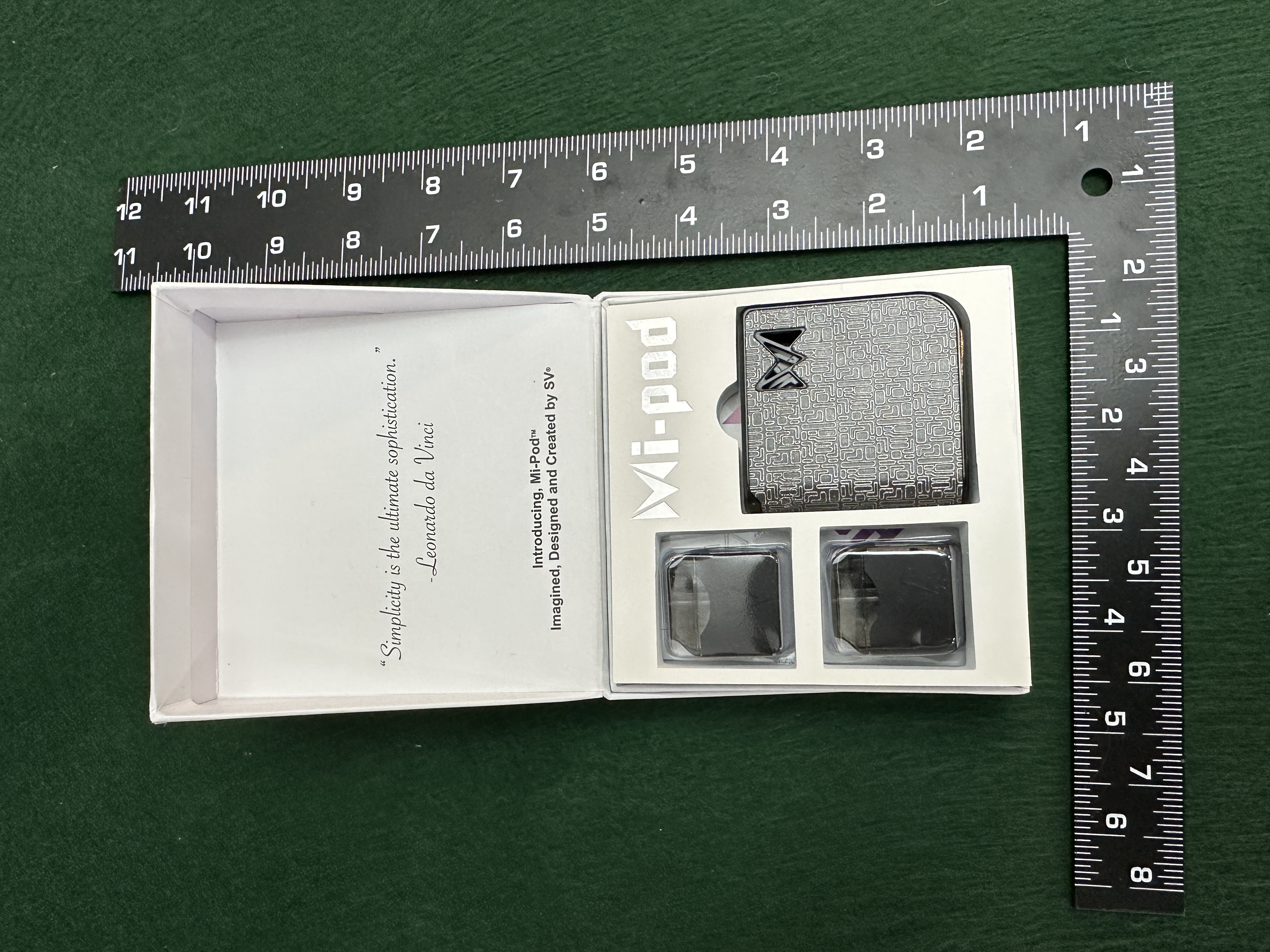 This lot comprises a Mi-Pod personal electronic vaporizer kit, designed and created by SV. The device features a distinctive metallic grey or chrome finish with an intricate etched maze pattern and a stylized butterfly logo. The kit is presented in its original open retail box, which includes the device and two additional, sealed pods/cartridges. The internal packaging features the text “Simplicity is the ultimate sophistication.” attributed to Leonardo da Vinci. The item appears to be in new, unused condition, suitable for a collector or user of the Mi-Pod system.