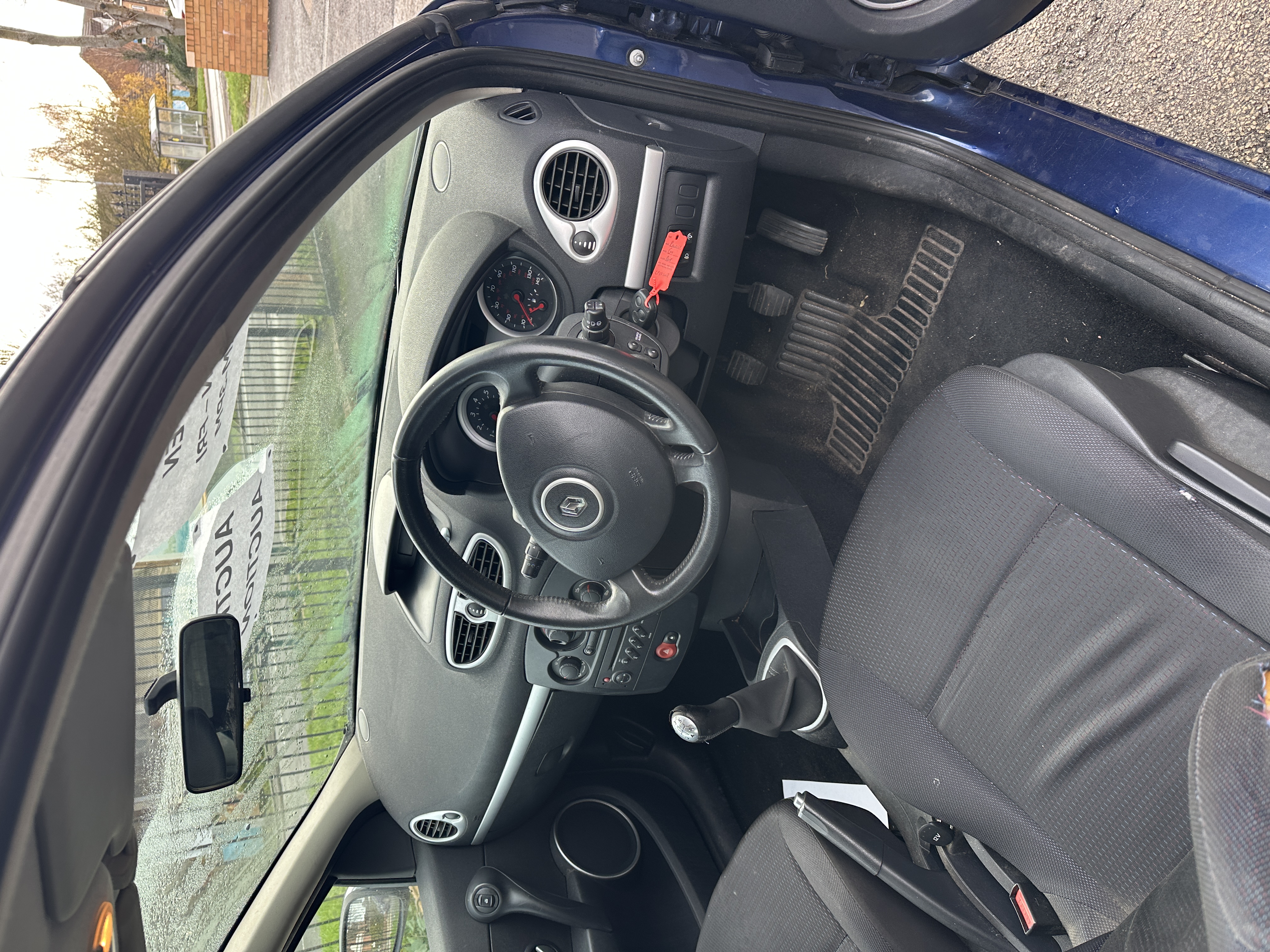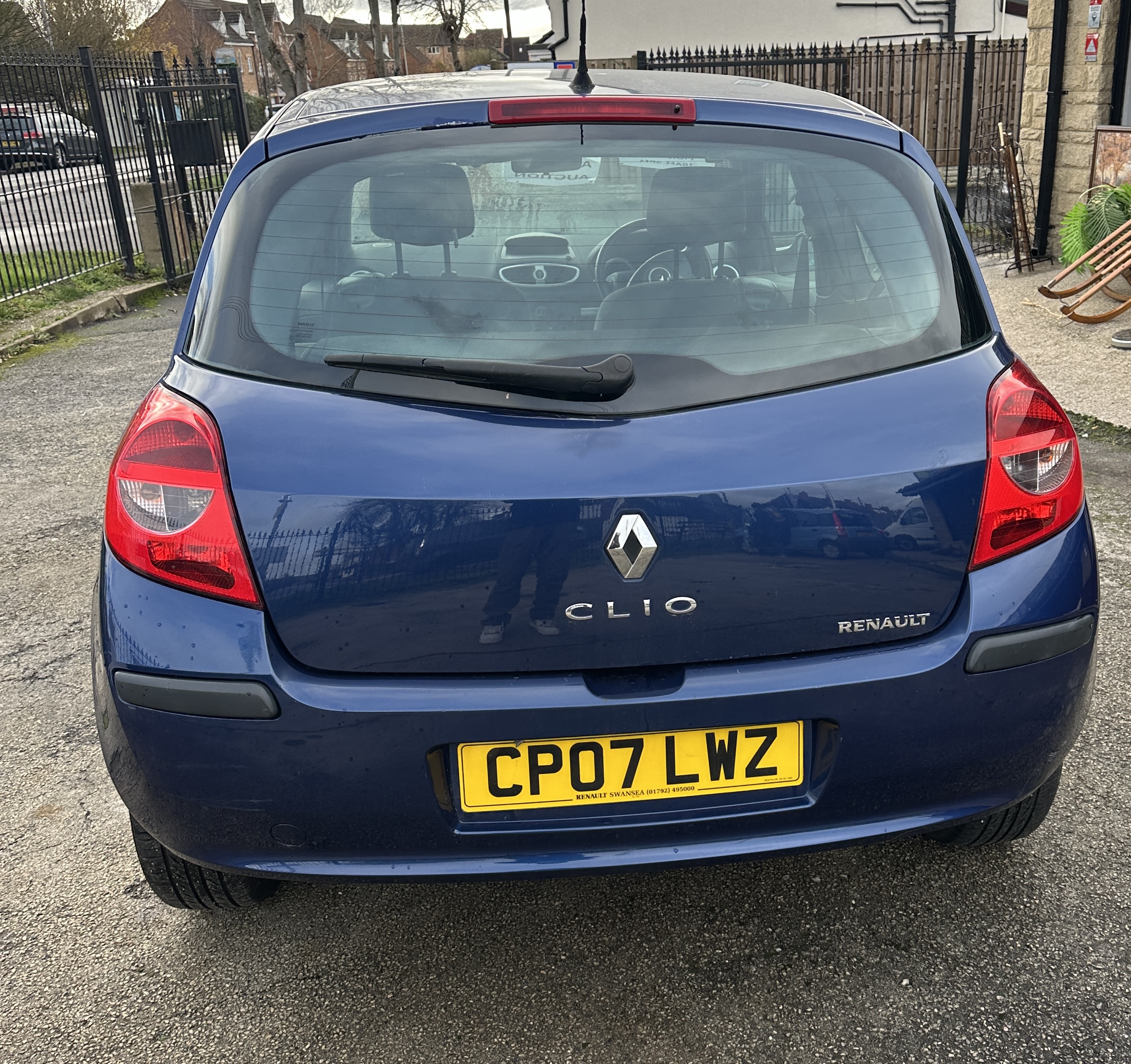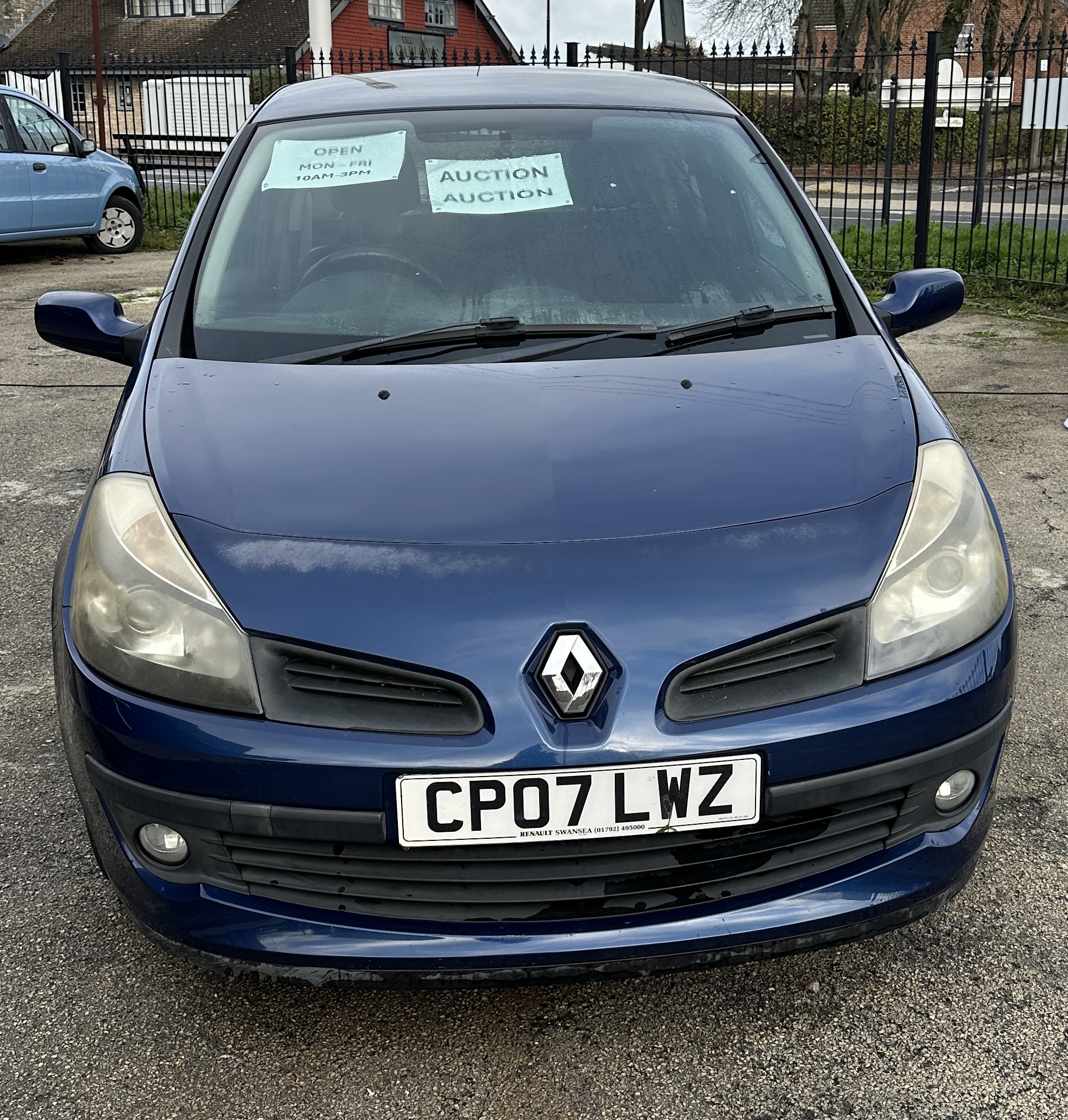 This is a 2007 Renault Clio 3-door hatchback finished in Dark Blue Metallic paint. The vehicle is equipped with a manual transmission and displays 101,375 miles on the odometer. The interior features black cloth upholstery and manual air conditioning controls. The vehicle is fitted with multi-spoke alloy wheels.