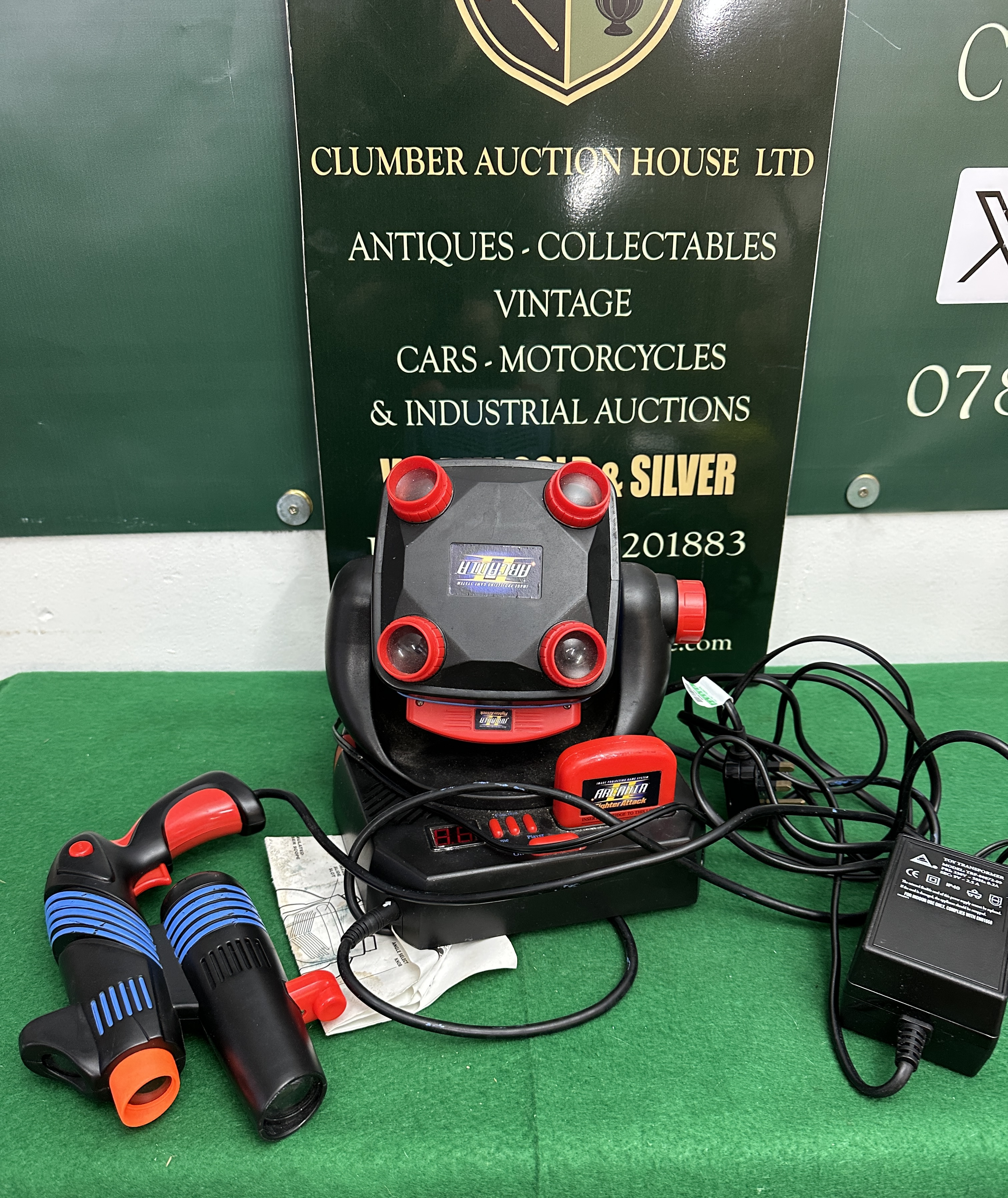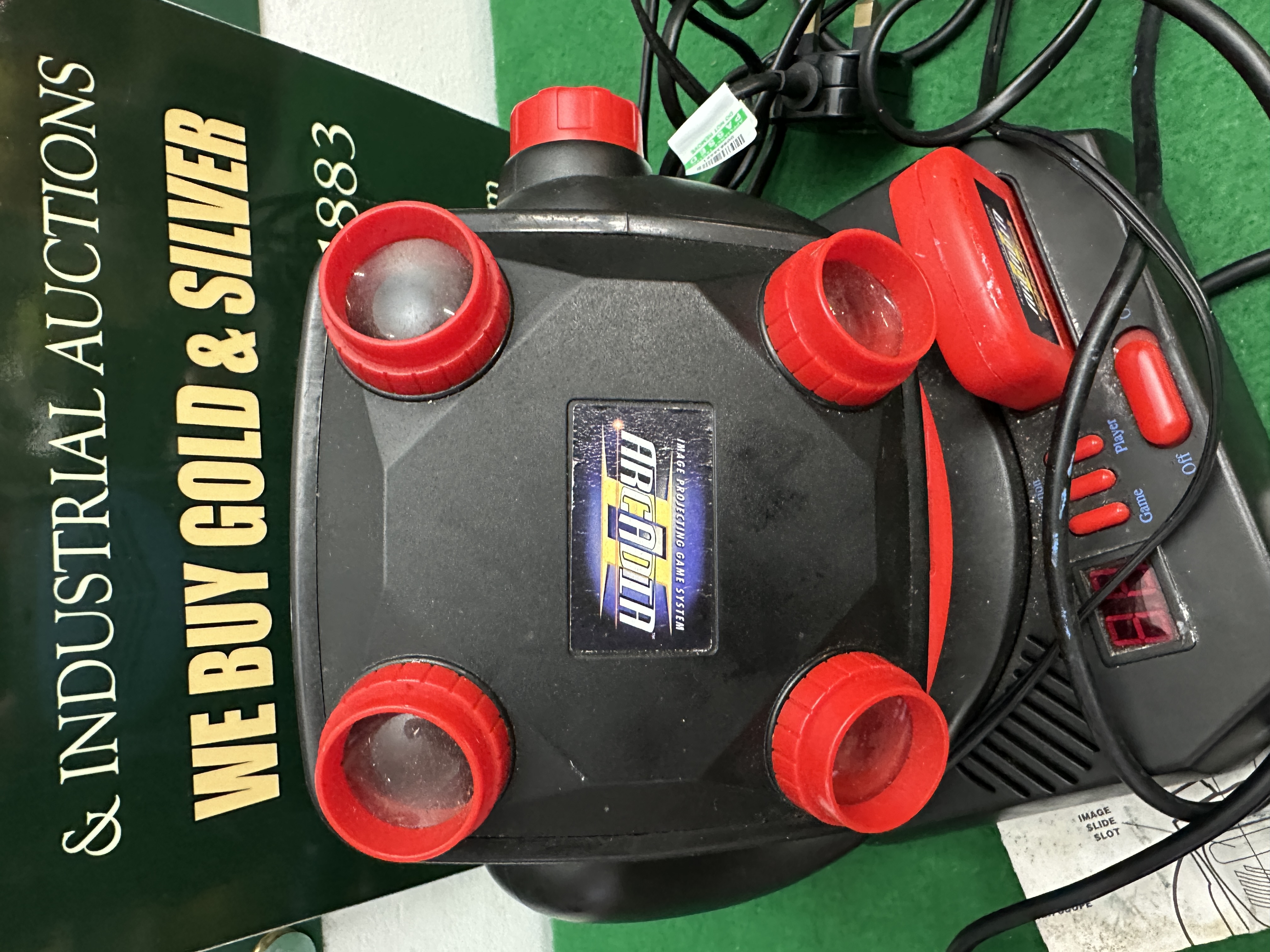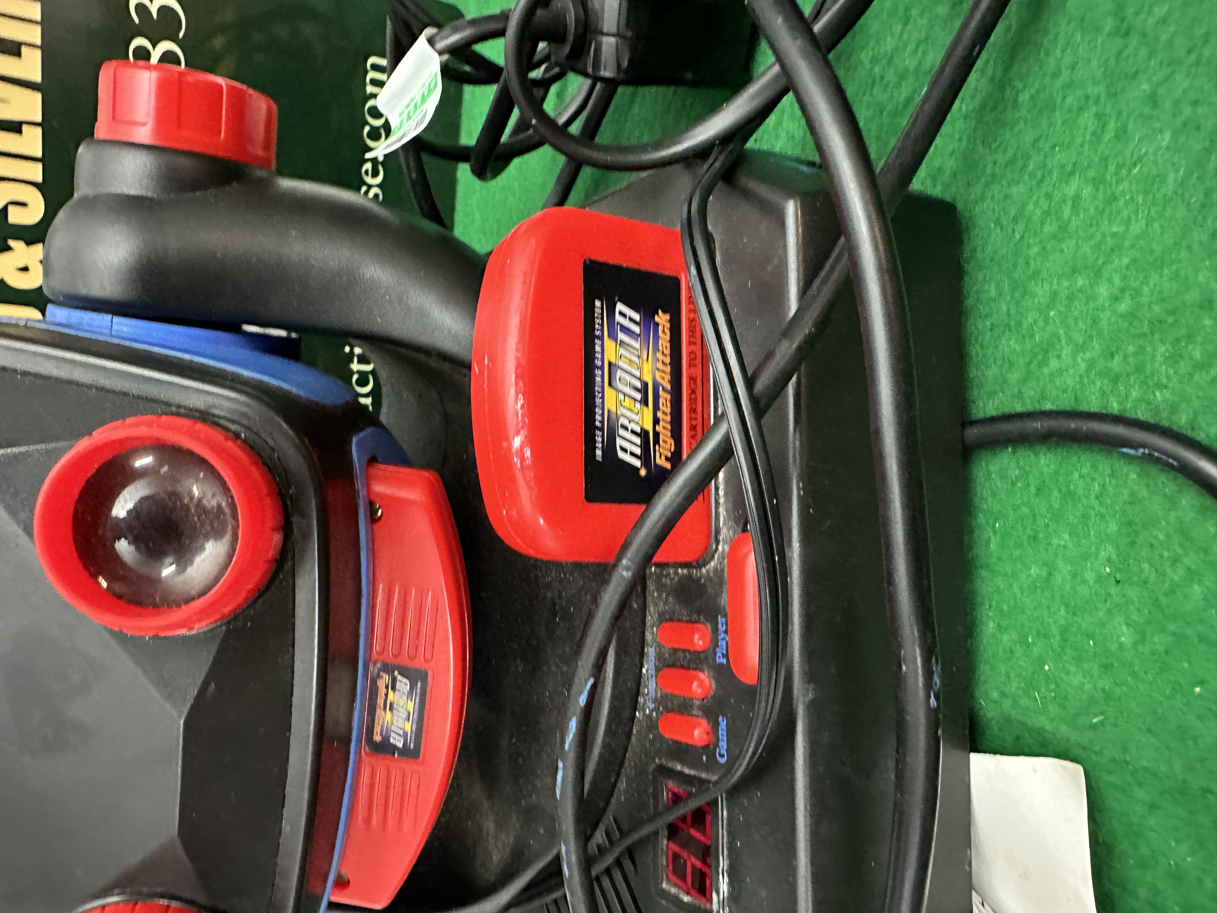 This lot comprises a complete vintage or collectible ARCADIATA Image Projection Game System. The system includes the main projection unit, two wired light-gun style controllers, and the power supply. One game cartridge, titled ARCADIATA FIGHTER ATTACK, is included and inserted into the console base. The system base features control buttons labeled “Game,” “Player,” and “Off,” alongside a digital score/timer display.