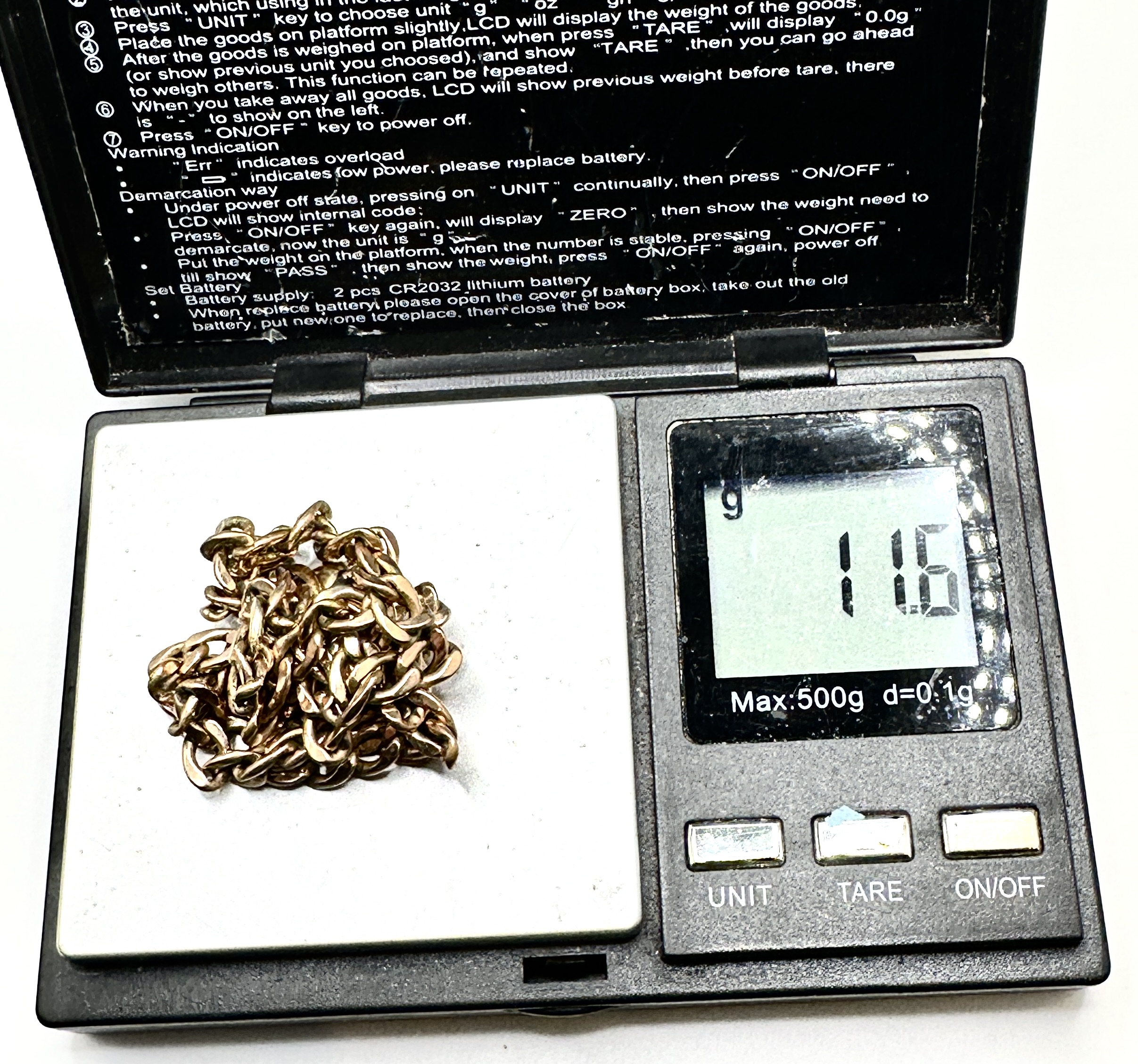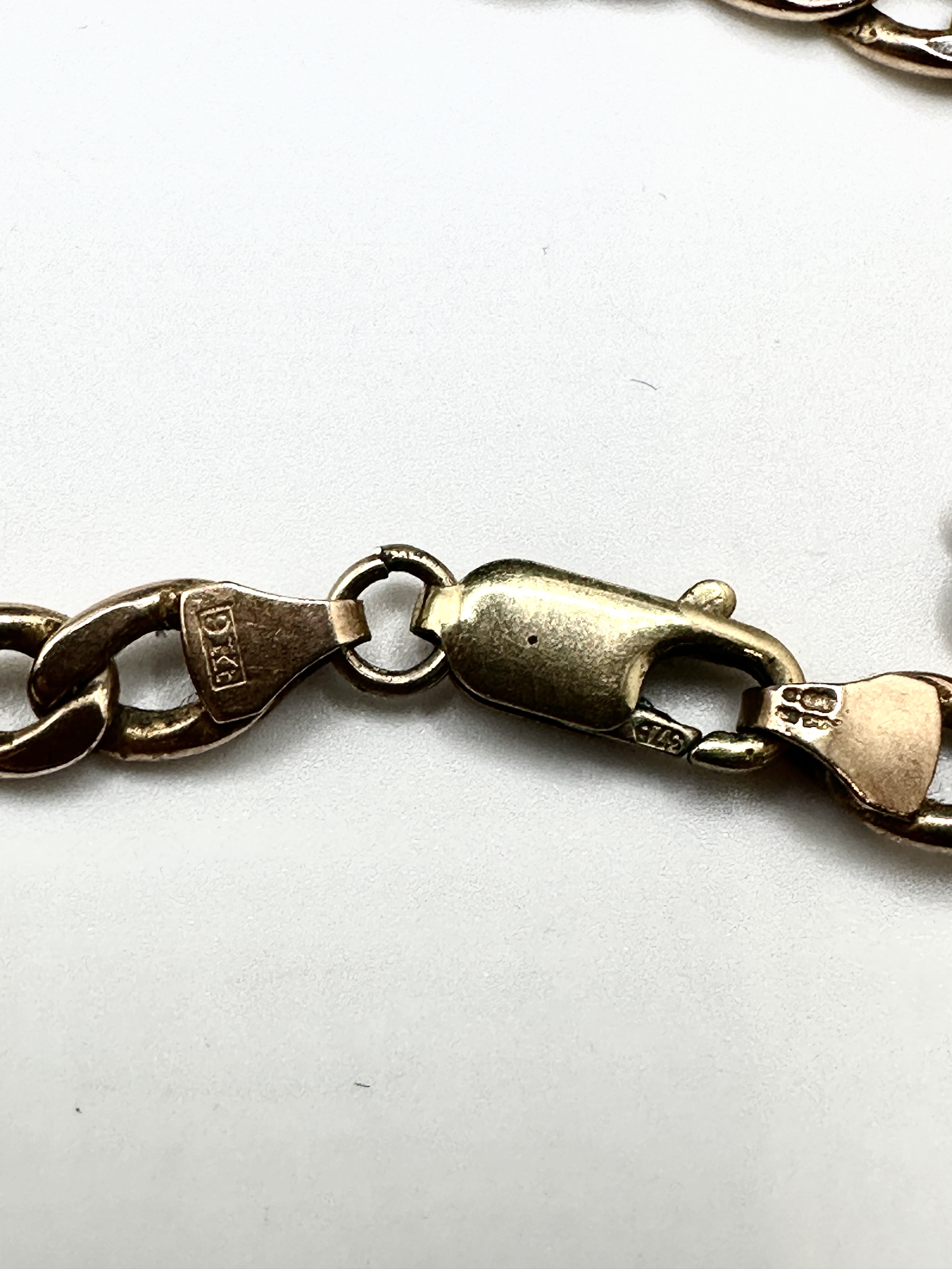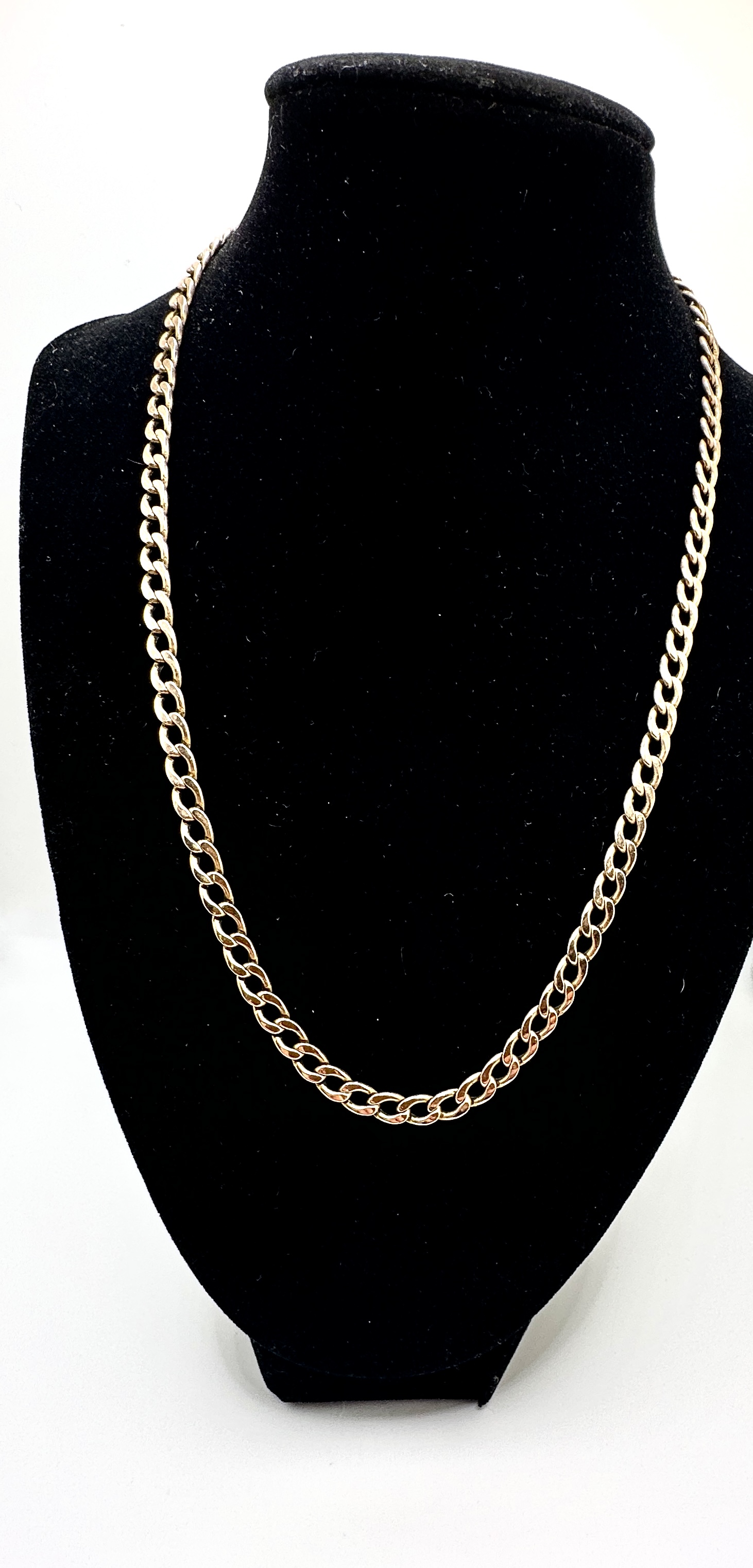 A single curb link chain necklace constructed of 9k gold, as confirmed by user-provided facts. The necklace features medium-gauge, interlocking links forming the classic curb style. It is secured by a lobster claw clasp closure. A stamp reading 10KP is visible on the attached terminal loop tab of the clasp. The chain is displayed on a black bust.