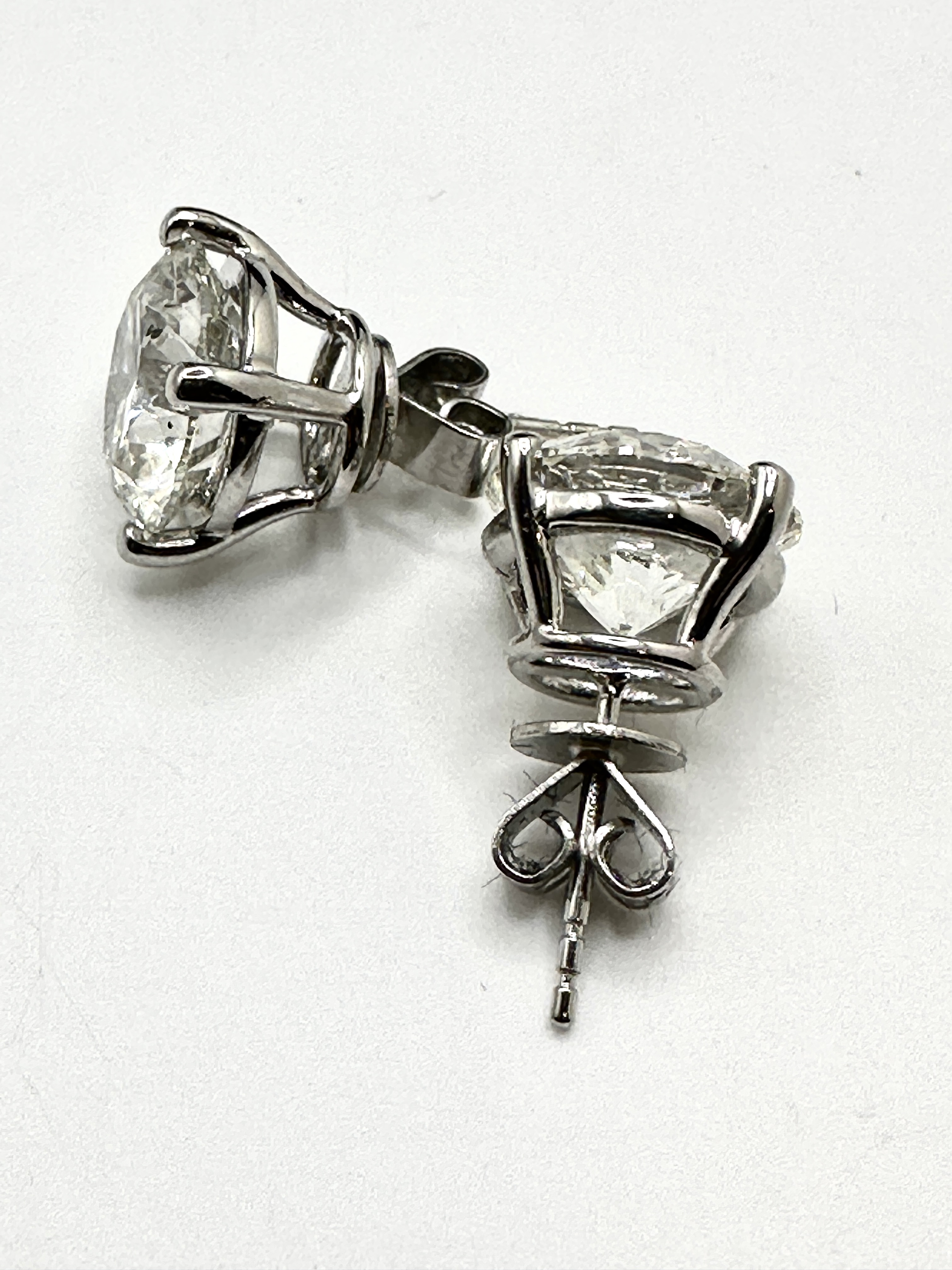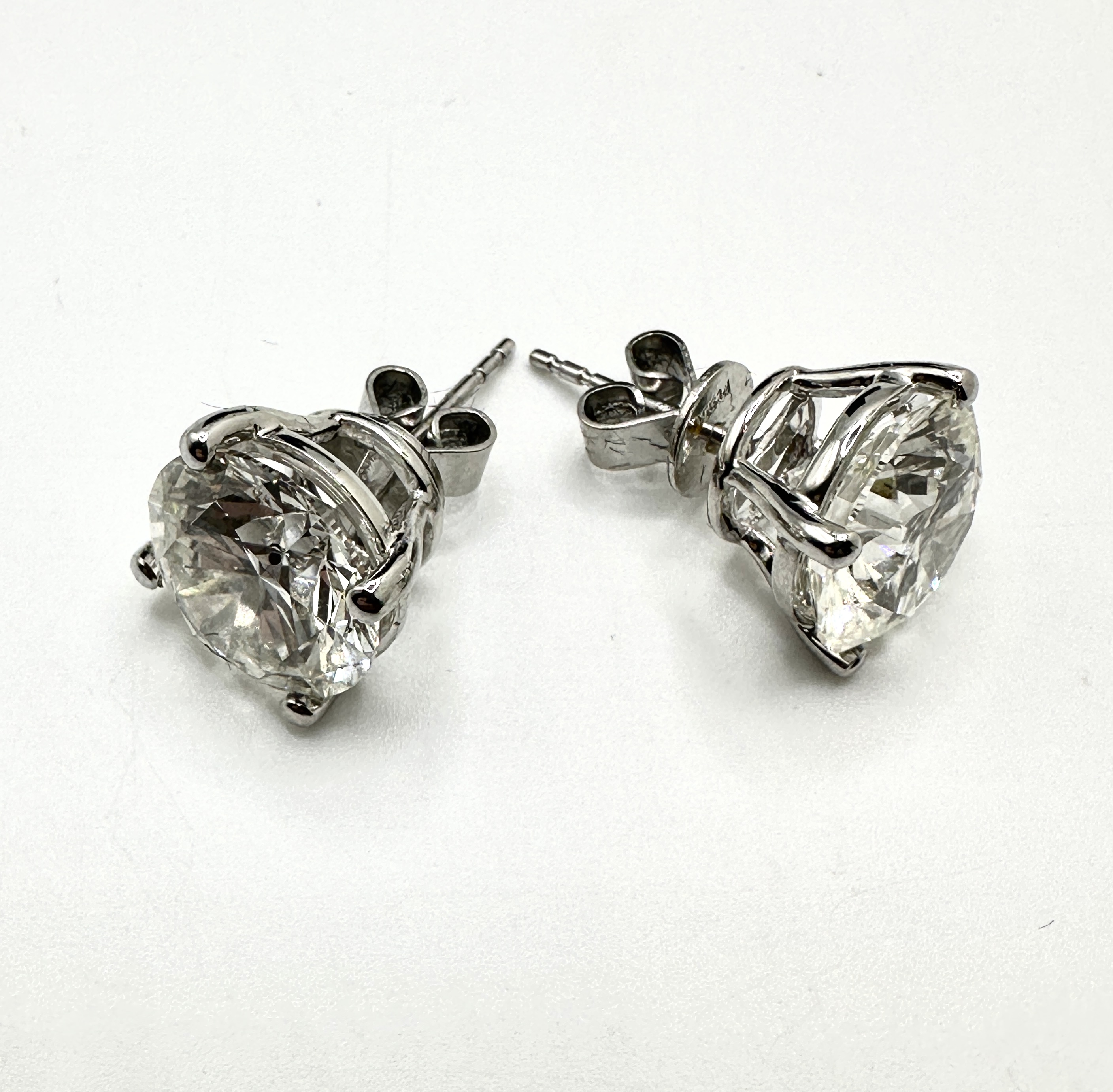 A pair of contemporary solitaire stud earrings, confirmed to be crafted from Platinum and set with a total of 10.05 carats of lab-grown diamonds. Each earring features a single, large, round brilliant-cut colorless stone secured in a substantial four-prong open basket setting. The highly polished white metal utilizes a post-and-clutch backing system, complete with butterfly friction clutches. The total carat weight is confirmed at 10.05ct.