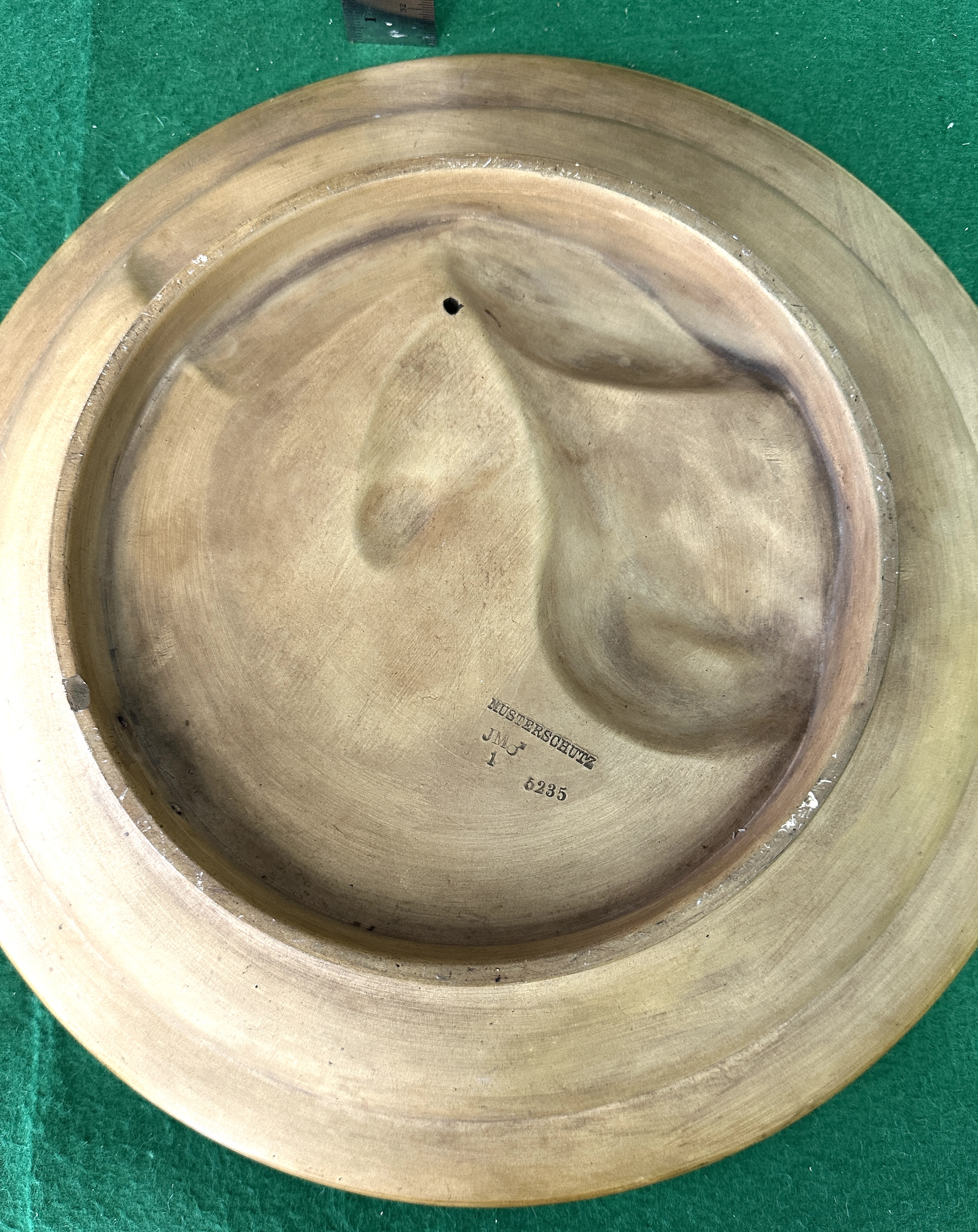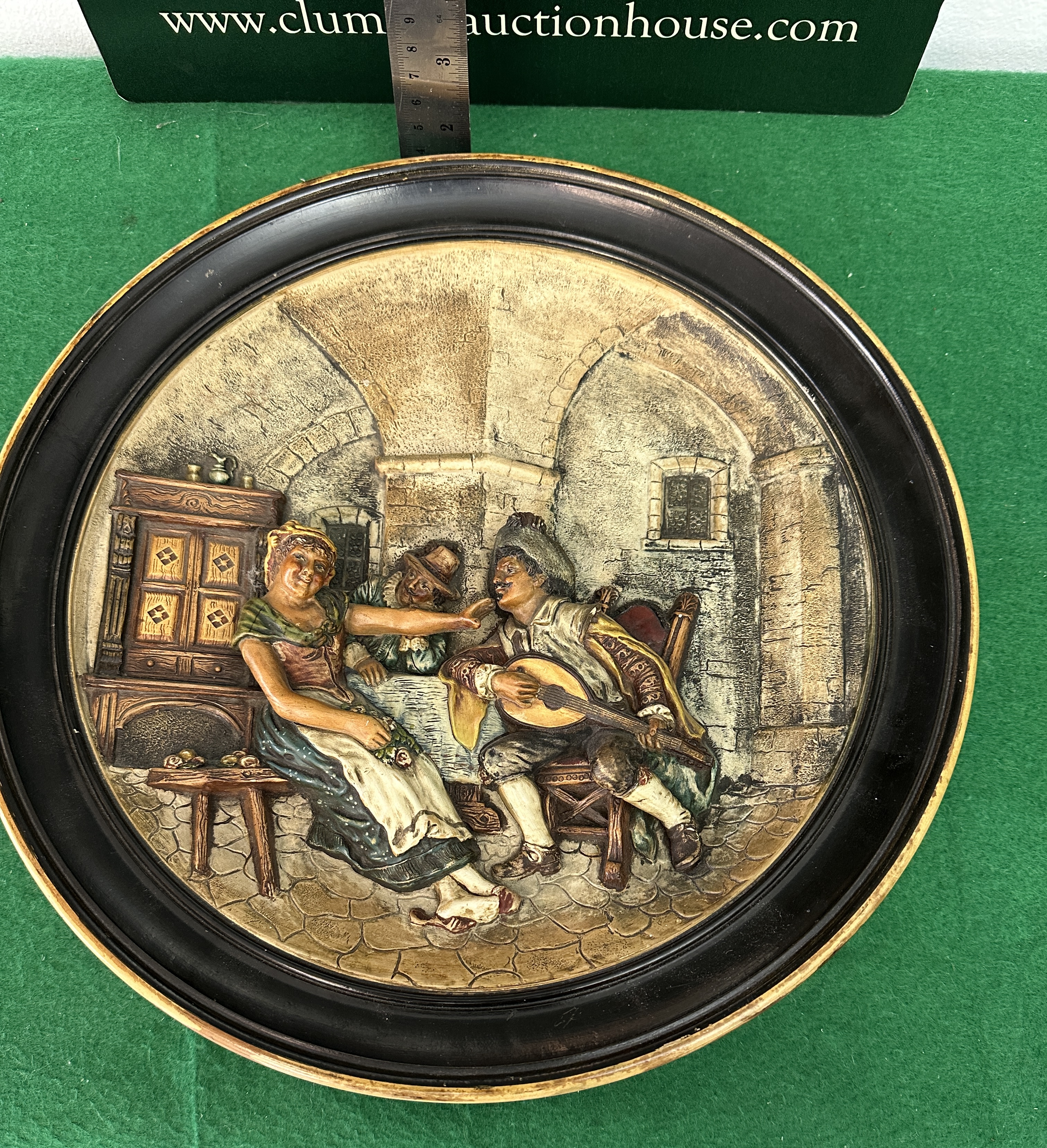 A circular relief plaque depicting an interior genre scene featuring three figures. The scene shows a seated woman, a man playing a stringed instrument, and a third figure leaning over the seated woman, set within an arched stone interior. The relief is constructed from molded composition or plaster, finished with polychrome staining to simulate age and texture. It is housed within a circular frame featuring a black outer edge and a gold-tone inner fillet. The reverse side is stained tan/brown and features molded or stamped markings in the center, including the German phrase Musterschutz (Design Protection), the initials J M G, the number 1, and the model number 6235.