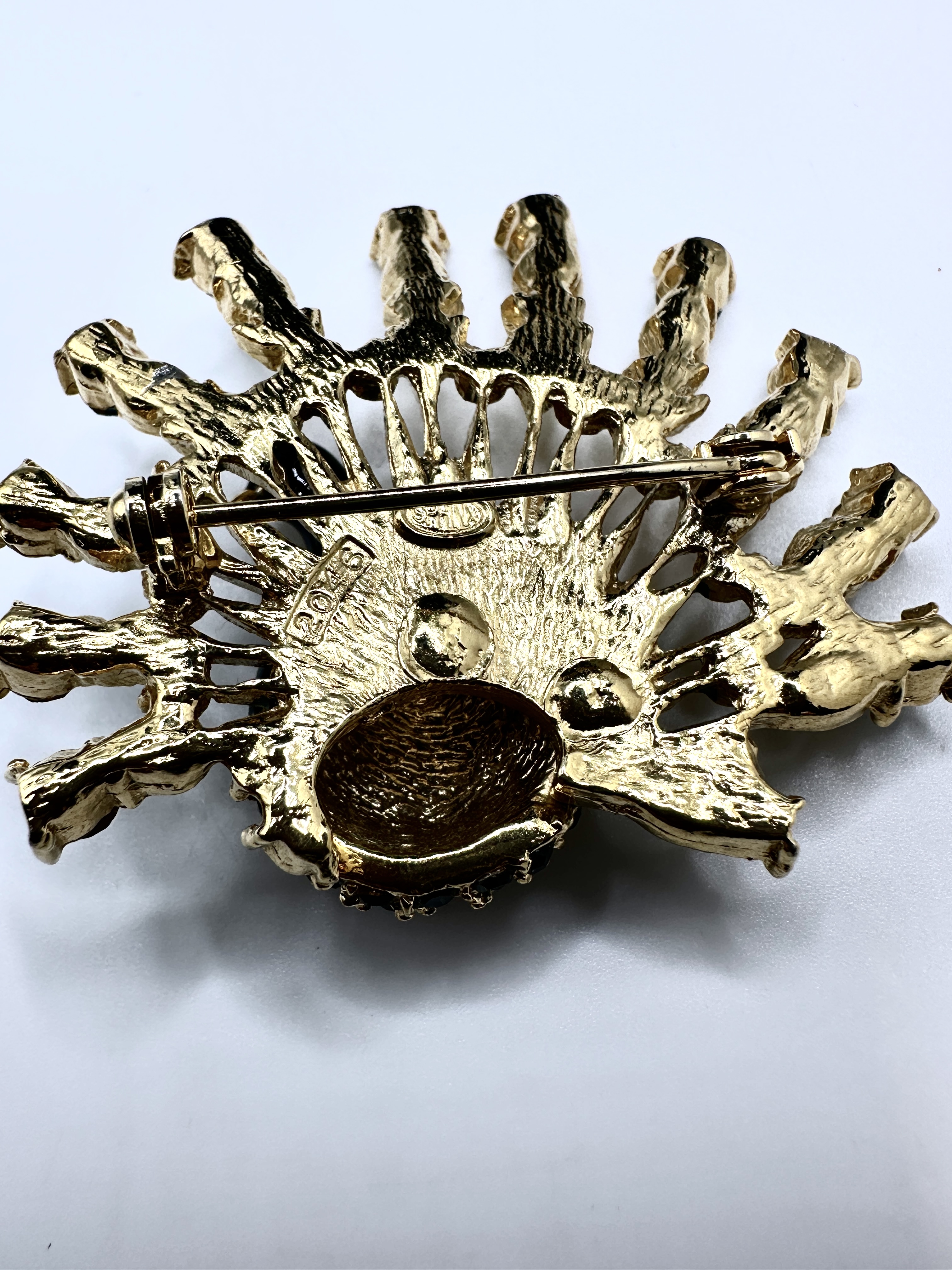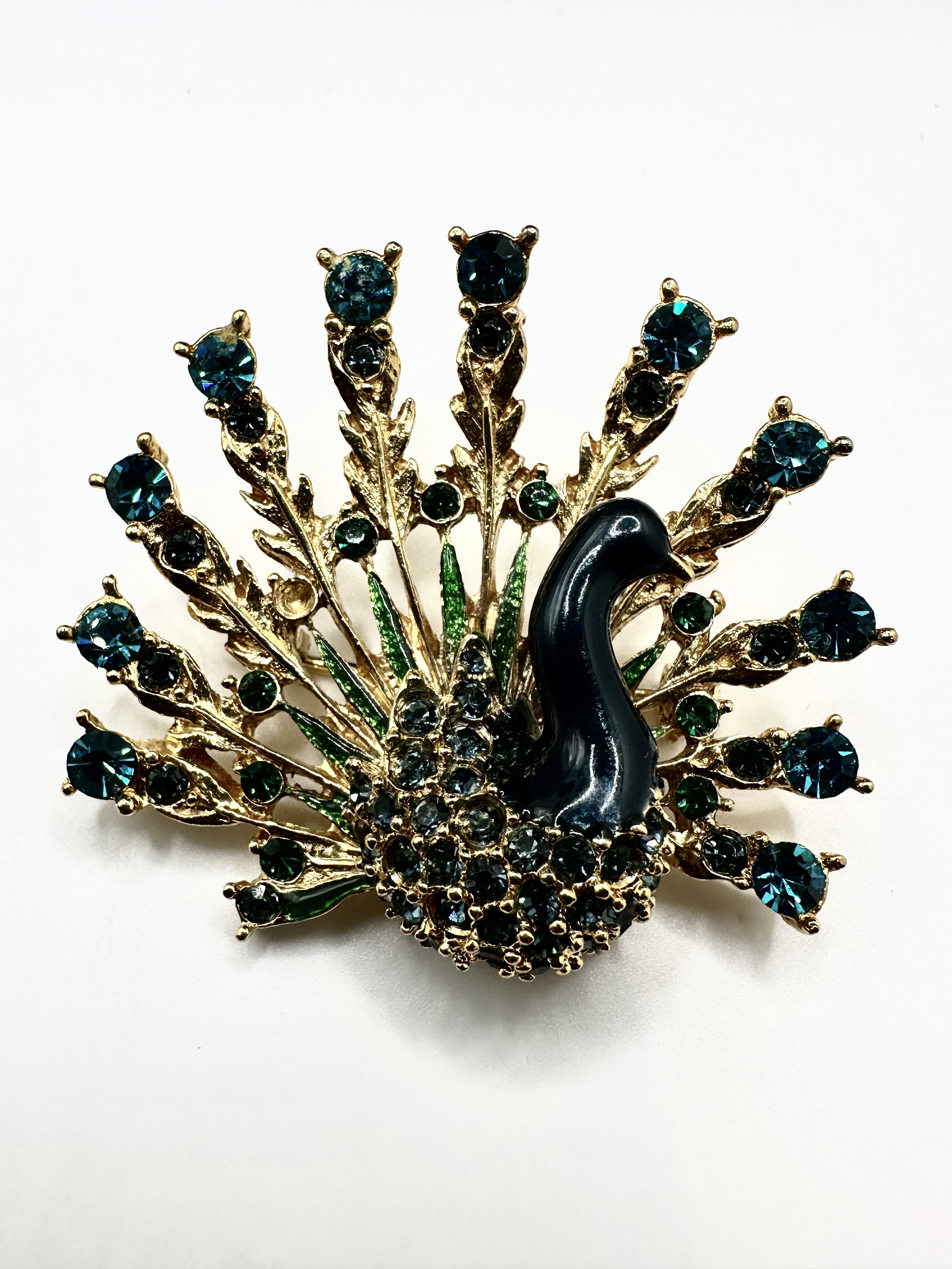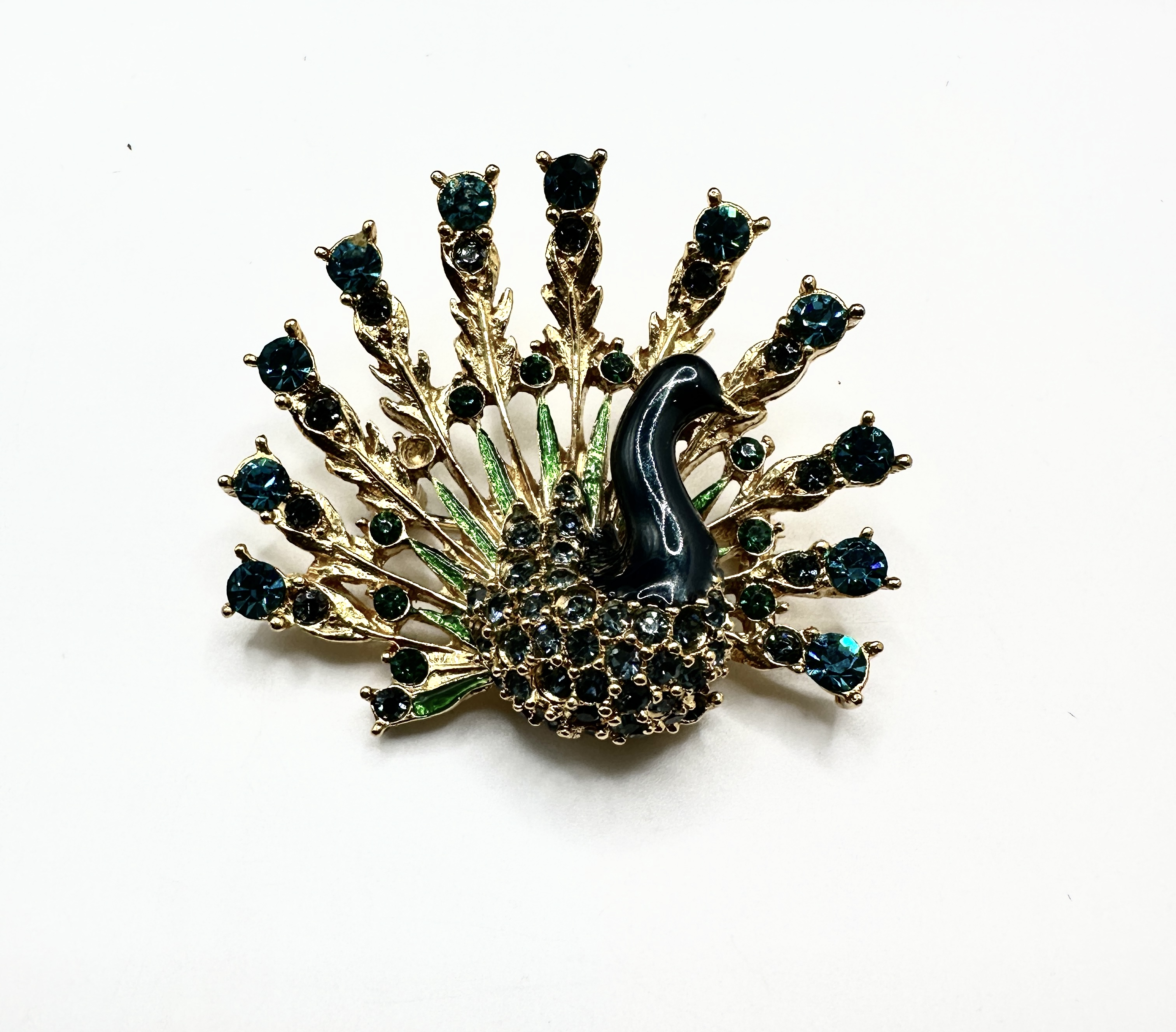 A single figural peacock brooch constructed of gold-tone base metal. The brooch features an open tail fan set with numerous round-cut paste stones in shades of teal and blue-green. The tail feathers are detailed with bright green enamel accents. The body of the peacock is finished with a deep navy or black enamel. The reverse displays an open framework backing with a standard safety clasp pin mechanism. The piece is clearly marked “ZOEY” centered in relief on the reverse. The item is presented within a black plastic presentation box lined with black foam.