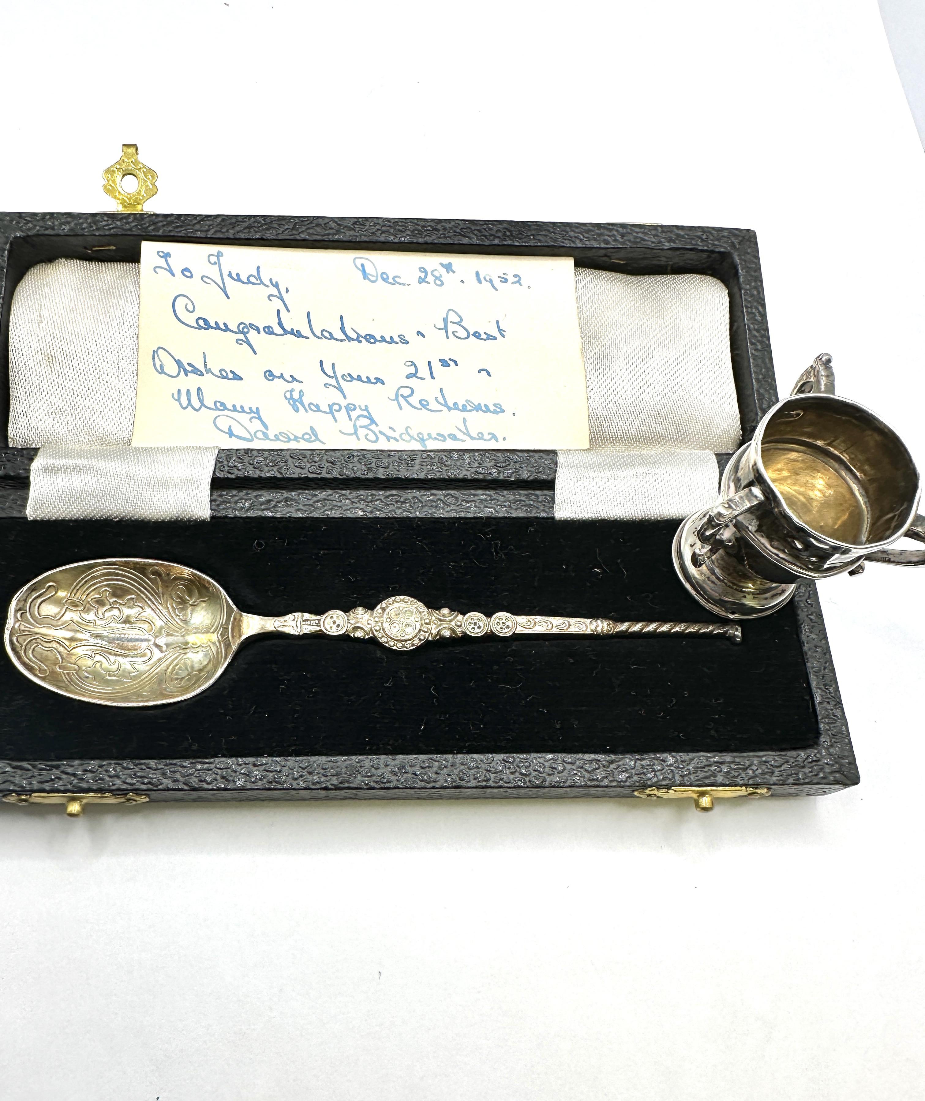 A collection of two commemorative items, executed in 925 silver, presented in a fitted hinged black leatherette case. The set includes a single ornate souvenir spoon, a miniature two-handled trophy cup, the fitted case, and a handwritten presentation note. The spoon is styled after the traditional British Coronation Anointing Spoon, featuring an elaborately engraved figural bowl and a handle adorned with multiple small circular colorless stones set around a central motif, terminating in a twisted terminal section. The miniature trophy cup features two applied handles, banded detailing, and indistinct interior hallmarks visible. The fitted case is lined with black velvet and white silk/satin. The accompanying handwritten note, dated December 28th, 1933, reads: “To Judy, Dec 28th. 1933. Congratulations & Best Dishes on Your 21st, Many Happy Returns. David Bridgewater.”