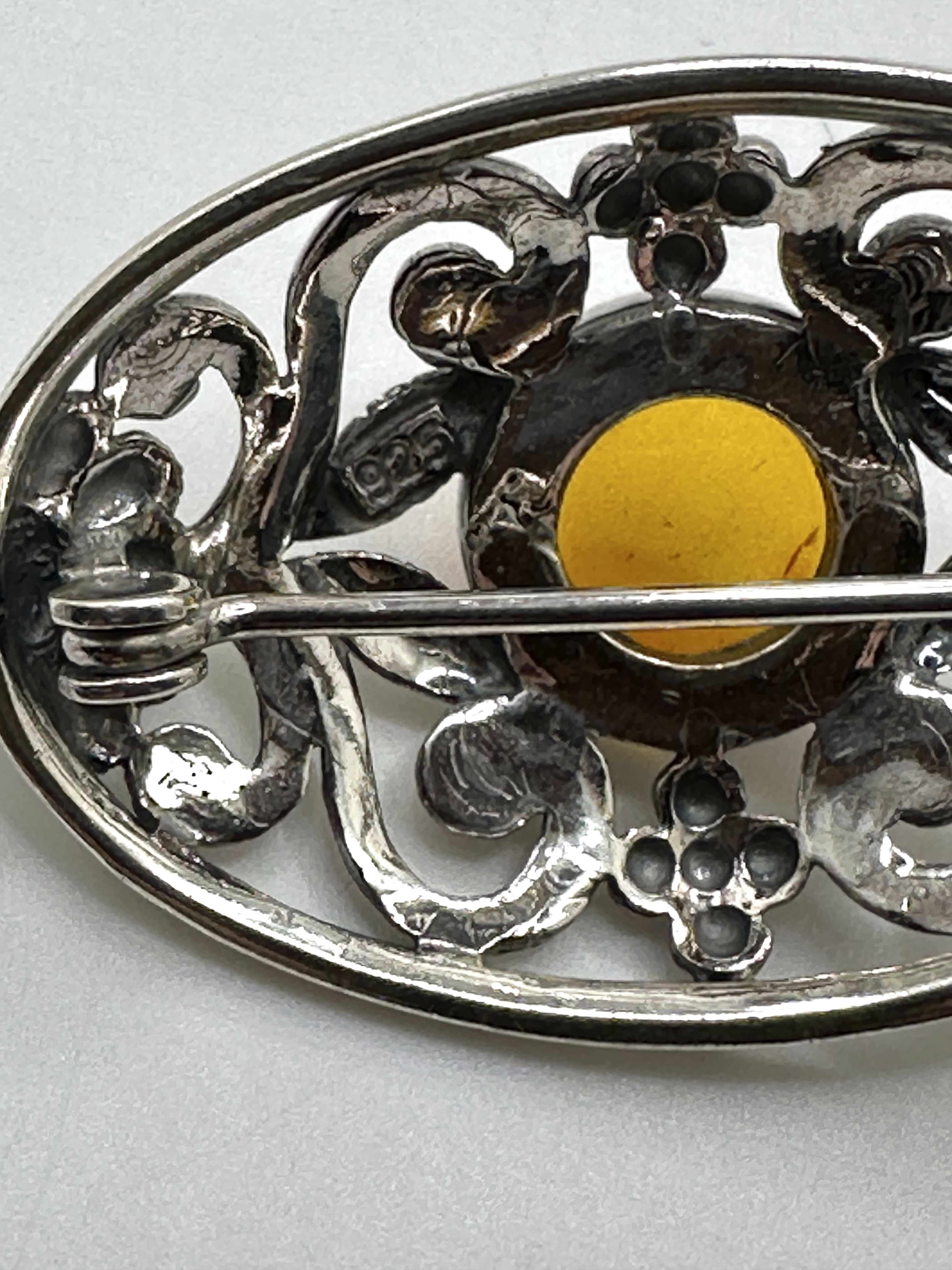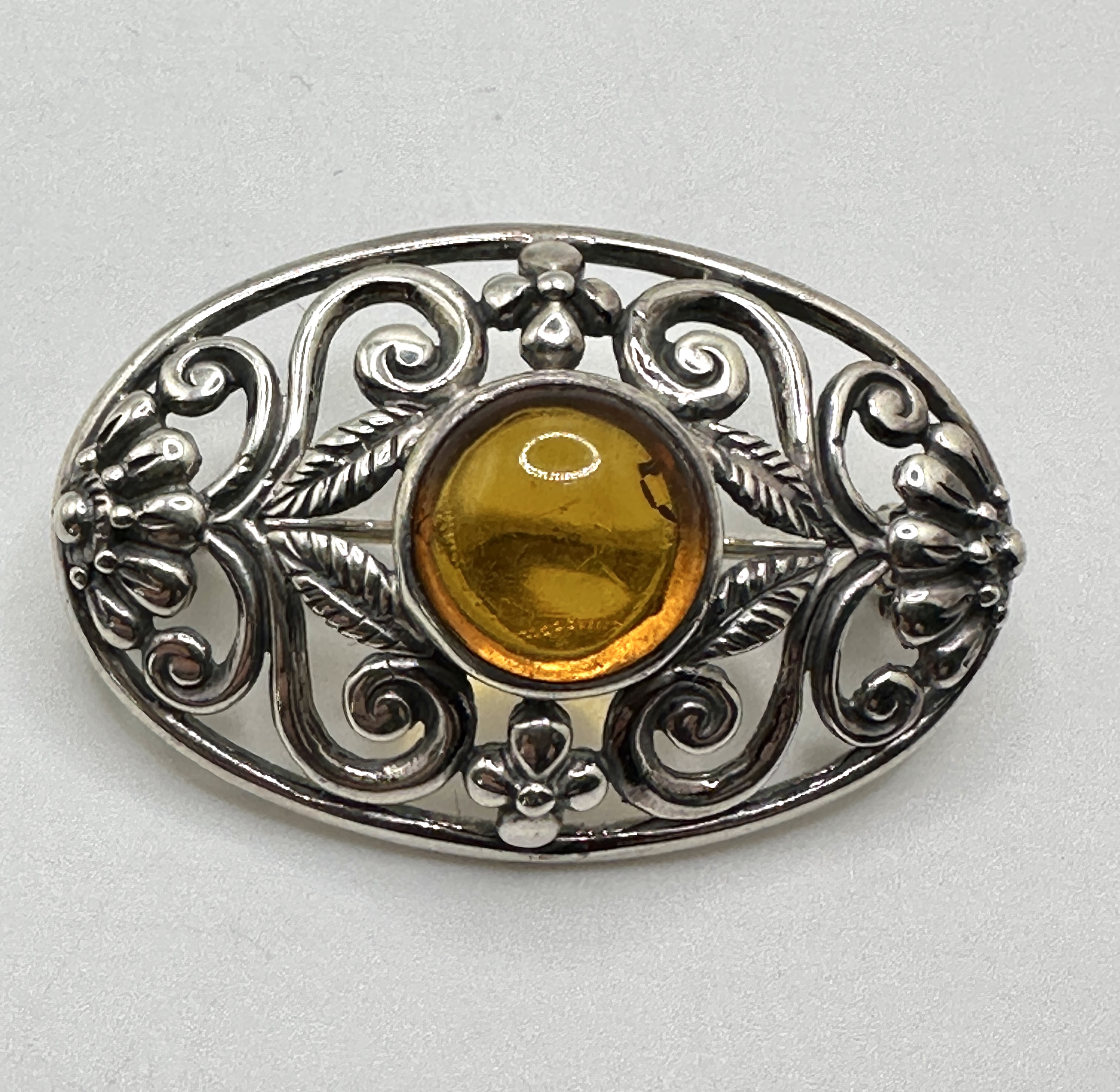 A vintage brooch crafted from 925 silver, featuring an oval openwork design. The setting is characterized by stylized scrolling vines, leaves, and floral motifs, often associated with Scandinavian or Art Nouveau revival styles. Centrally set is a single, domed cabochon of translucent honey-yellow amber, secured by a bezel setting. The reverse side is fitted with a standard pin-back and rollover clasp mechanism. A purity mark of “925” is visible on the reverse, confirming the sterling silver composition.