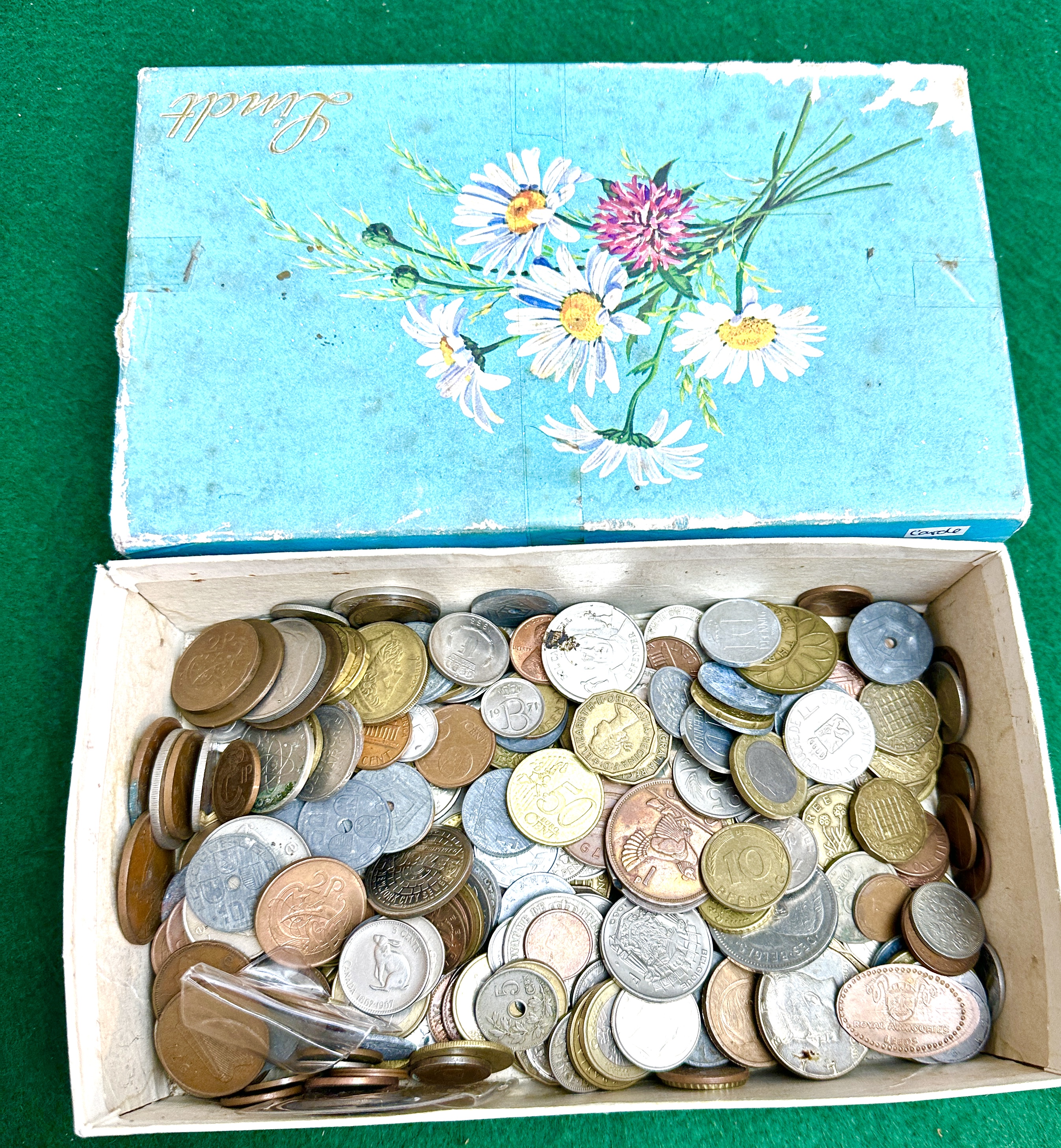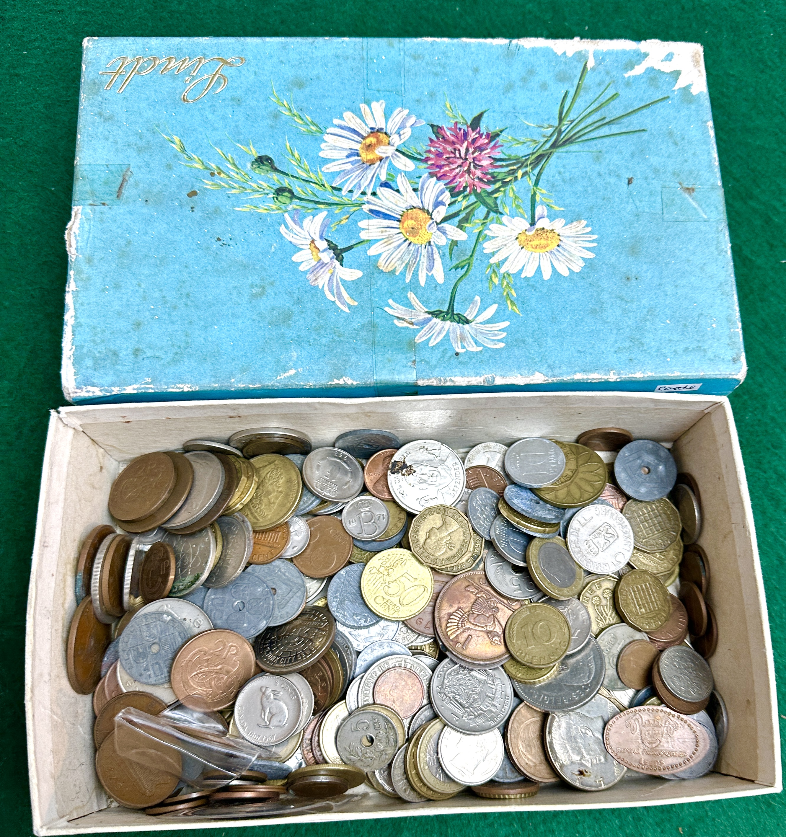 This lot comprises a large quantity of loose, mixed world coins and currency, spanning various years and nations. The collection includes coins of differing metallic compositions, such as copper, brass, and various silver-toned alloys. Visible examples suggest international origins, including a coin featuring a kangaroo (likely Australian currency) and others displaying large numerals (e.g., “50”) and foreign scripts. The coins are stored in a repurposed, heavily aged cardboard box, originally used for Lindt products, featuring a pale blue lid decorated with a printed bouquet of white and pink daisies.