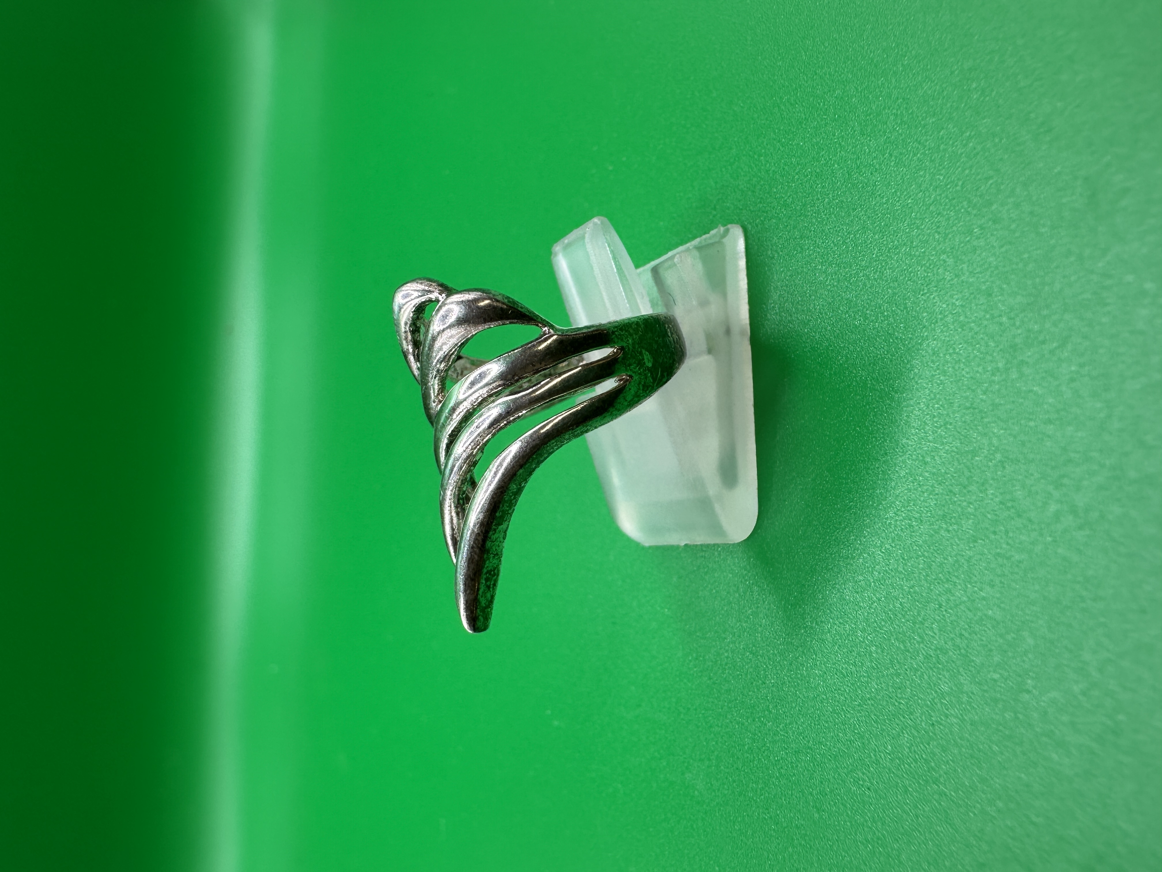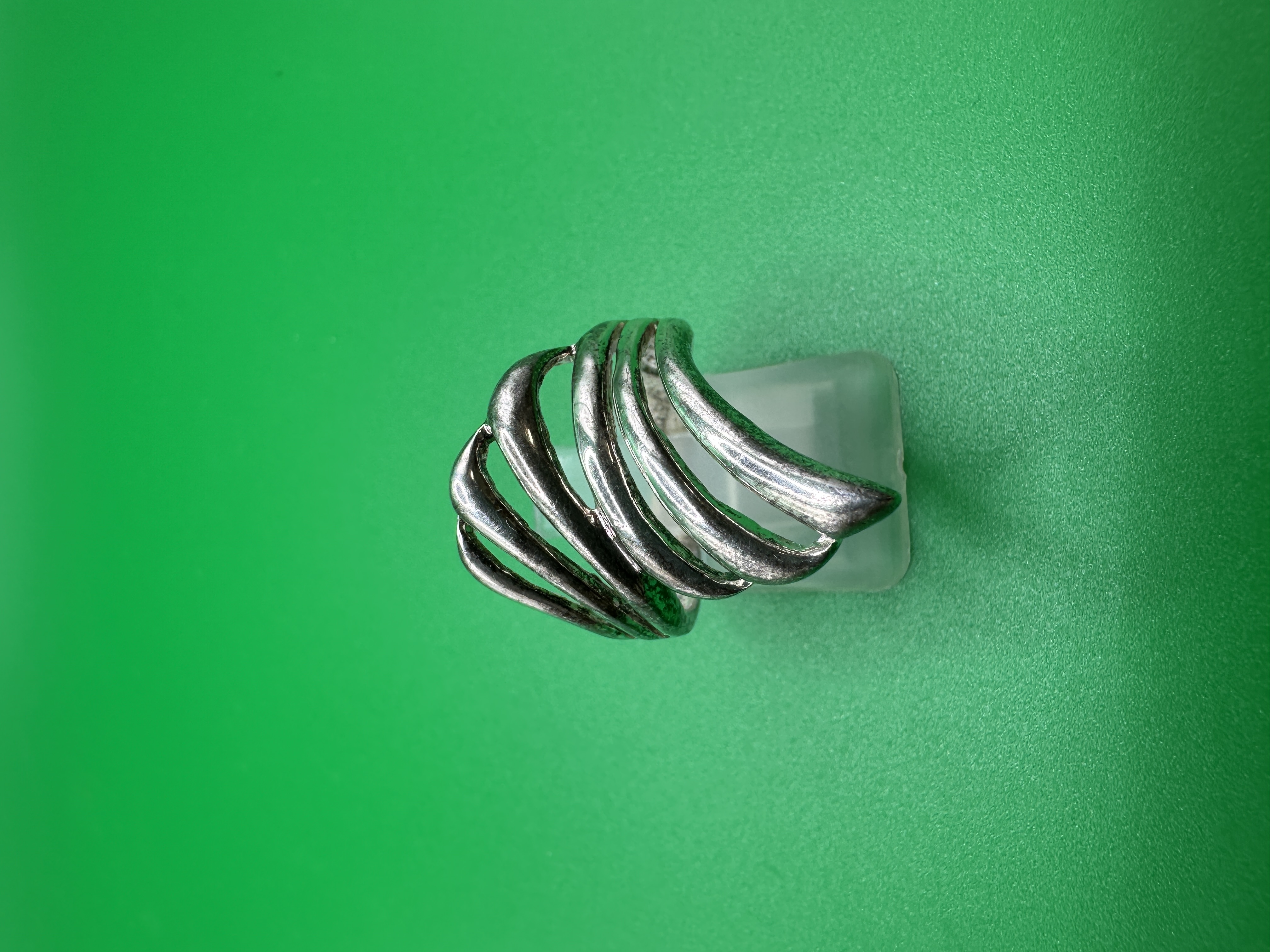 A single piece of vintage jewelry, confirmed to be constructed of 925 sterling silver. This finger ring features a striking modernist or abstract sculptural design, characterized by multiple sweeping, curved bands that converge to form an elongated, domed shield across the top of the finger. The substantial design suggests it was intended as a statement piece. No discernible manufacturer marks or hallmarks are visible.