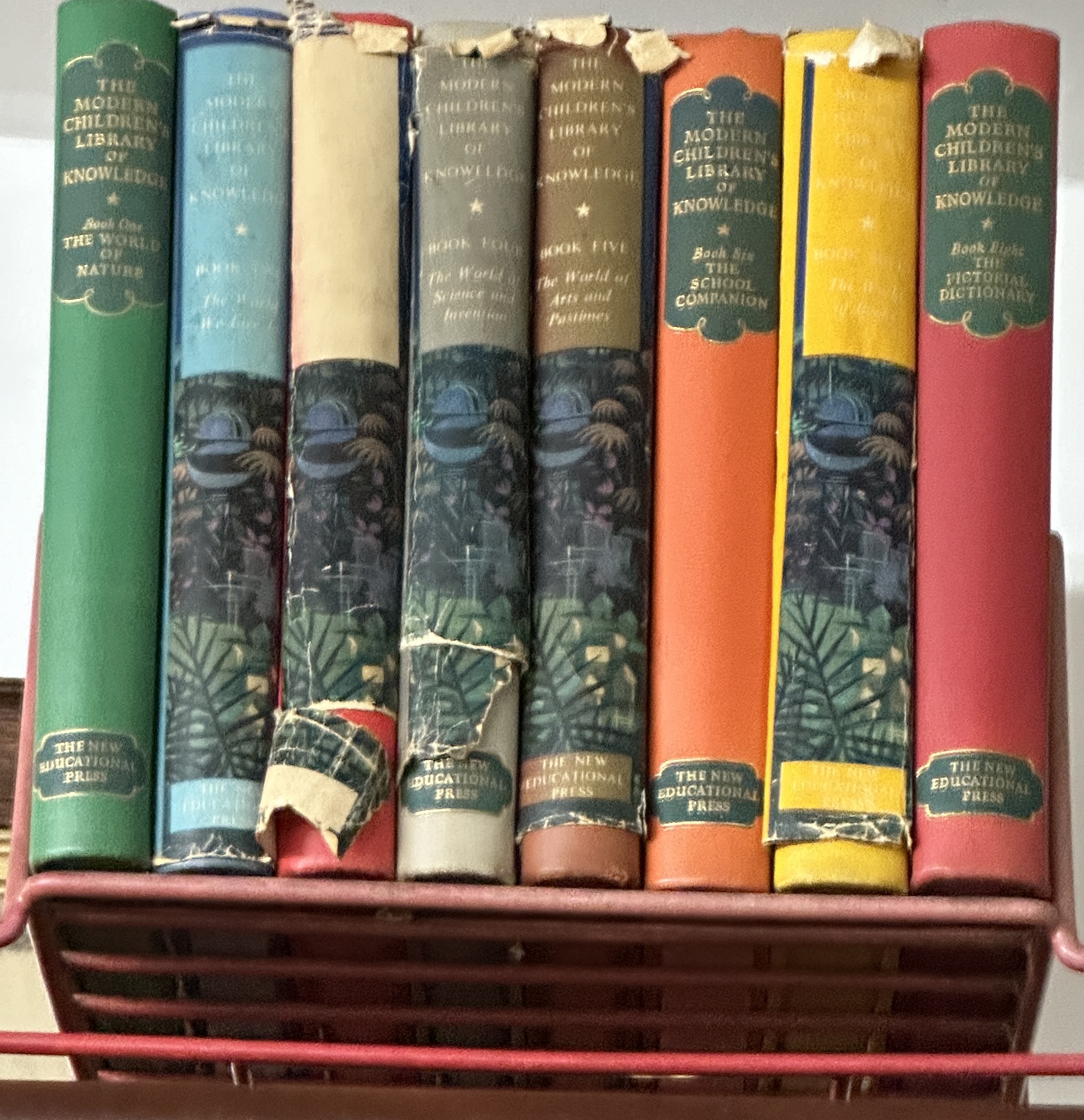 A collection of 8 hardback volumes from the encyclopedic series THE MODERN CHILDREN’S LIBRARY OF KNOWLEDGE, published by THE NEW EDUCATIONAL PRESS. The lot includes Book One (THE WORLD OF NATURE), Book Two (likely THE WORLD WE LIVE IN, light blue spine), Book Three (tan spine), Book Four (THE WORLD OF Science and Invention), Book Five (THE WORLD OF Arts and Pastimes), Book Six (THE SCHOOL COMPANION), Book Seven (yellow spine), and Book Eight (THE PICTORIAL DICTIONARY). Volumes 2, 3, 4, 5, and 7 feature a distinctive illustrated spine overlay depicting a dark, jungle-like scene centered around a blue domed object.