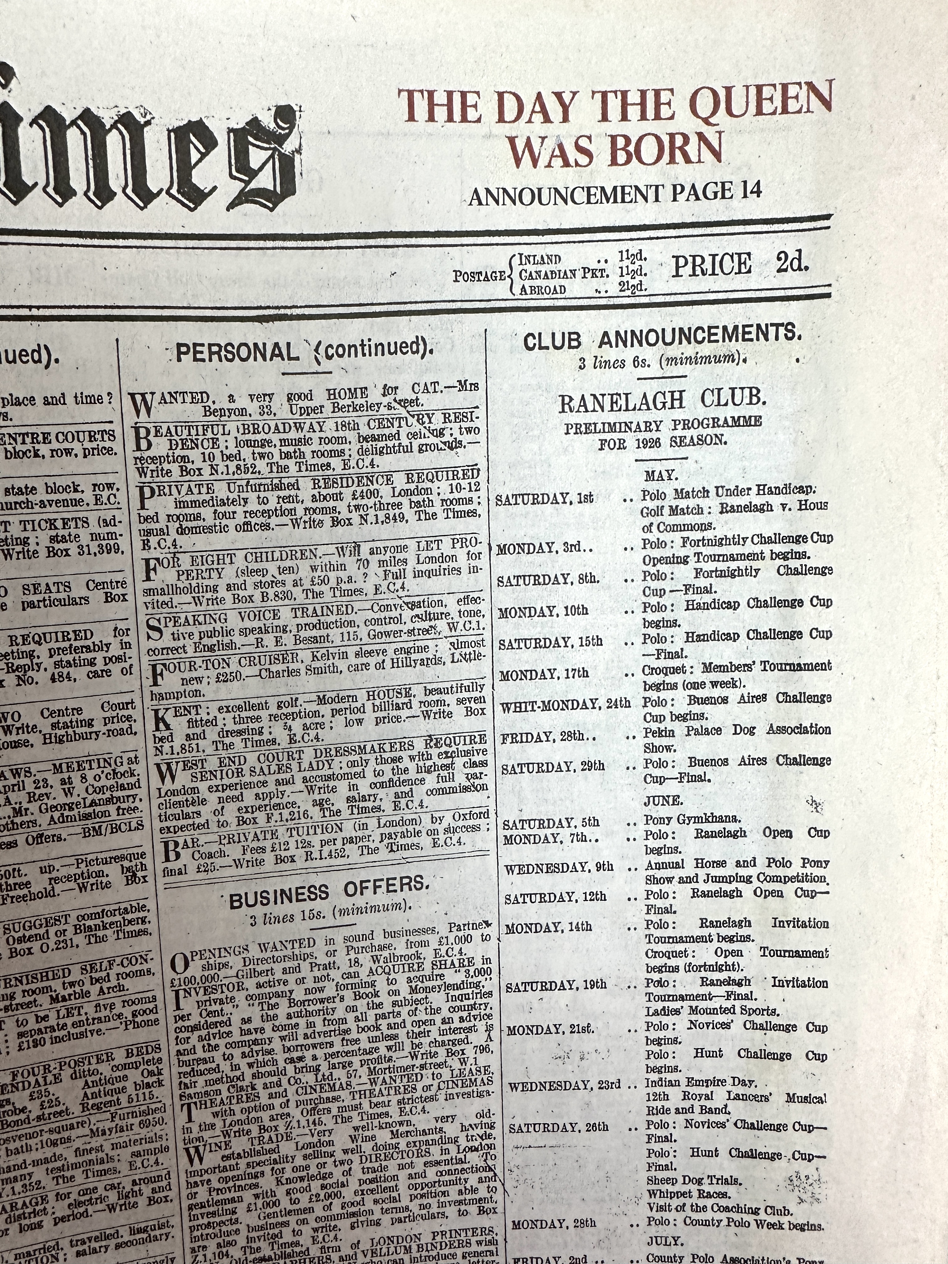 A collection of five loose British newspaper and periodical sections spanning 1916 to 1952, offering a snapshot of major historical events and social life across the decades. The most prominent item is the front page of the Sheffield Telegraph dated Thursday, February 7, 1952, featuring the headline ELIZABETH II IS PROCLAIMED The New Queen Arrives Home Today, alongside coverage of the death of King George VI. The lot also includes a section of The Daily Telegraph (Monday, September 4, referencing WWII and the formation of the War Cabinet under Churchill), a section of The Daily Mail (Friday, April 27, 1923, featuring a large advertisement for Philmead Tennis Rackets), a small clipping of the Family Herald (July 8, 1916, advertising Beecham’s Pills), and a section of The Times classifieds (likely May 1928).