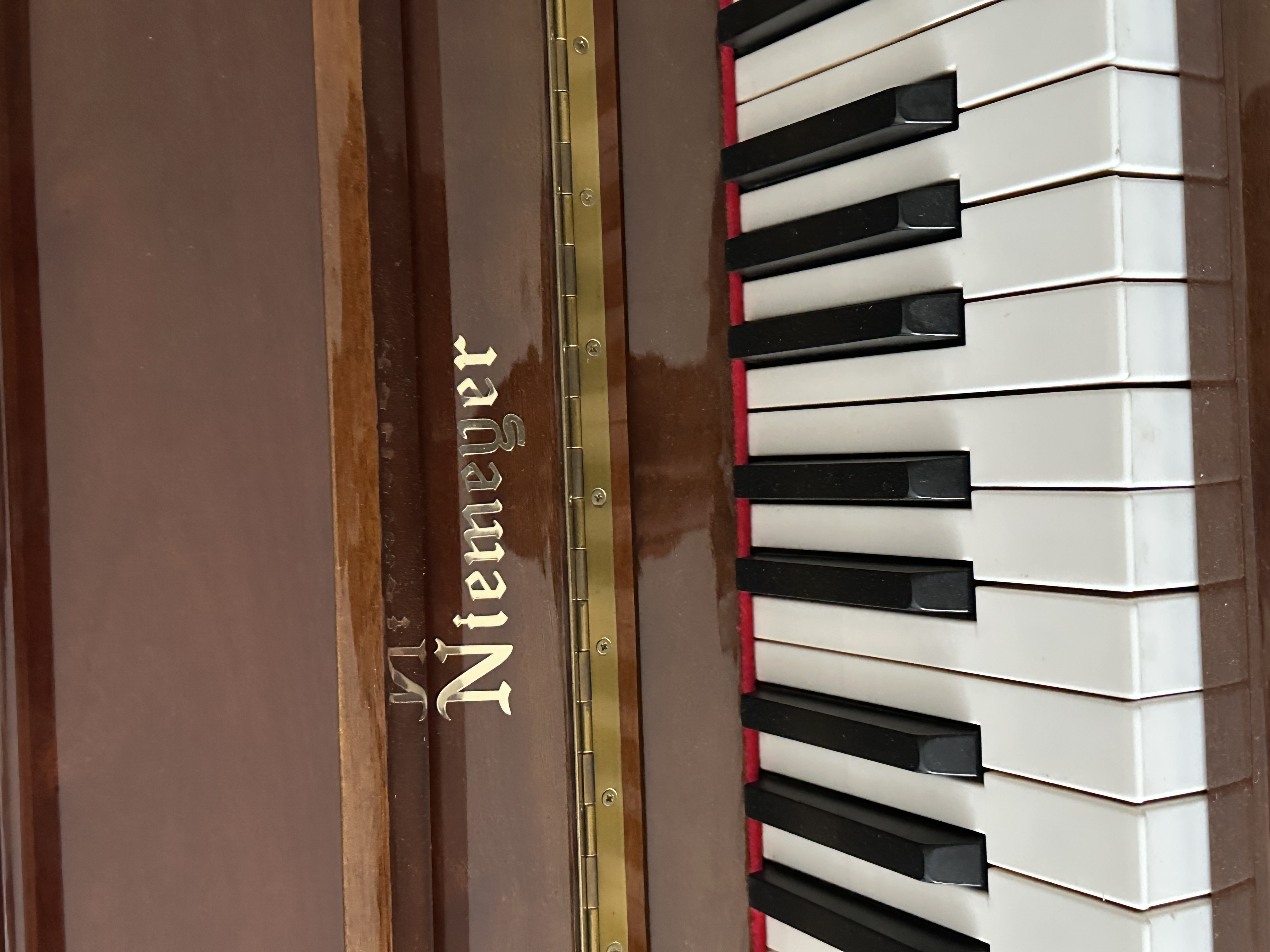 A handsome Niemeuer upright piano featuring a standard 88-key keyboard and presented in a dark reddish-brown, high-gloss polished wood finish. The Niemeuer brand name is inscribed in gold lettering above the keys. The internal mechanism appears intact, featuring copper-wound bass strings and a standard hammer action system. The lot includes one matching double piano bench constructed of the same dark wood, designed to seat two individuals. The piano and bench together form a complete musical instrument lot.
