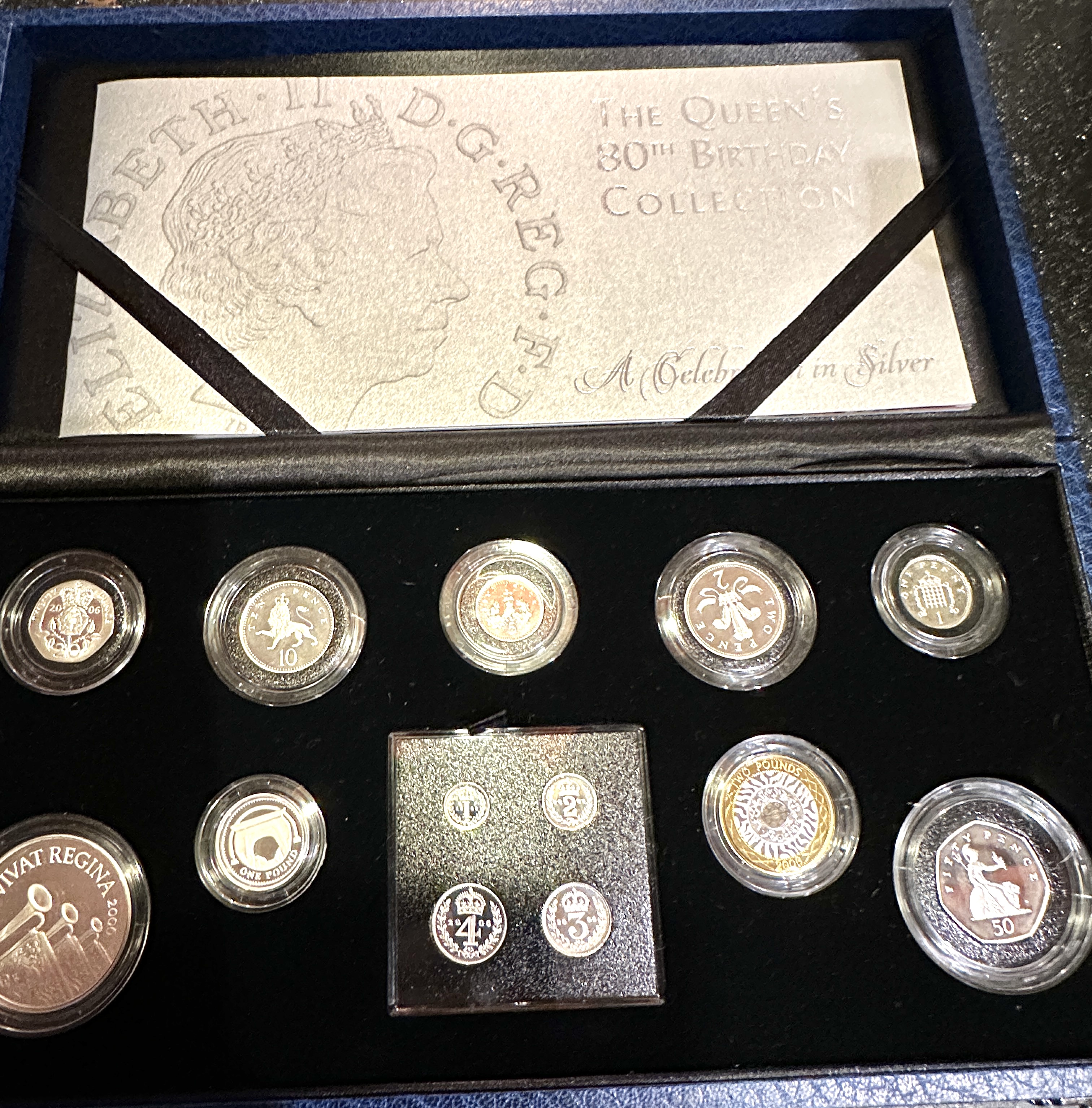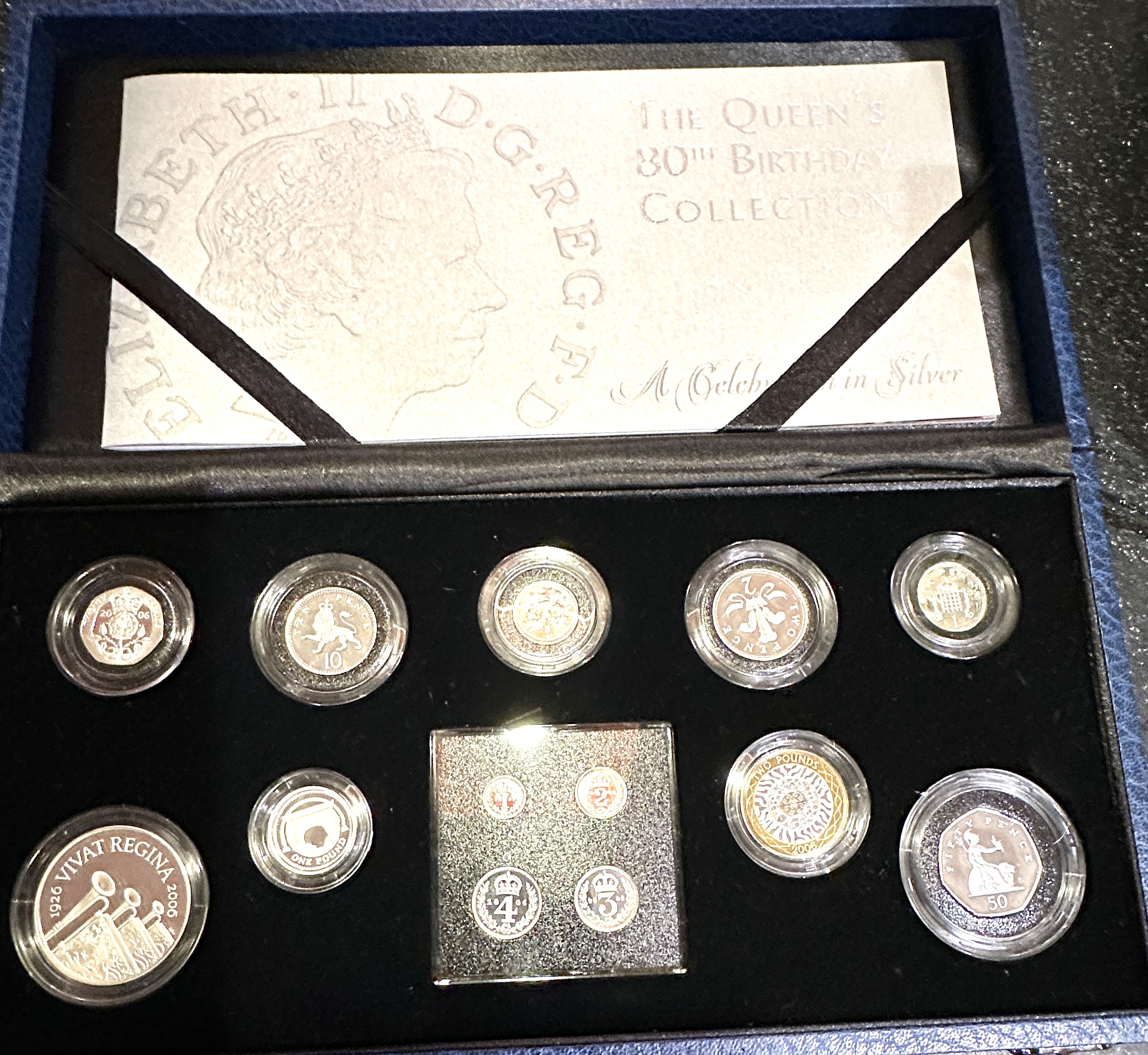 This lot comprises The Queen’s 80th Birthday Collection, issued in 2006 to commemorate the 80th anniversary of Her Majesty Queen Elizabeth II. The set is confirmed to be struck in 925 silver, presented in a dark blue leatherette-style case with silver-toned text inlay. The collection includes a full set of circulating denominations alongside larger commemorative pieces, including the dual-metal One Pound coin and a large coin bearing the inscription VIVAT REGINA. The collection is explicitly marketed as A celebration in silver and the coins are individually encapsulated and set into a velvet-lined interior.