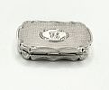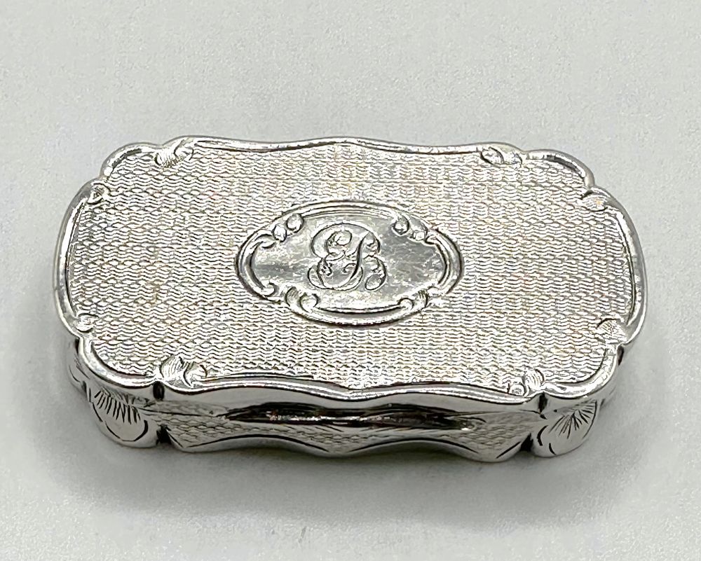 This item is an antique sterling silver vinaigrette box, confirmed to be constructed of 925 silver. The box features a hinged lid and a rectangular form with scalloped edges. The exterior surfaces are decorated with a fine, repetitive engine-turned geometric pattern. The lid is centered by an oval cartouche bearing a clear script monogram, the initial B. The interior contains a dark lining material and a removable, pierced silver grille, typical of a vinaigrette used to hold scented material. Hallmarks are present on the interior rim, confirming the metal standard and regulatory details of manufacture.
