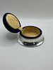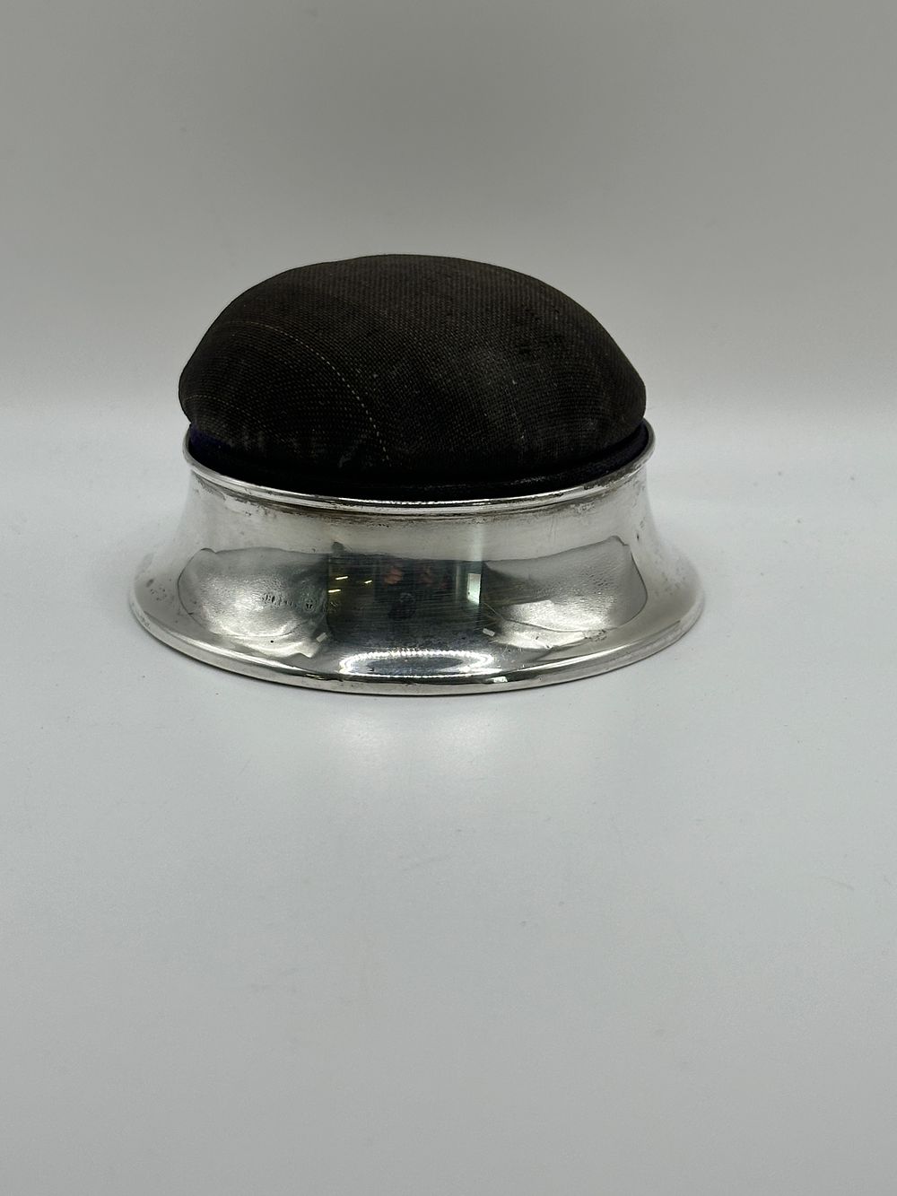 This lot presents a decorative and functional antique item, constructed from verified 925 sterling silver. The piece features a flared, circular base and a hinged lid topped with a dark fabric pincushion. When opened, the lid reveals a small storage compartment, typically used for holding small vanity items, hatpins, or rings. The overall design is characteristic of period silver smalls.