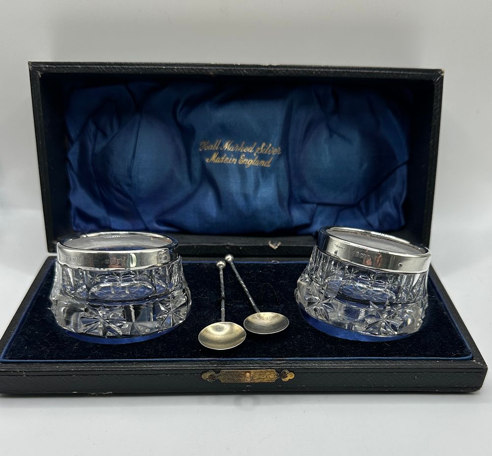This lot comprises a cased pair of antique or vintage salt cellars, featuring heavily faceted cut crystal glass bodies mounted with confirmed 925 sterling silver rims. The set includes two small matching 925 silver spoons. The items are presented in their original fitted presentation box, which features a black exterior and a deep blue velvet and satin lining, bearing the legend Real Hall-Marked Silver Made in England. The design is typical of Edwardian or early 20th-century English silver goods and is sold as a complete set.