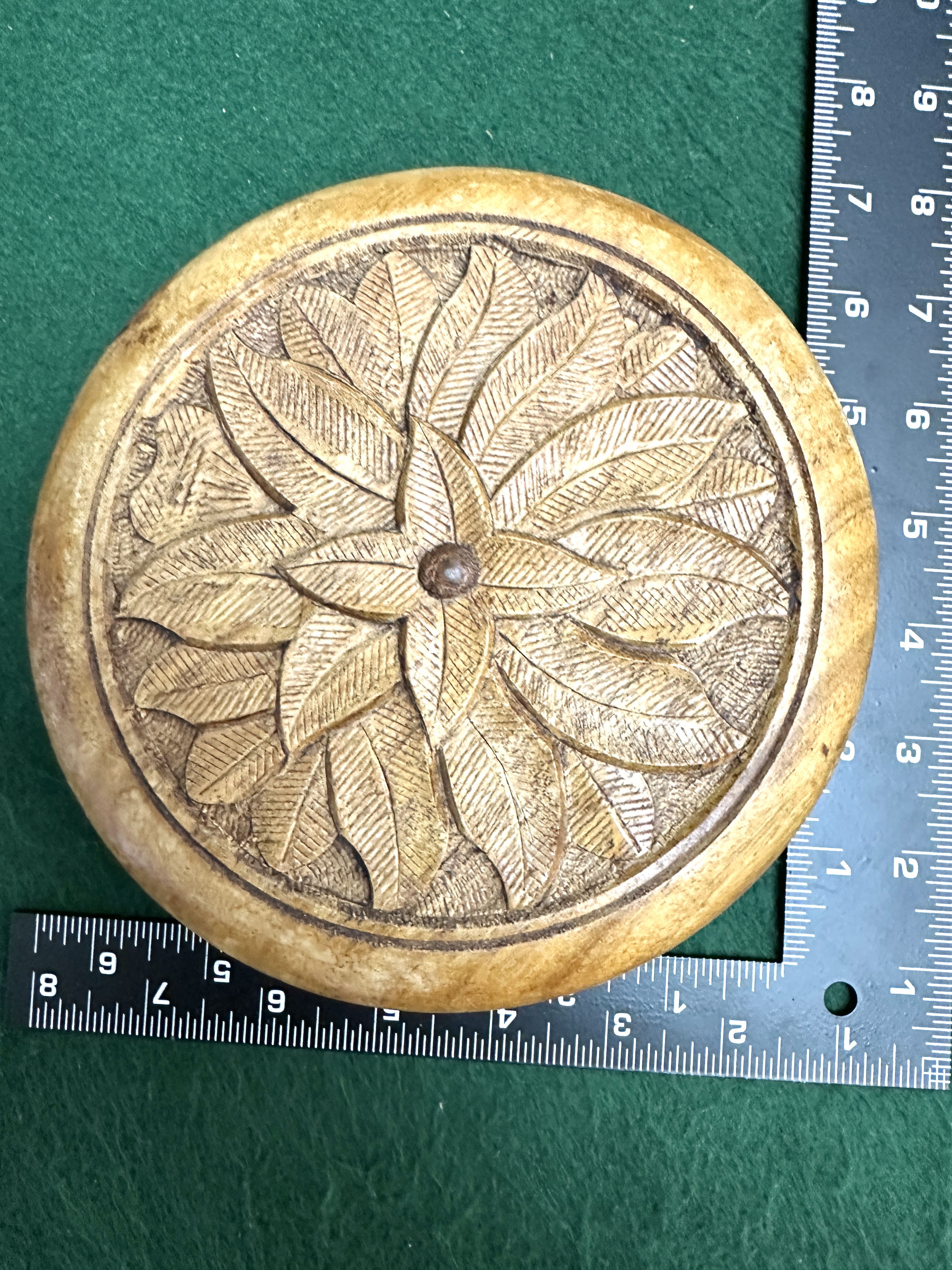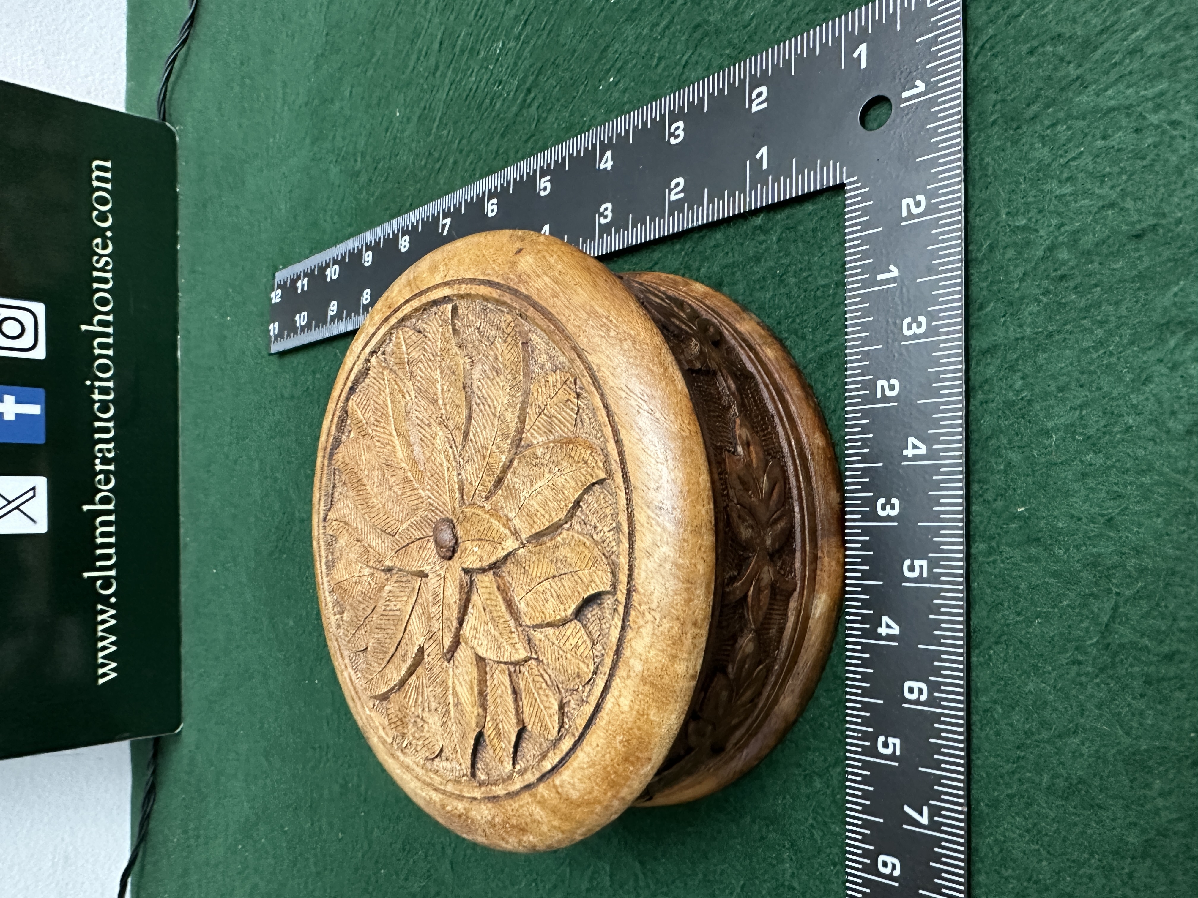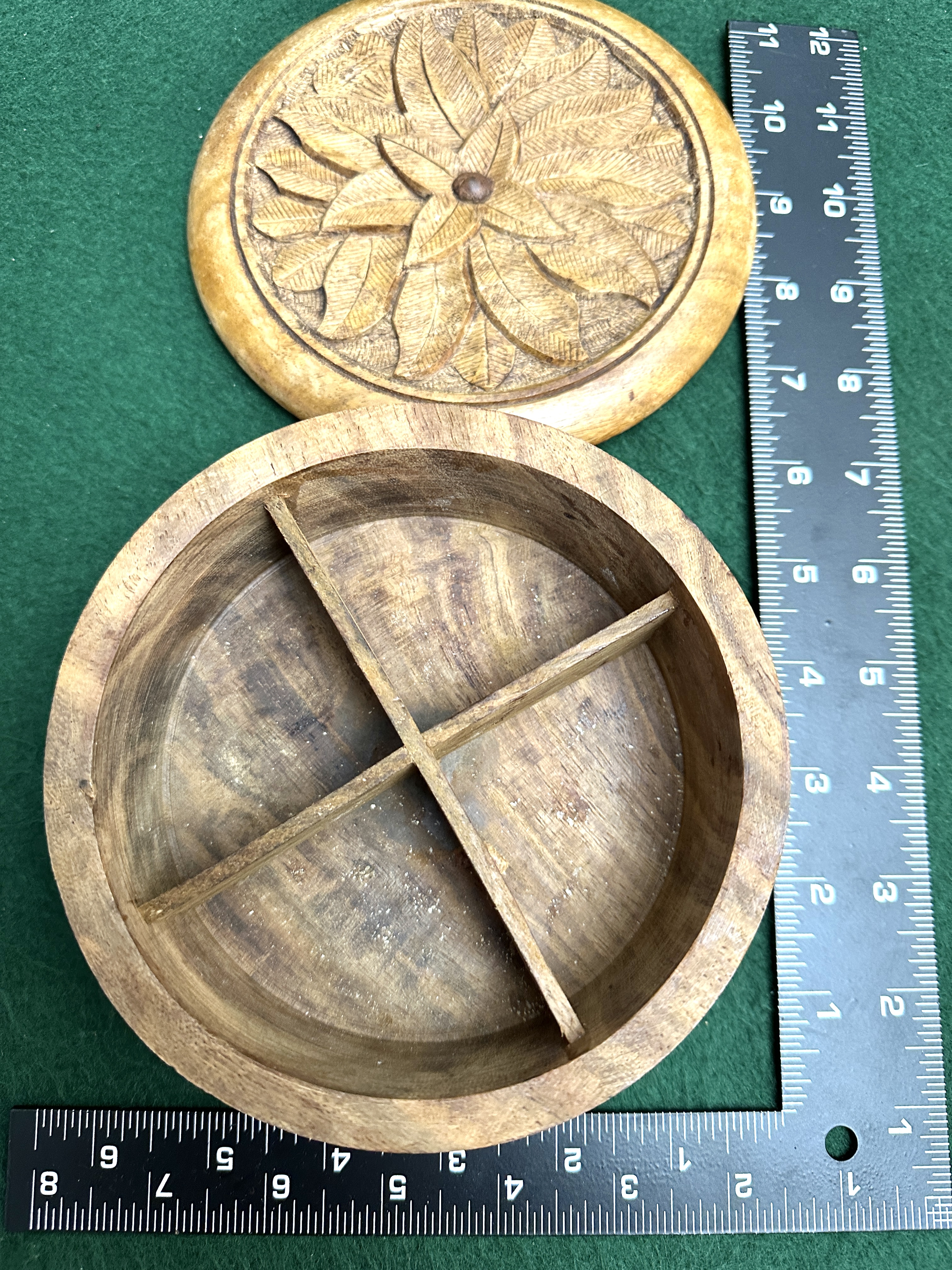 A vintage hand-carved circular wooden box, approximately 5 inches in overall diameter. The box is constructed of light hardwood, exhibiting natural variations in wood grain and color. The tightly fitting lid features a deep, detailed relief carving depicting a stylized floral or starburst design, centered by a small metal tack. The body of the box is slightly darker than the lid. The interior of the box is divided into four equally sized compartments by thin wooden strips, suitable for storing jewelry, trinkets, or small collectibles.