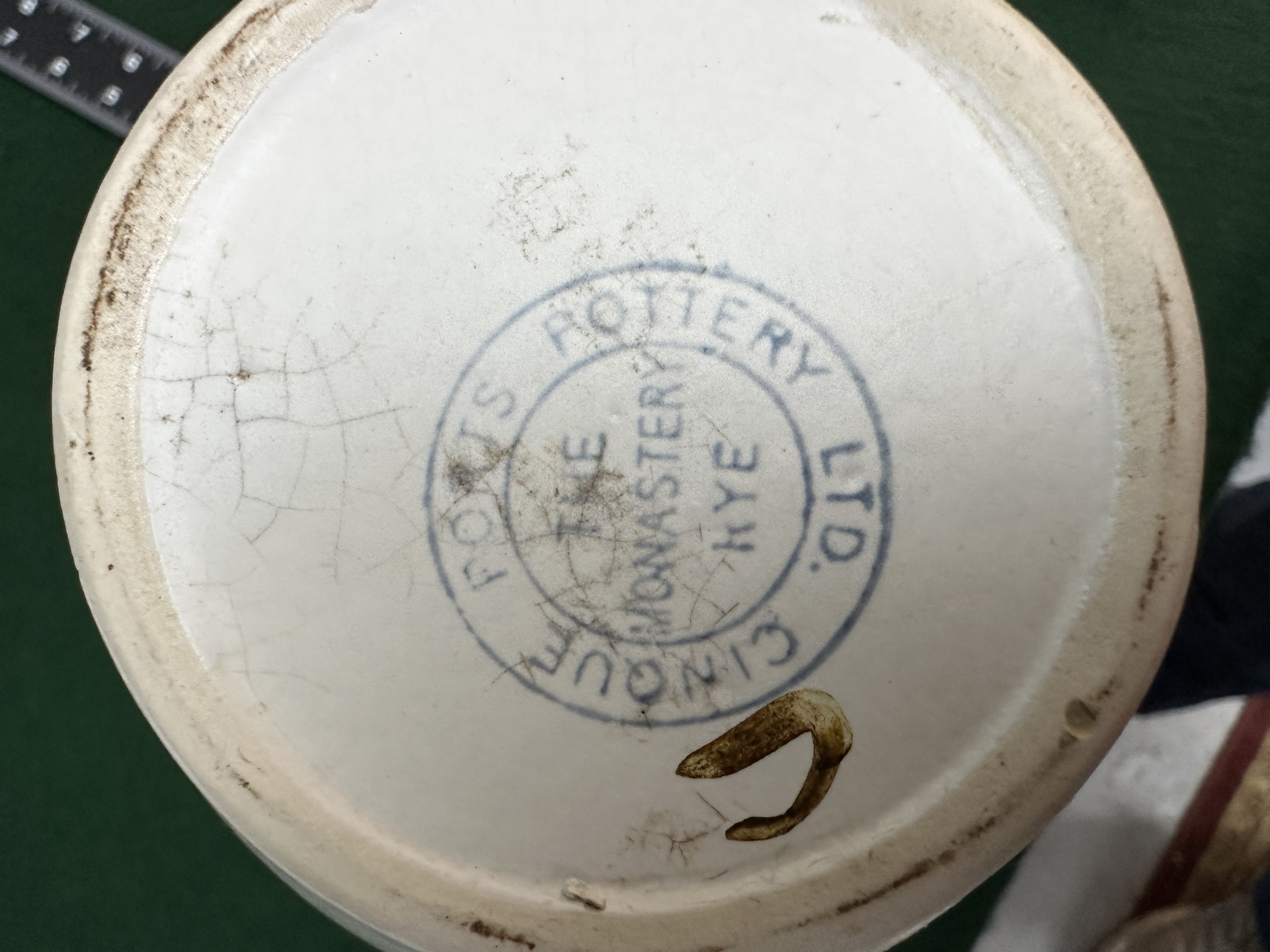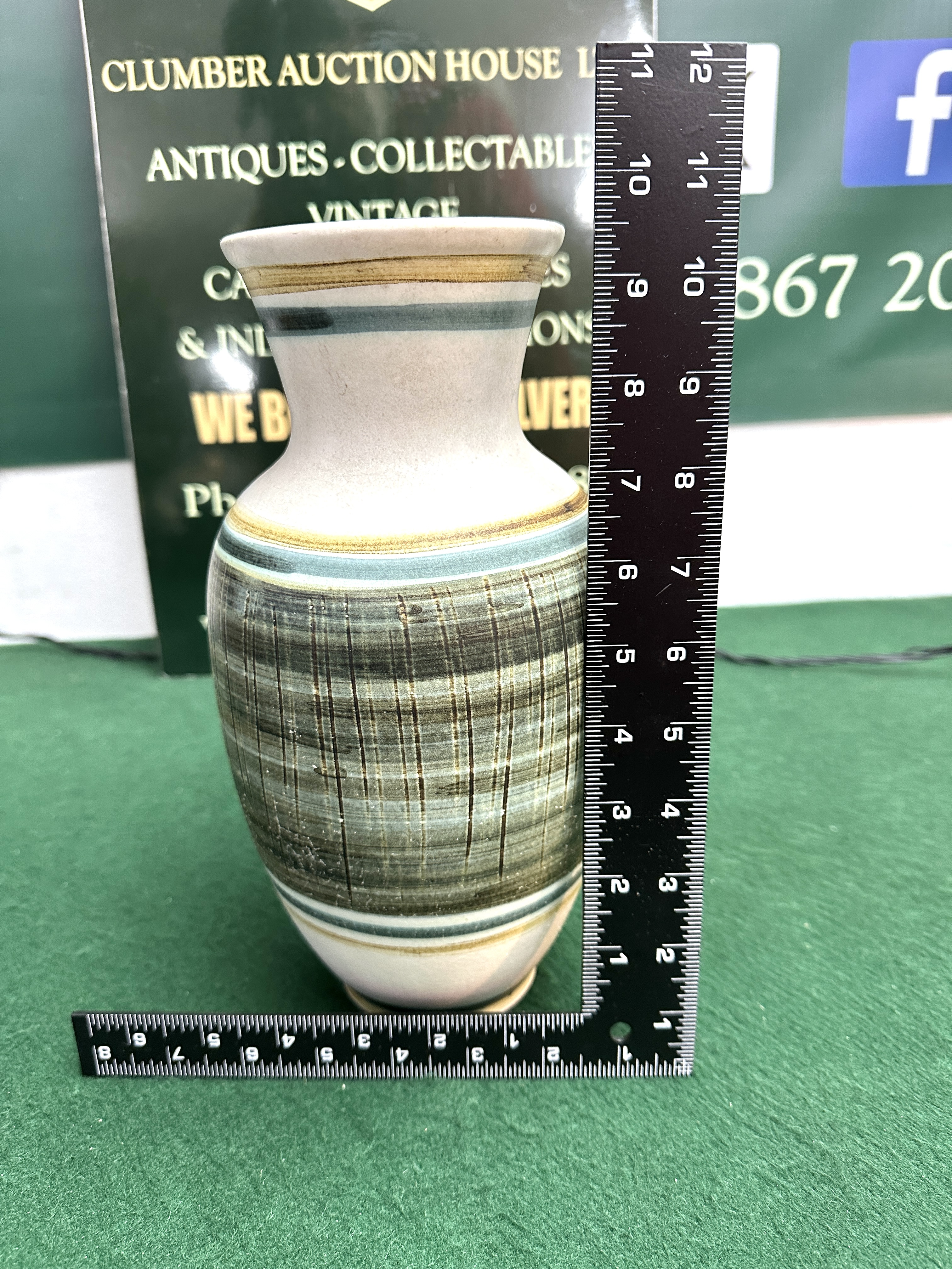 This is a single vintage art pottery vase produced by Cinque Ports Pottery Ltd. at The Monastery, Rye, England. The tapered, bulbous form stands approximately 7.5 inches tall. The design features a multi-banded, minimalist aesthetic, consisting of pale beige/off-white upper and lower sections separated by thin ochre/yellow-gold accent rings. The central body is decorated with a deep teal/blue-green and khaki glaze featuring a scored or incised grid pattern. The base bears the definitive circular blue manufacturer’s stamp: CINQUE PORTS POTTERY THE MONASTERY RYE LTD.