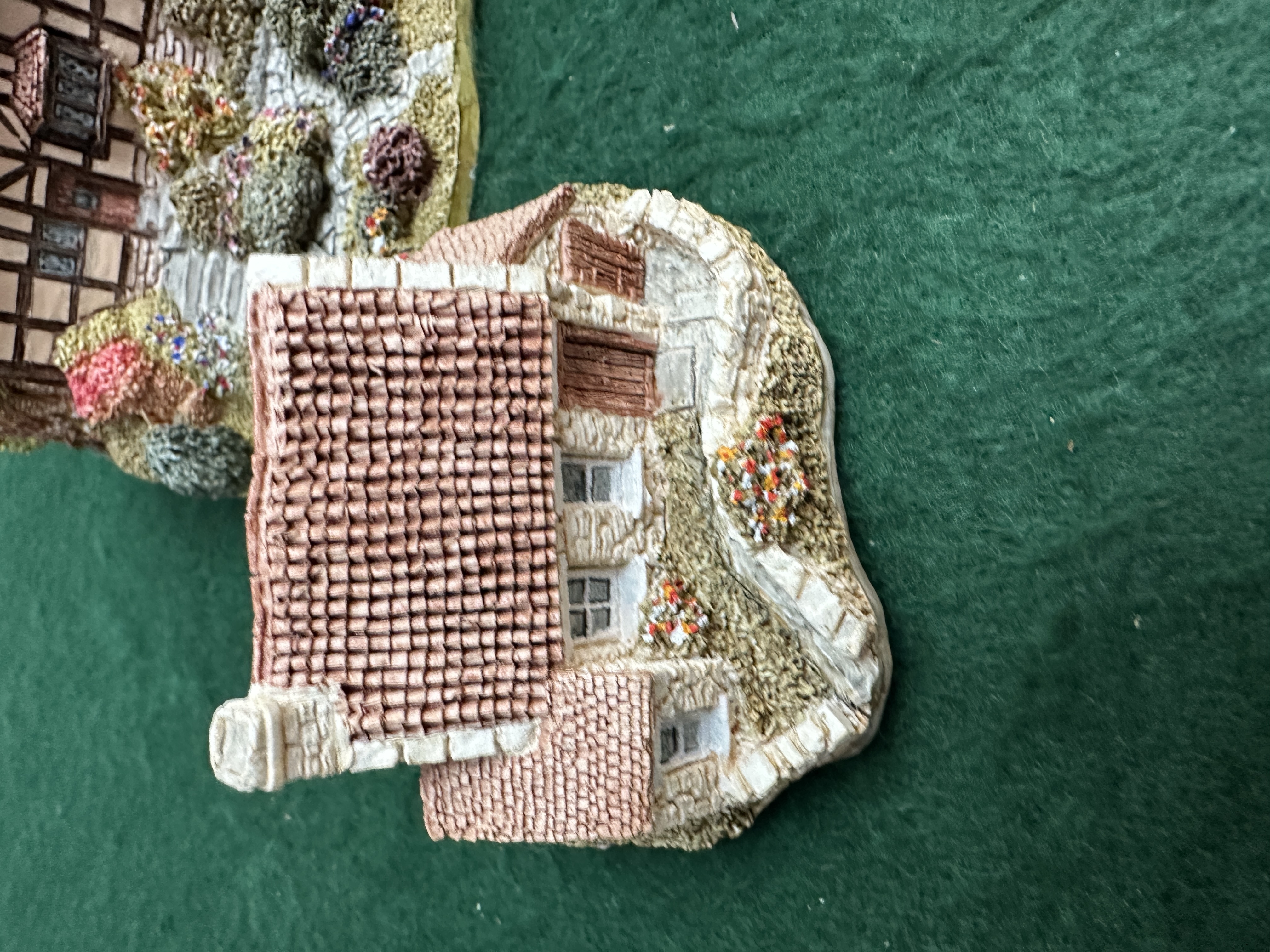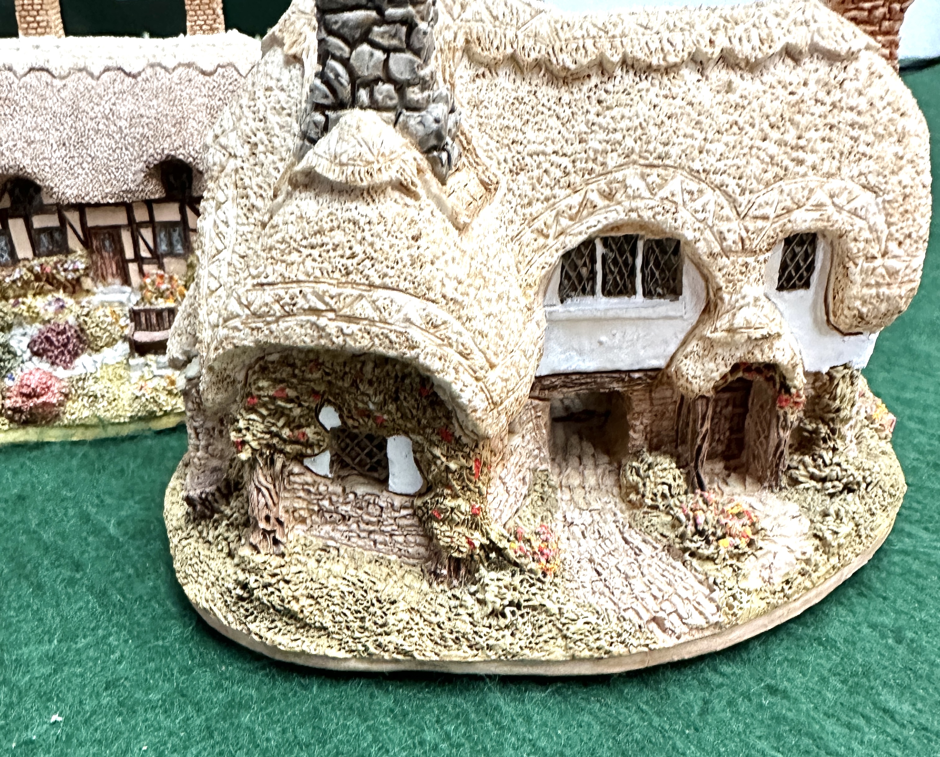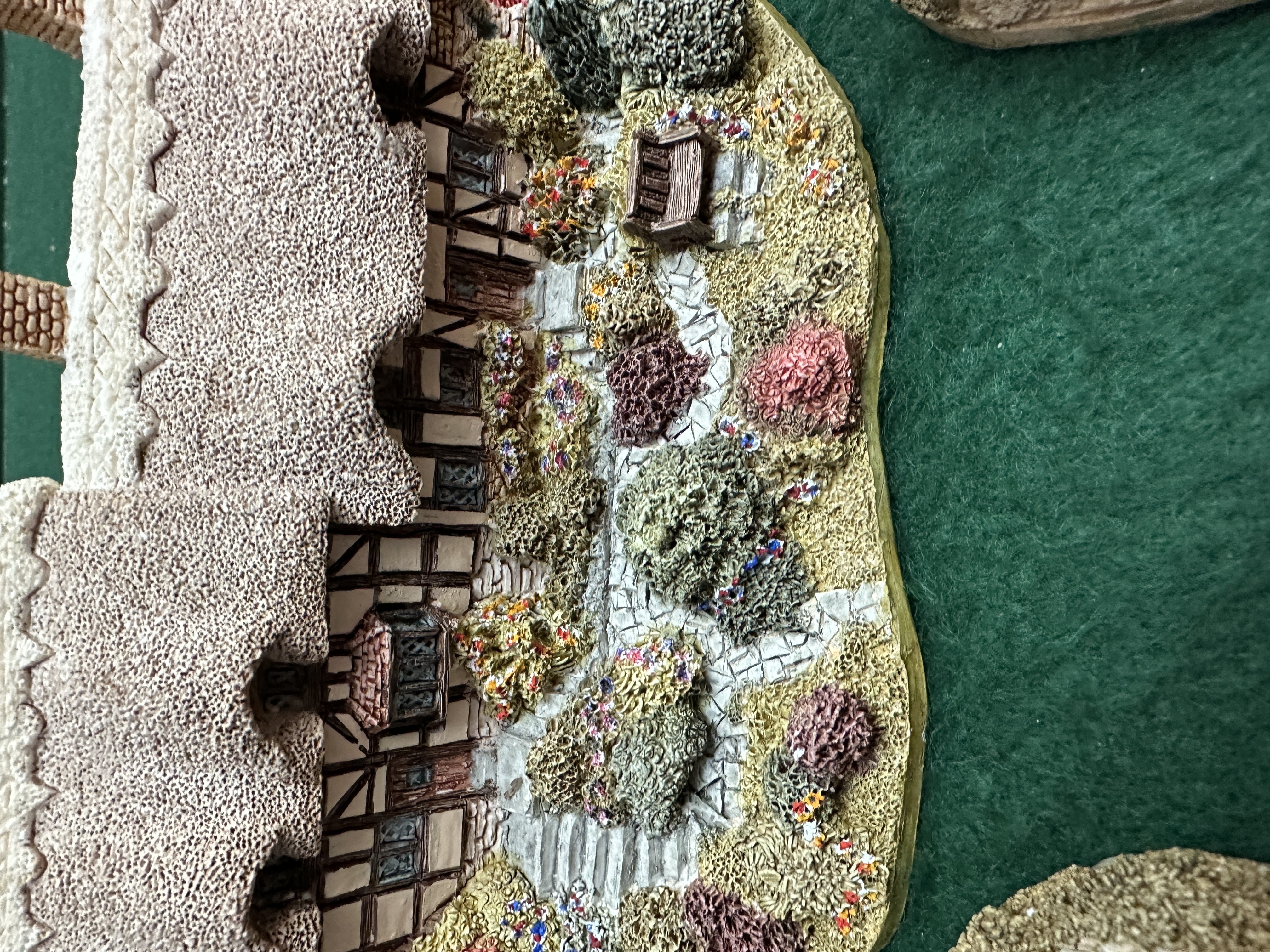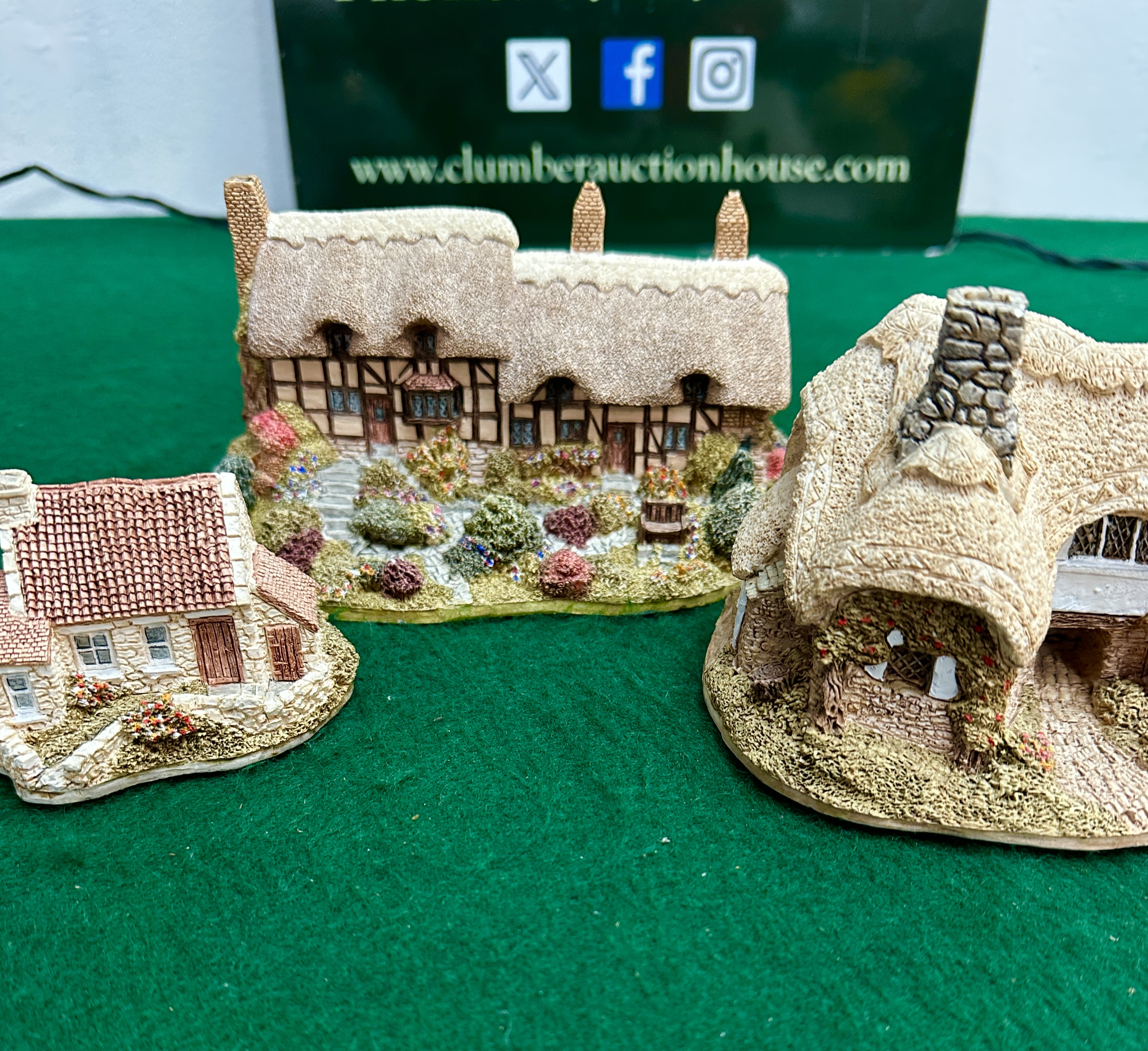 This lot features three (3) highly detailed miniature collectible cottages, attributed to the style and quality of Lilliput Lane or similar English manufacturers such as David Winter. The pieces are constructed from molded resin or plaster and feature extensive hand-painted details, including thatched and tiled roofs, stonework, timber framing, and elaborate miniature gardens. The collection includes three distinct models: a smaller stone cottage with a reddish tiled roof, a medium-sized cottage featuring a heavily textured thatched roof and prominent stone chimney, and a larger Tudor-style long house, which strongly matches the identified model Lilliput Lane Ostlers Keep. These pieces are classic examples of English country architecture collectibles often sought after by miniature enthusiasts.