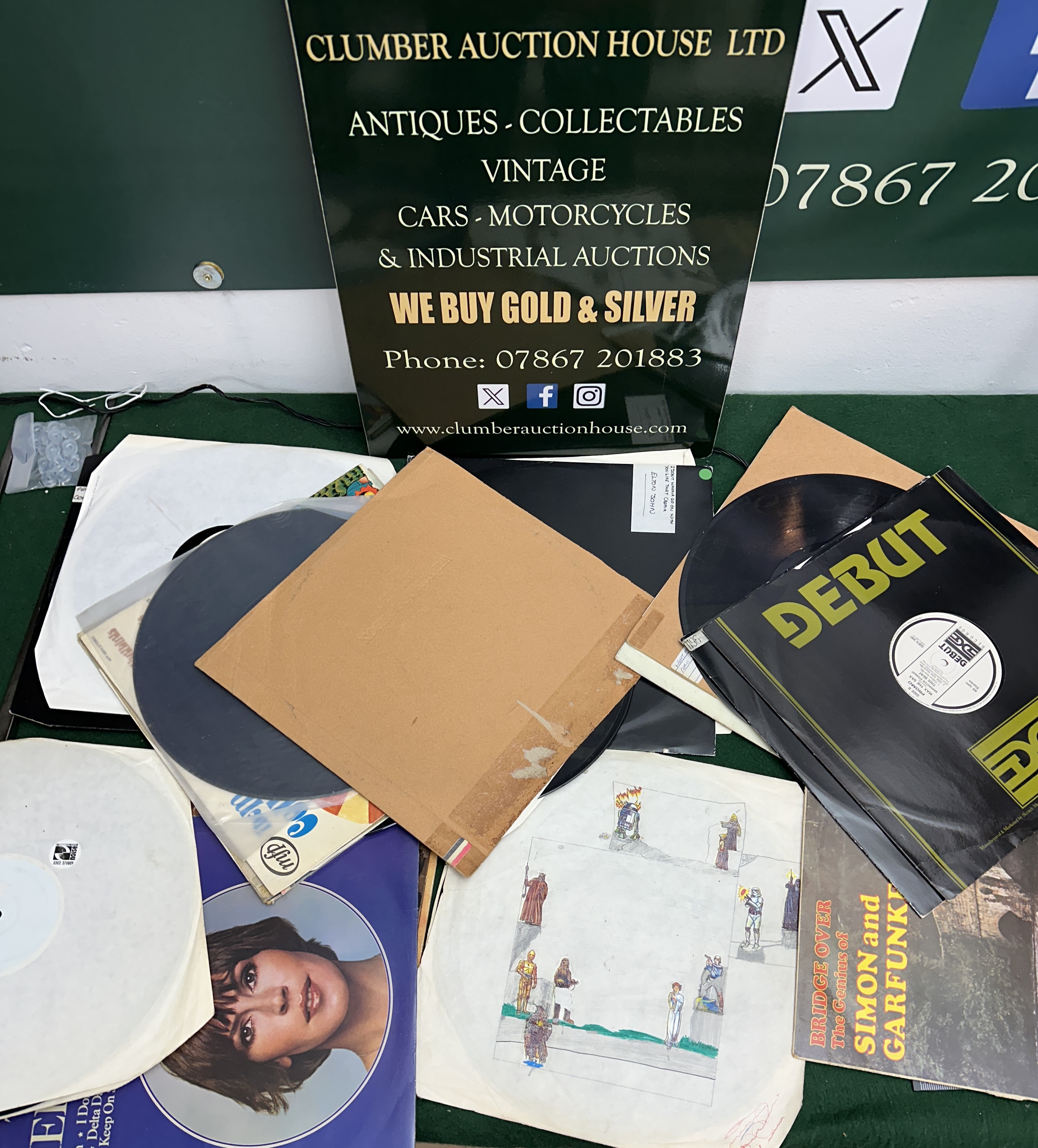 A collection of 12 assorted vinyl records, 12-inch singles, and LP jackets spanning various genres and artists. The lot includes a promotional 12-inch single by Max The Wax on Debut Edge Records, a sleeve with a handwritten label identifying an Elton John track (“I DON’T WANNA GO ON WITH YOU LIKE THAT CROWN”), and an LP jacket titled “BRIDGE OVER The Genius of SIMON and GARFUNKEL.” A unique component is a plain white sleeve featuring amateur, hand-colored artwork depicting multiple characters from the Star Wars franchise, including C-3PO, a Stormtrooper, Darth Vader, and R2-D2. The collection consists primarily of 12-inch records and sleeves.