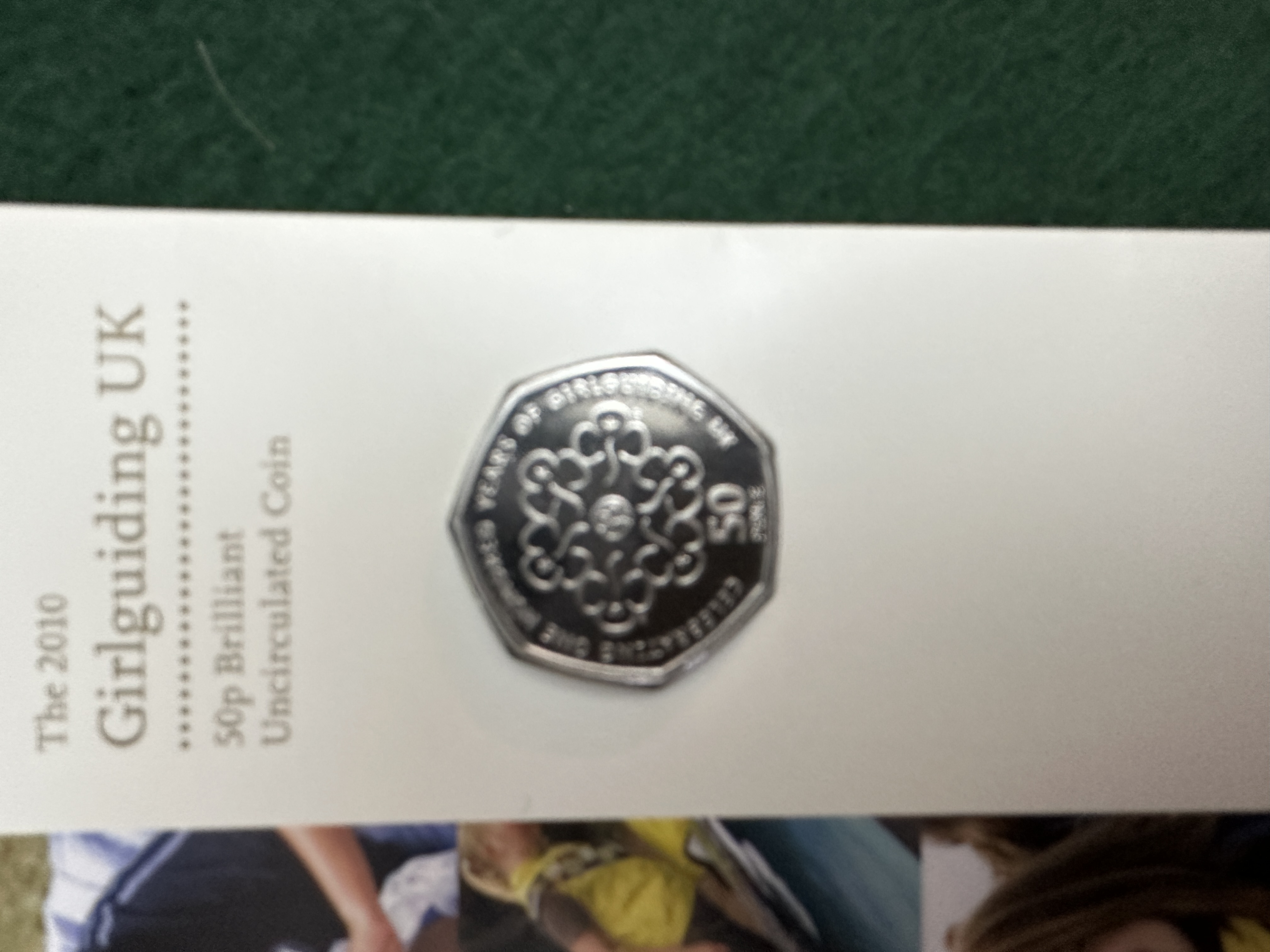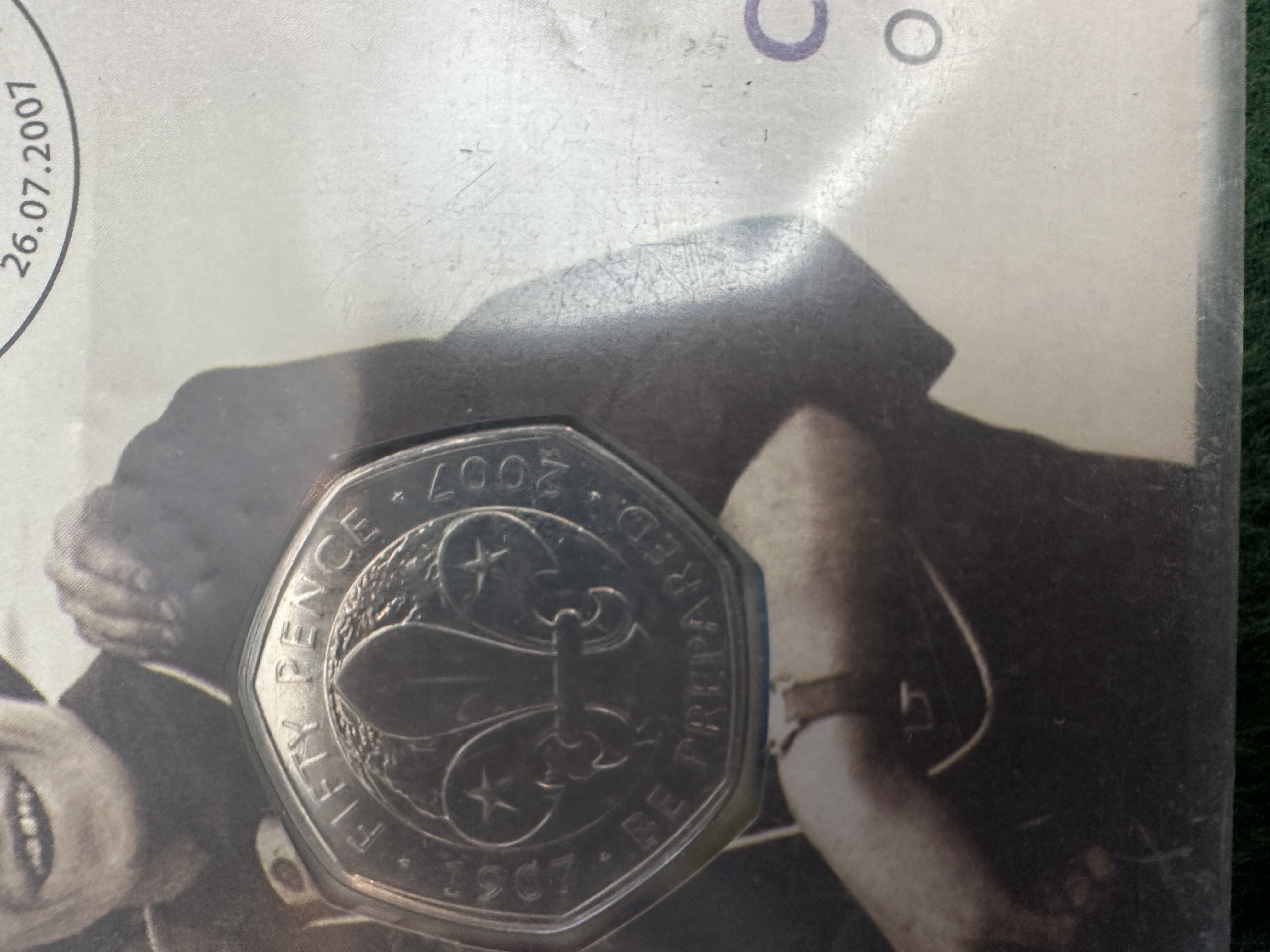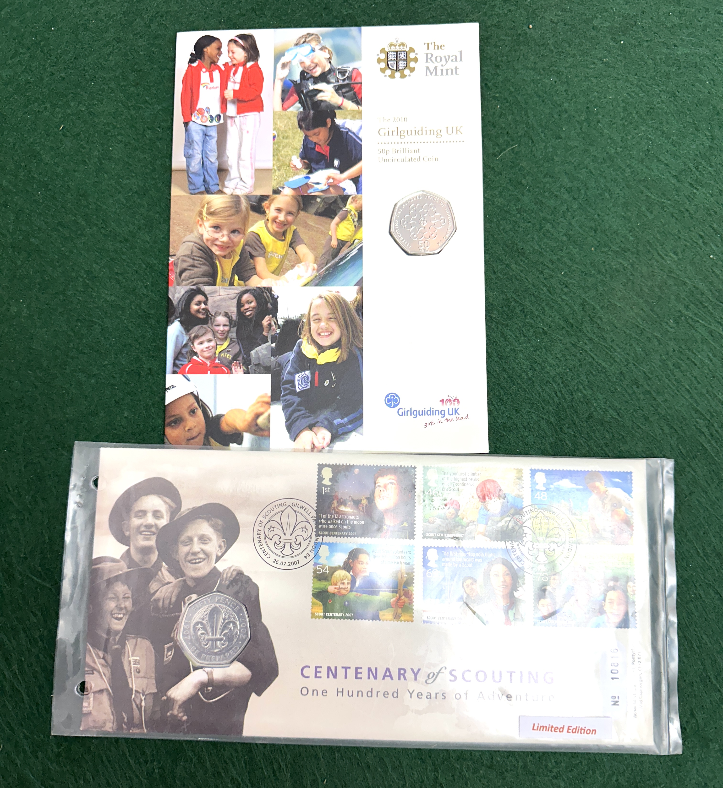 This lot comprises two distinct British commemorative presentation packs, totaling two folders, two coins, and five stamps. The first item is the 2010 Royal Mint Girlguiding UK 50p Brilliant Uncirculated Coin Pack, featuring a 50 pence coin with a repeating clover design celebrating the organization. The second item is a 2007 Centenary of Scouting Limited Edition Presentation Cover, numbered 1025, celebrating “One Hundred Years of Adventure.” This cover contains a second 50p coin depicting the Fleur-de-lis scout symbol and the motto “Be Prepared,” alongside five affixed UK postage stamps/labels ranging from 2p to 62p, all bearing a clear circular postmark dated 26.07.2007.