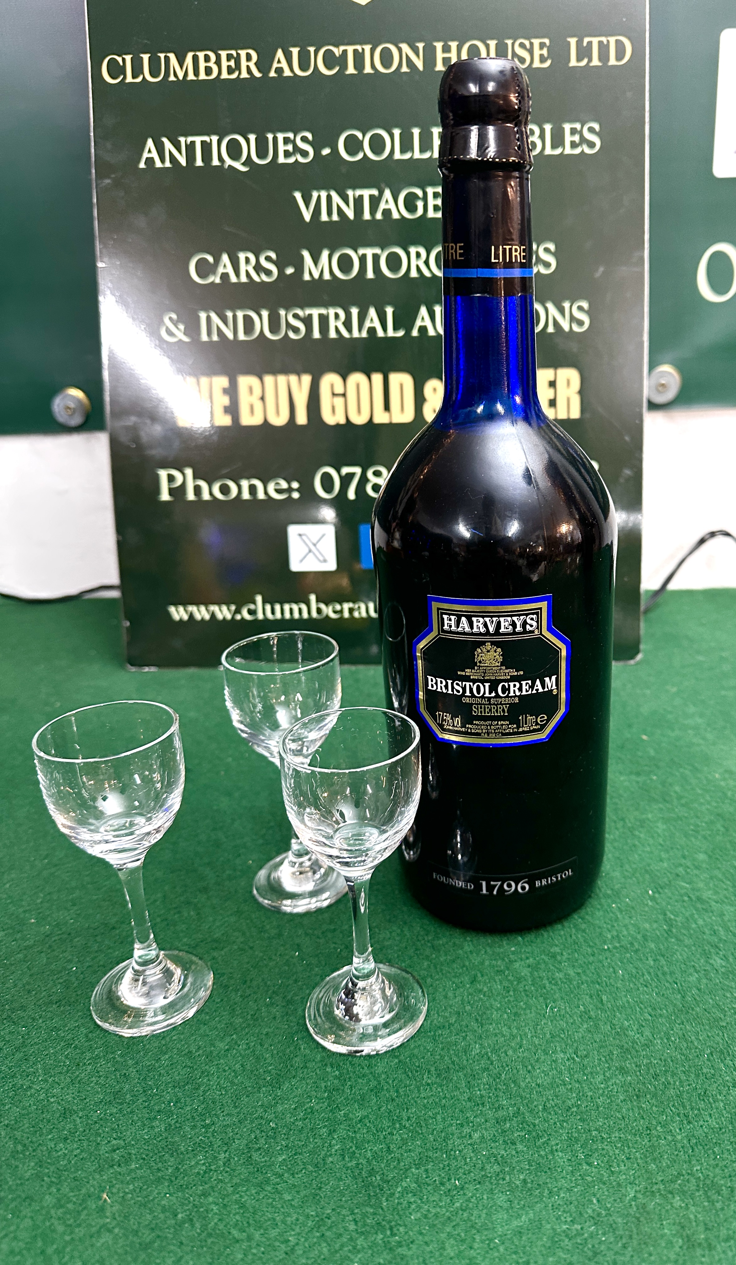 A collection of four items, comprising one sealed bottle of Harveys Bristol Cream Fine Old Pale Sherry and three accompanying stemmed glassware items. The bottle is constructed of dark cobalt blue glass, sealed with a black capsule, and features a primary blue and gold label. The label confirms the contents as Harveys Bristol Cream, 13.0% vol alcohol, and specifies a capacity of 1 Litre. The neck features a horizontal blue band inscribed with LITRE. The lower body of the bottle is embossed with the text FOUNDED 1796 BRISTOL. The three accompanying glasses are clear, small, stemmed glassware, uniform in design, suitable for sherry or liqueur service.
