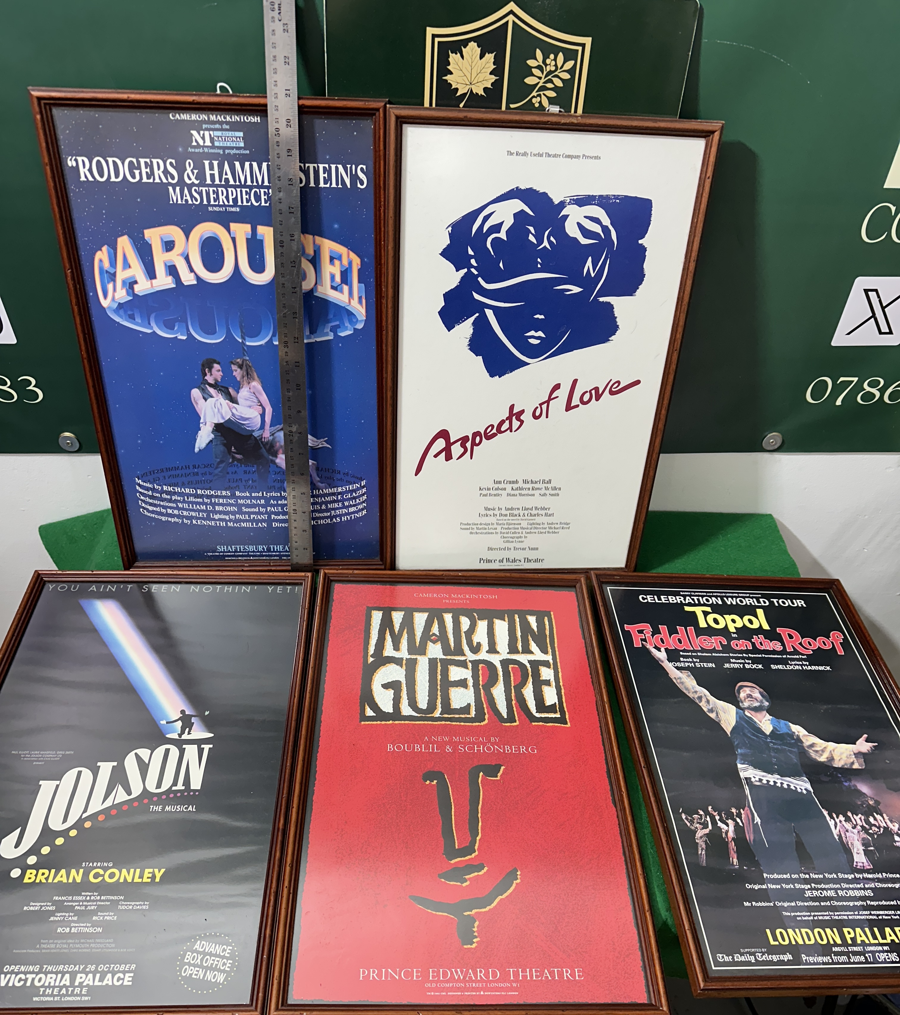 This lot offers a collection of five framed promotional posters for major West End musical productions, primarily associated with Cameron Mackintosh and The Really Useful Theatre Company. The selection includes highly recognizable titles such as Carousel, Aspects of Love, and Martin Guerre. Each poster is mounted within a matching dark wood-effect frame, presenting the items ready for display. The posters feature key production details including theatre locations and principal cast members or creators.