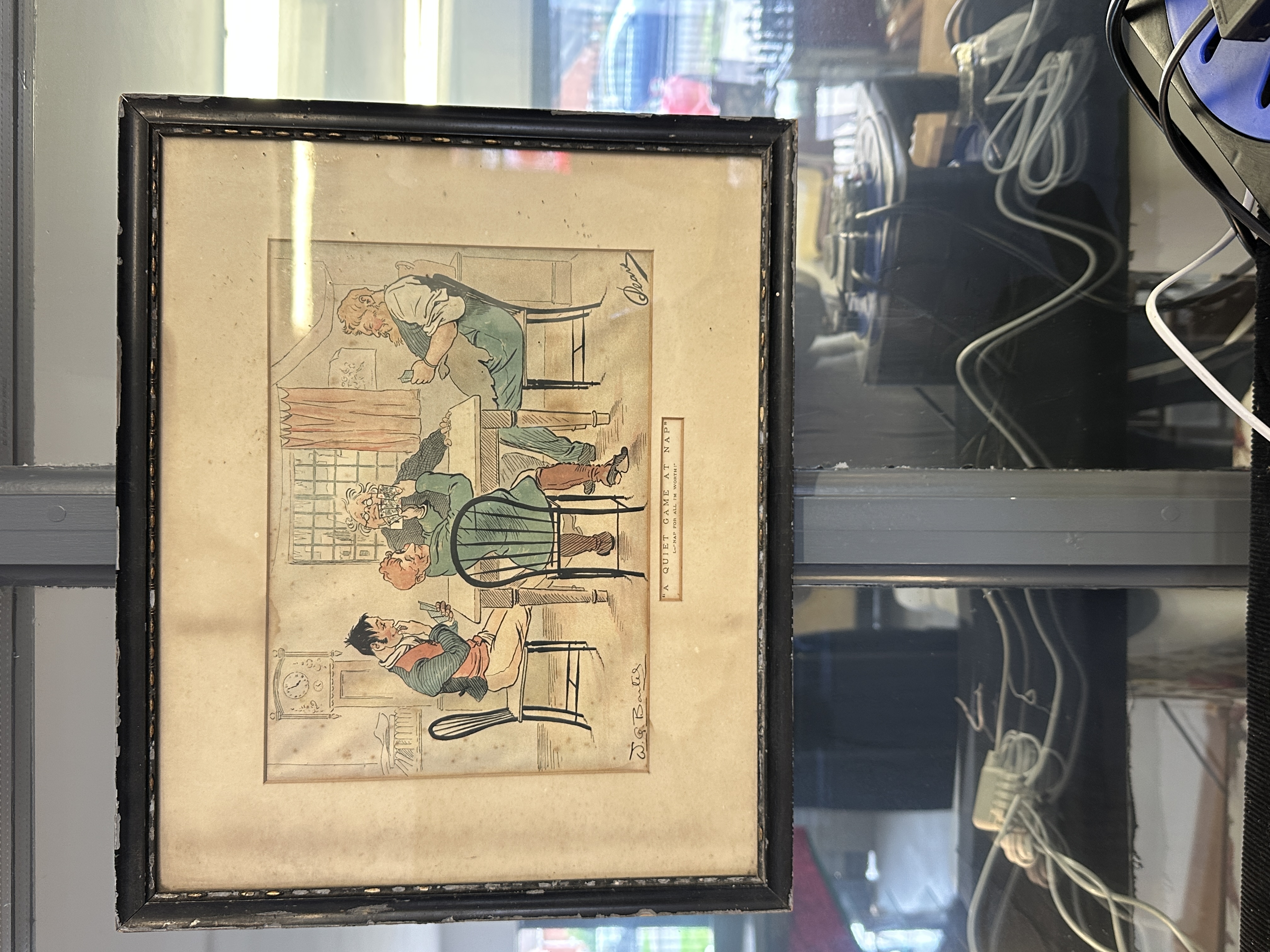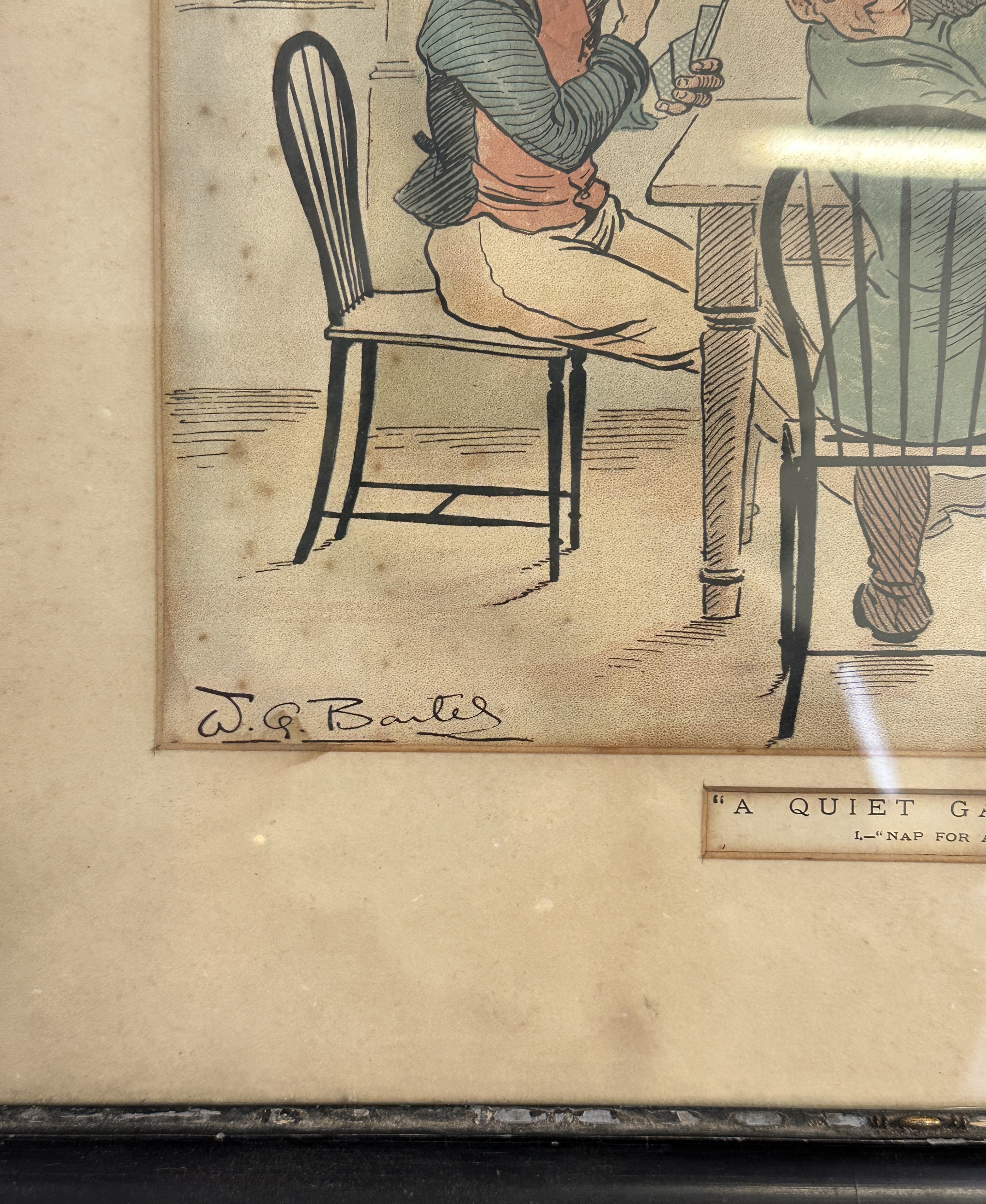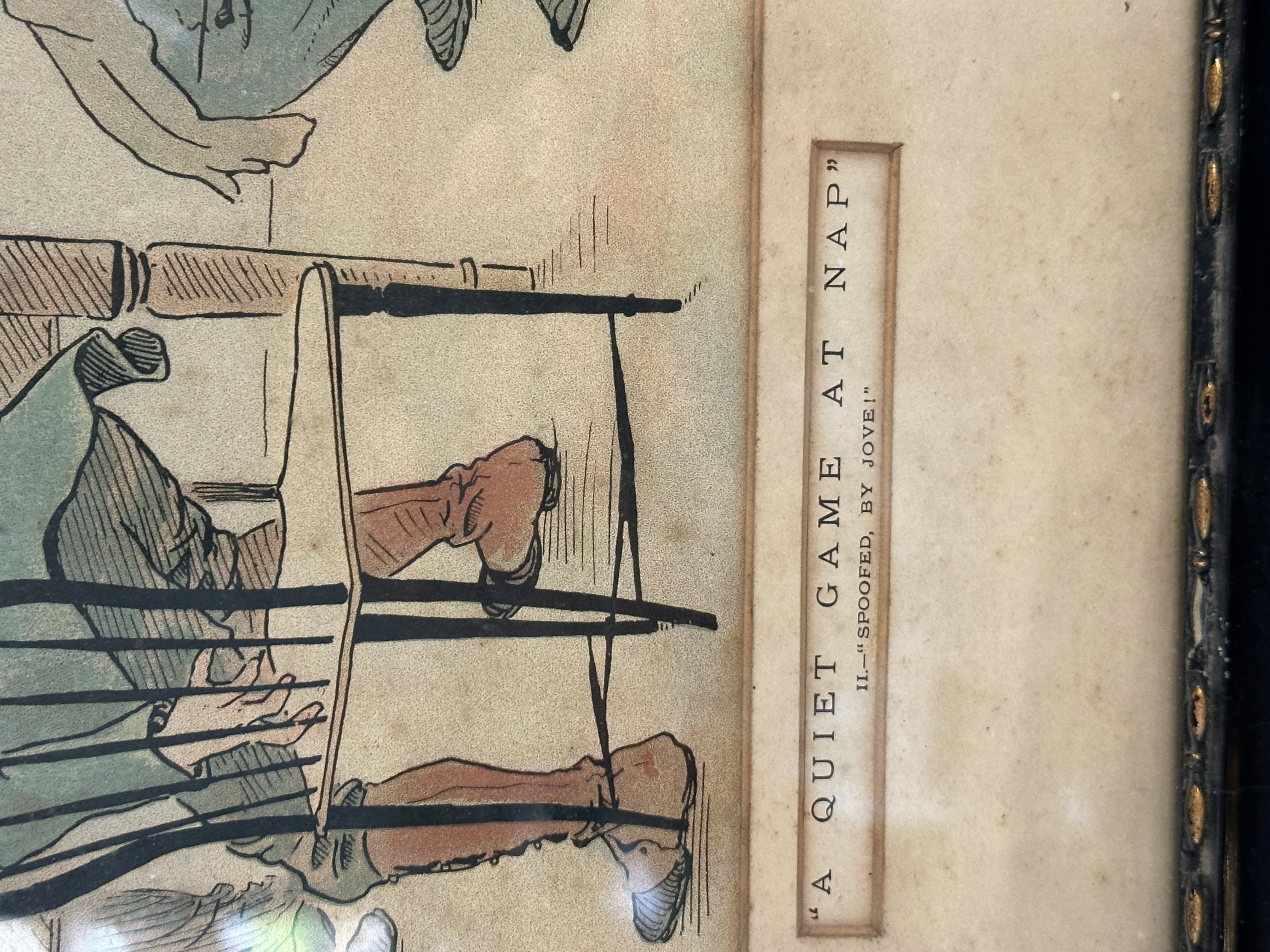 This lot comprises a pair of framed prints or engravings, titled A Quiet Game at Nap, after the work of W. G. Baxter. The illustrations depict scenes from the card game Napoleon (Nap), with one print titled ‘NAP FOR ALL IT’S WORTH!!’ and the other ‘SPOOFED, BY JOVE!’. The works are presented in matching dark wooden frames, likely original to the pieces, and feature hand-colouring over the line work. The signatures of W. G. Baxter and Pears are visible on the lower corners of the prints.