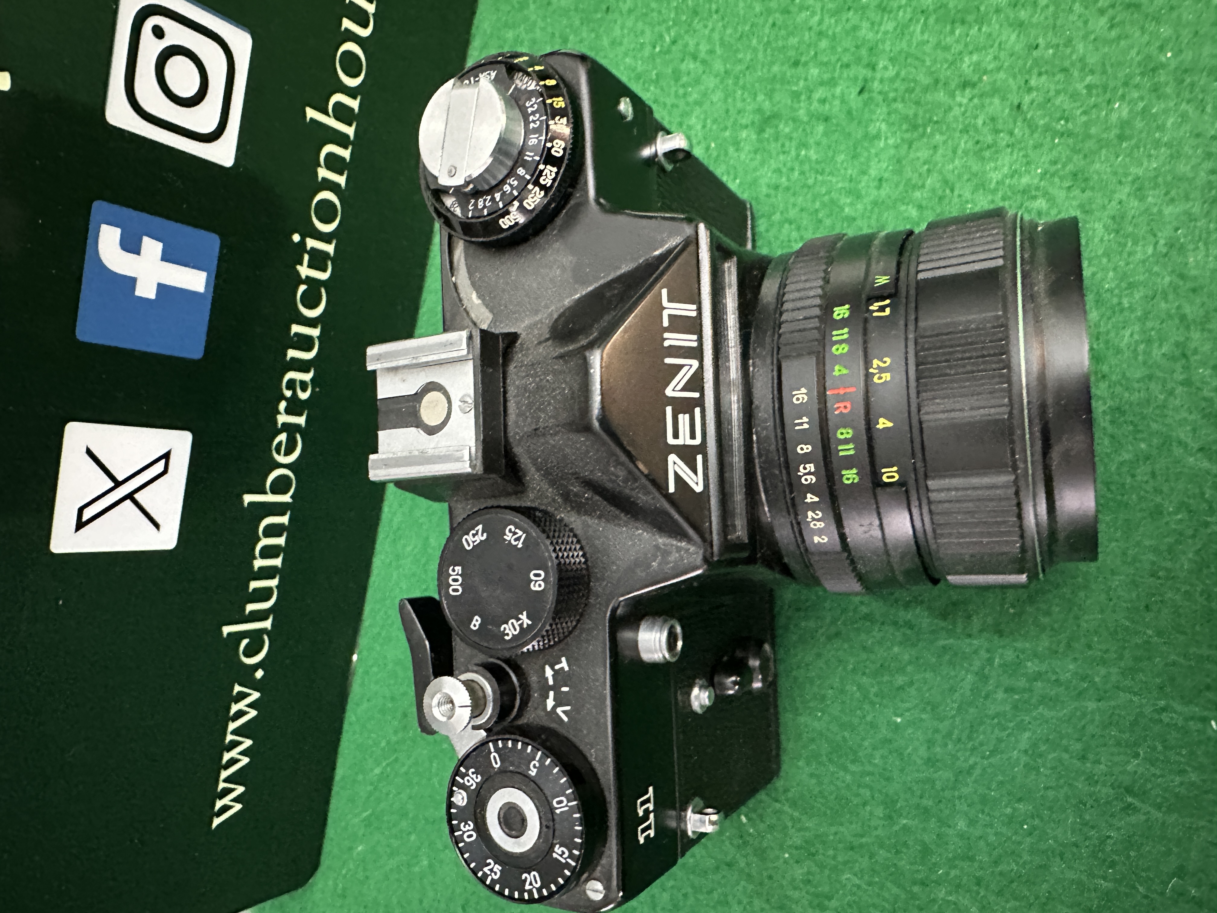 A single Soviet Zenit 11 35mm SLR film camera constructed of black metal alloy, typical of Soviet-era photographic equipment. The camera features a pentaprism housing stamped with the name “ZENIT” (ЗЕНИТ) and is identified as the model “11” on the front plate. It is fitted with a standard prime lens marked “HELIOS-44M-4” and “2/58,” signifying a maximum aperture of f/2 and a 58mm focal length. The top plate includes various exposure control dials and a cold shoe accessory mount.