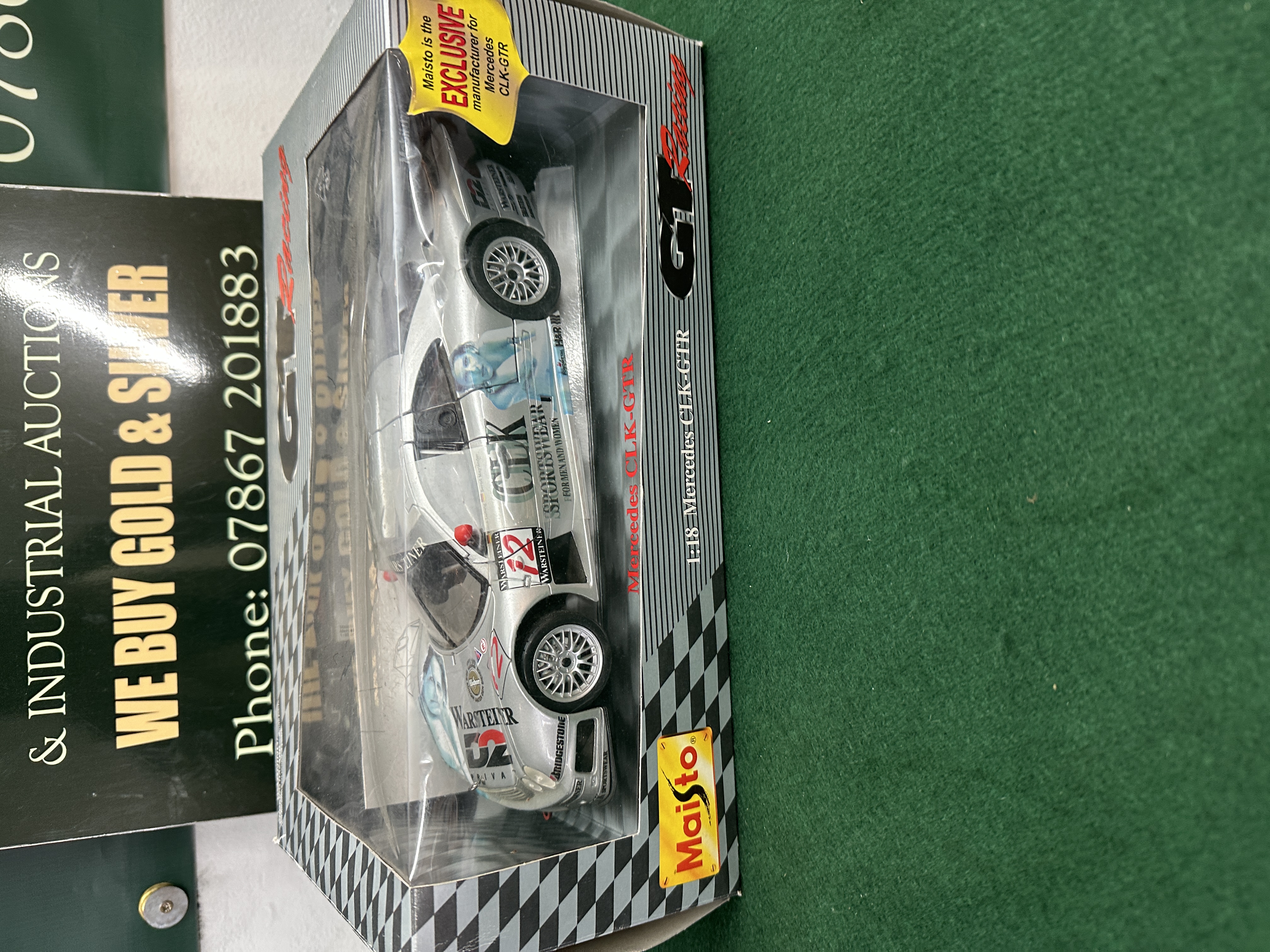 A single boxed die-cast scale model car, identified through consensus as the Maisto GT Racing 1:18 scale replica of the Mercedes-Benz CLK-GTR racing car. The model is constructed of silver-tone metal and plastic components, featuring a highly detailed racing livery. Visible sponsor decals include Warsteiner, GTK Sportswear, and Bridgestone, along with the racing number 12. The model is presented in its original cardboard window box packaging, which is labeled 1:18 Mercedes CLK-GTR and GT Racing. The model is sealed within the clear plastic display window.