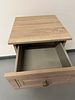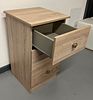 A single contemporary bedside cabinet or nightstand constructed from engineered wood, likely MDF or particleboard, finished with a laminate designed to mimic a light, natural, or bleached oak wood grain. The unit features three vertically stacked drawers, each detailed with a decorative molded face. This molding consists of a central recessed panel framed by a raised border exhibiting a repeating geometric cross-hatch texture. Each drawer front is fitted with a single, centrally located circular knob finished to resemble dark or aged metal. The chest is supported by a simple plinth base. No manufacturer markings or inscriptions are visible.