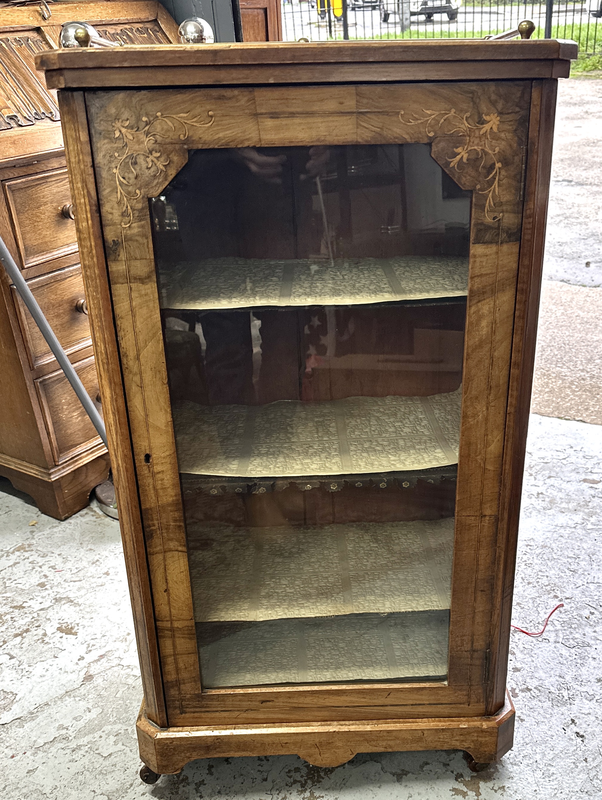 A Victorian period music cabinet constructed of wood veneered in burr walnut. The cabinet features a single front-opening glazed door decorated with light wood stringing and intricate foliate marquetry inlay in the upper corners. The interior contains four fixed shelves, currently lined with a patterned material resembling densely printed text, consistent with storage for sheet music. The top surface is fitted with a three-sided brass rail gallery secured by brass finials at the corners. The base is fitted with small castors for mobility. No visible maker’s marks or legible inscriptions are present.