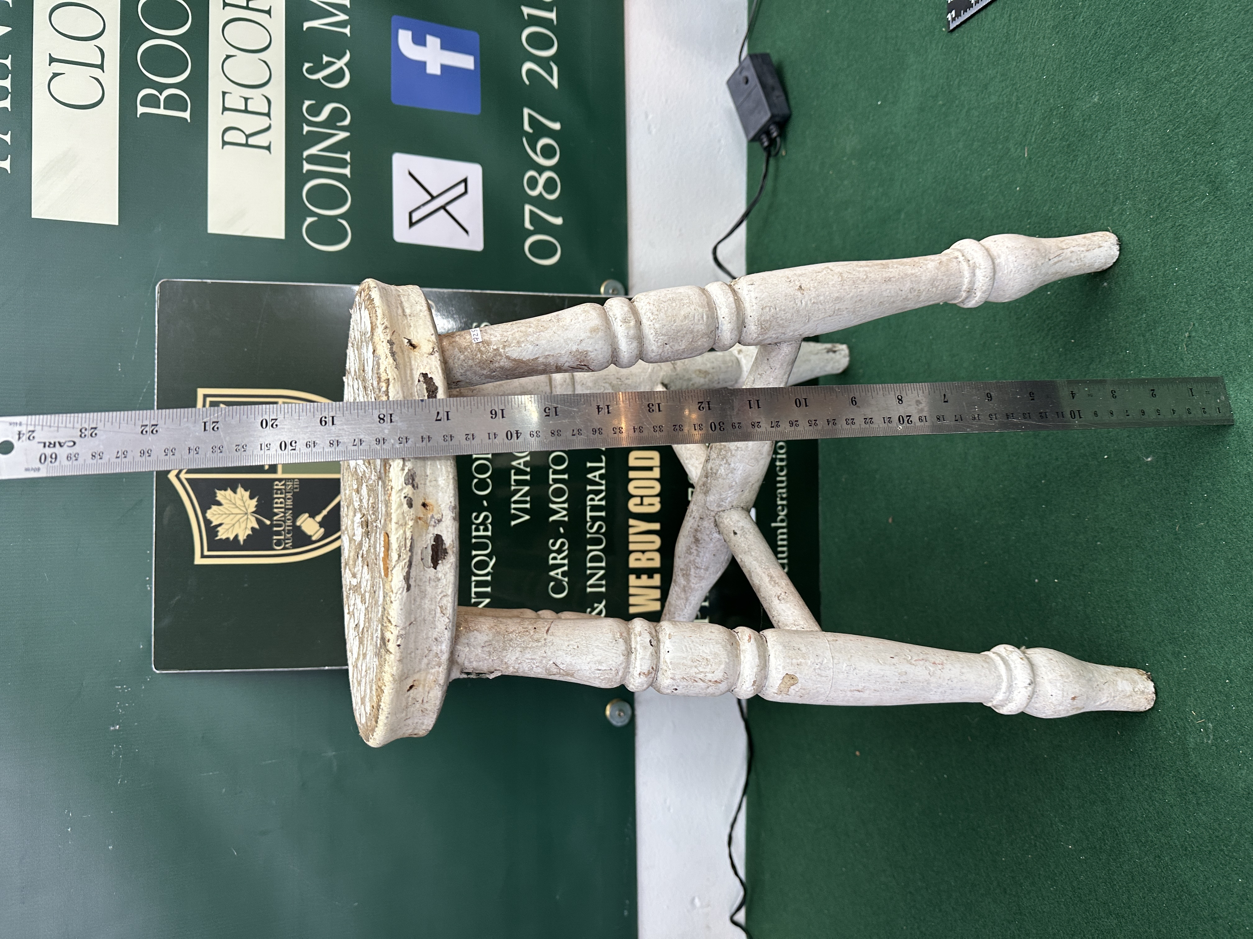 This item is a vintage wooden stool, constructed with a round seat and four turned legs, characteristic of architectural salvage or farmhouse furniture. The legs feature a decorative spindle or baluster design, connected by a crossed stretcher support structure. The item is finished in a heavily distressed white paint, indicating significant age and wear.