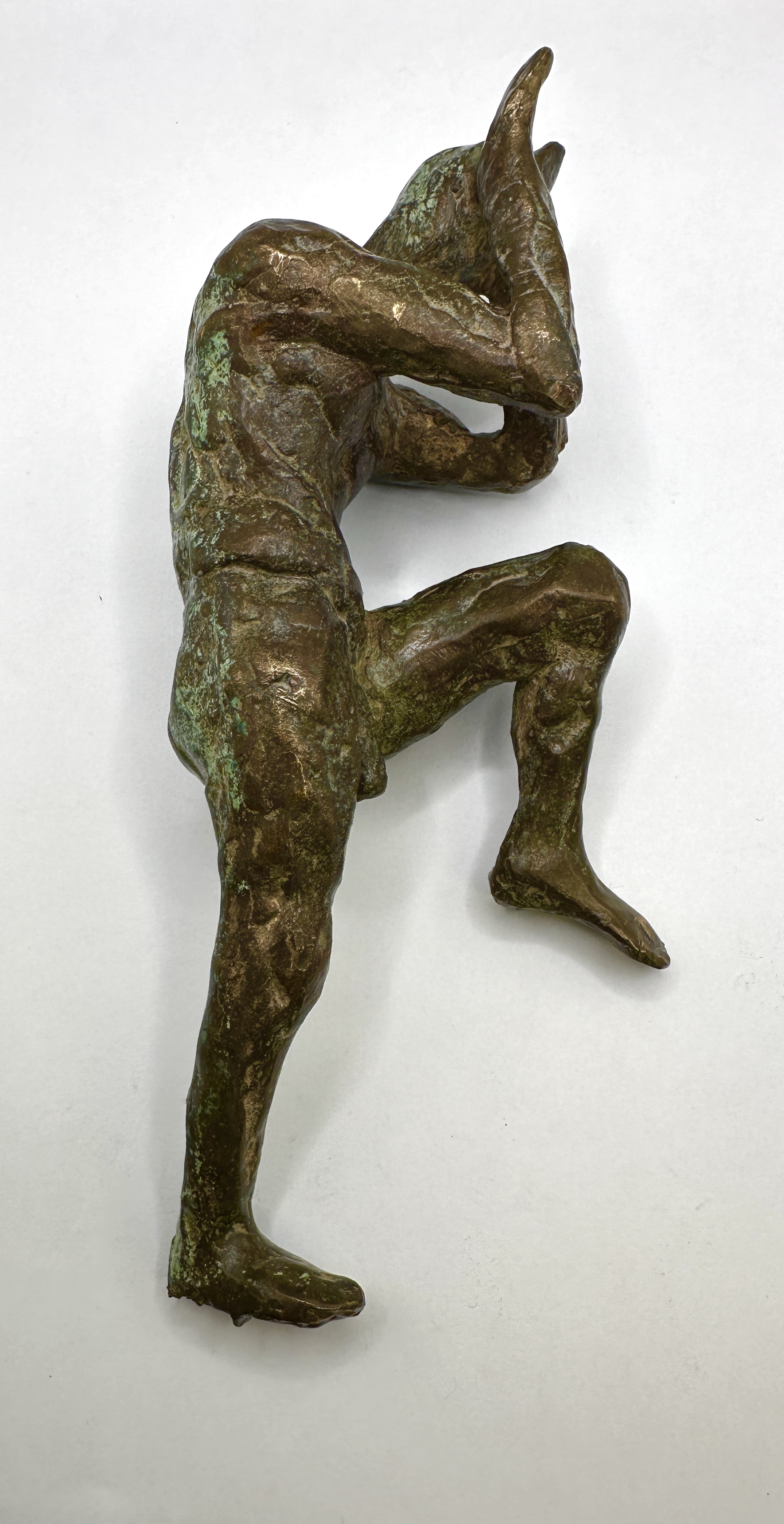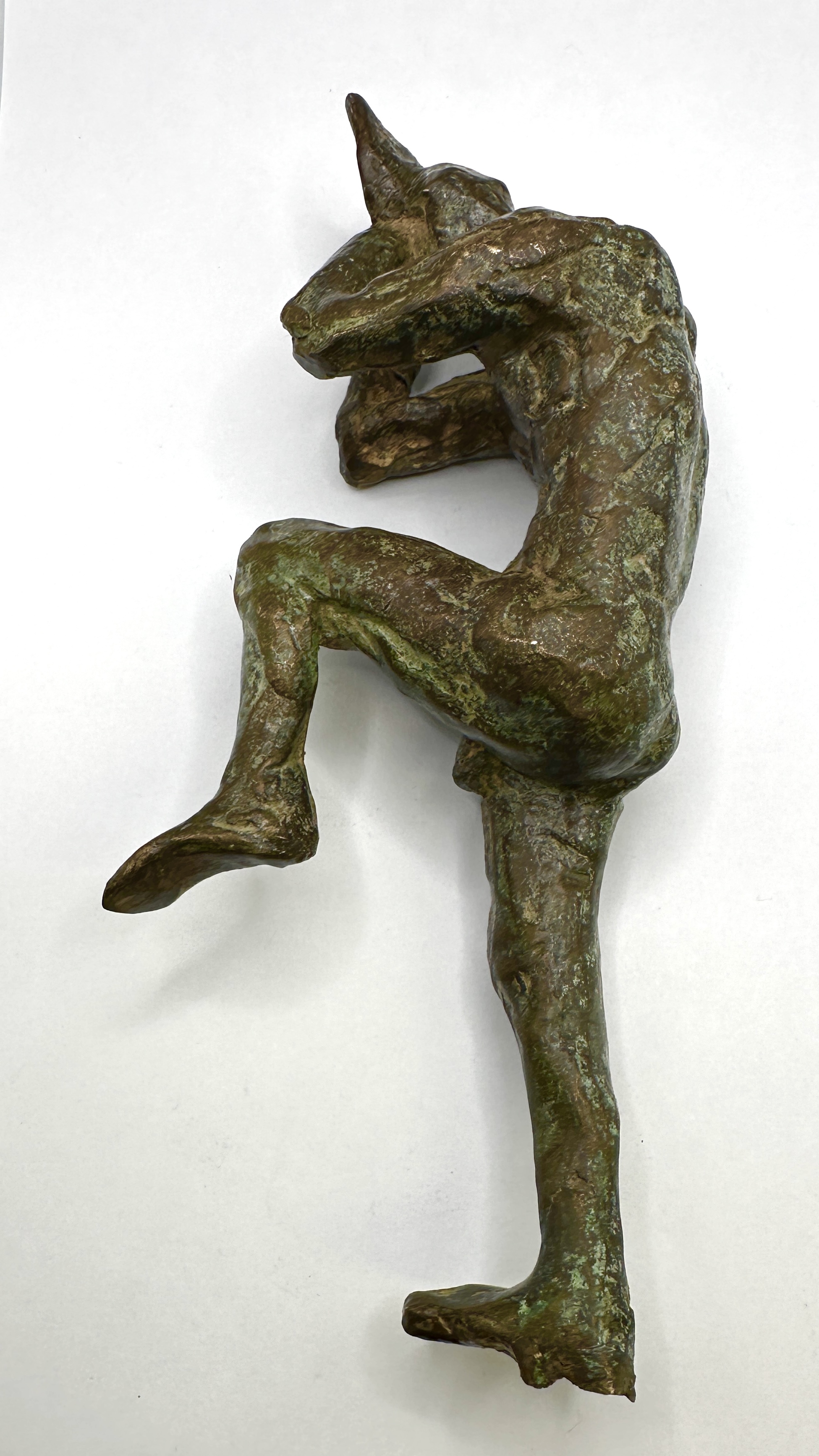 This is a cast bronze sculpture depicting a male figure in a highly dynamic, crouched stance, with arms raised to shield the head. The piece is characterized by a rough, textured surface treatment typical of cast metal work, emphasizing musculature and movement. The material is confirmed to be bronze, presenting a heavy, aged finish suitable for display.