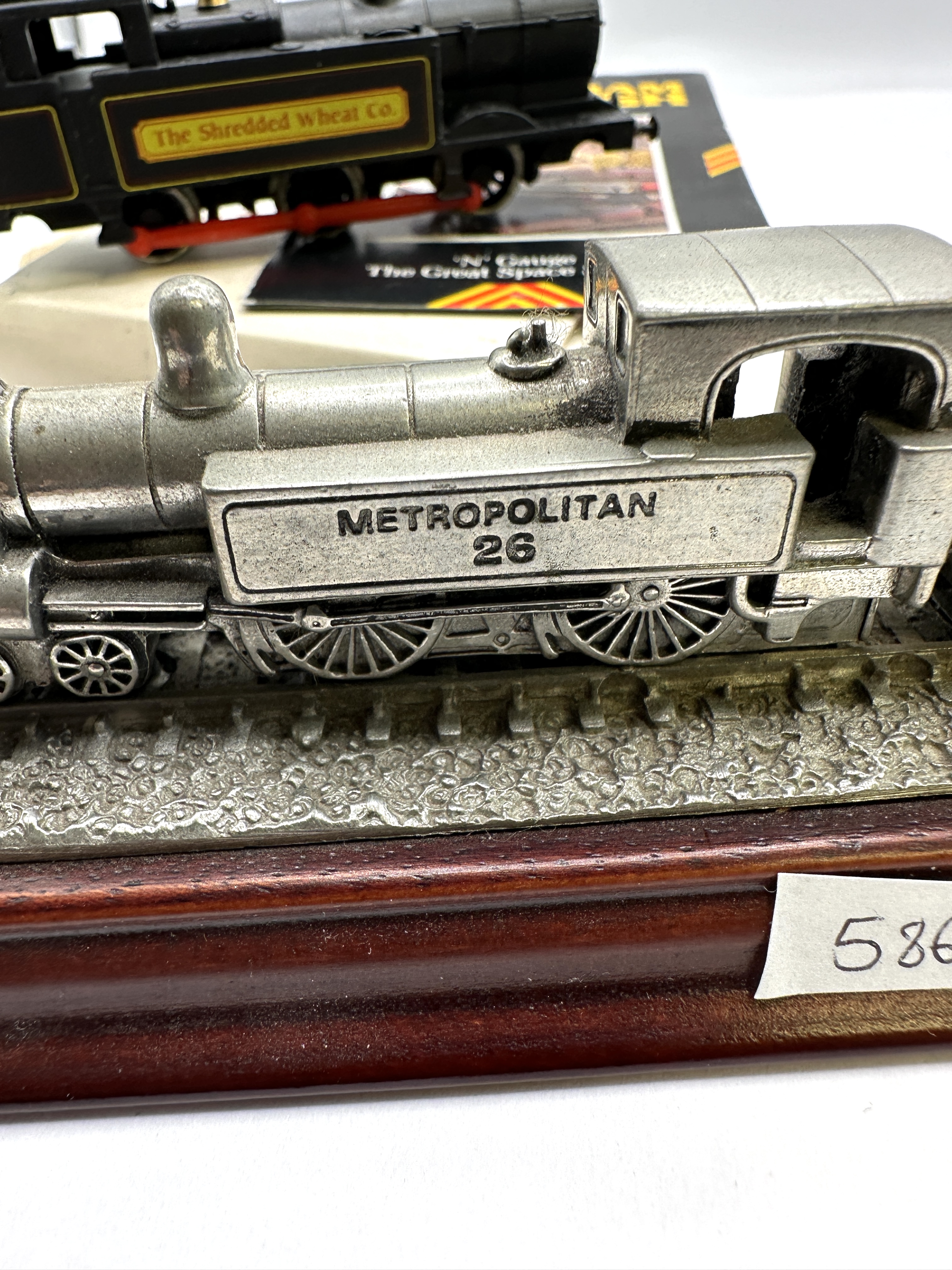 This lot comprises two distinct miniature locomotive models suitable for collectors. The first is a black Graham Farish N Gauge powered locomotive featuring the “The Shredded Wheat Co.” livery, presented with its associated packaging and literature detailing “Masterpieces in Miniature” and “‘N’ Gauge The Great Space Saver!”. The second item is a static display piece, likely cast in pewter or die-cast metal, depicting a locomotive marked “METROPOLITAN 26” coupled with a coal wagon marked “N.C.C.”, mounted securely on a polished wooden plinth with a cast track bed.