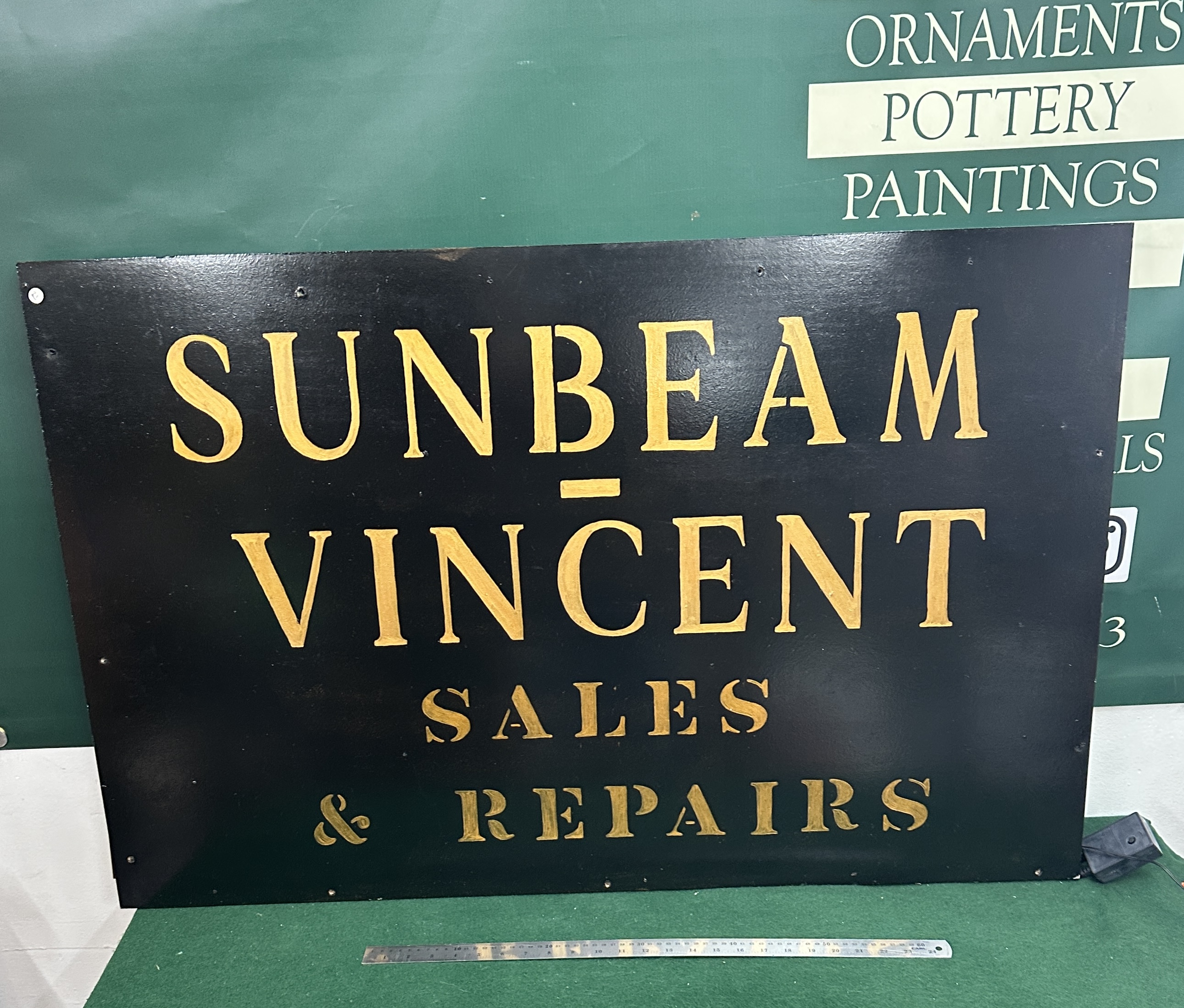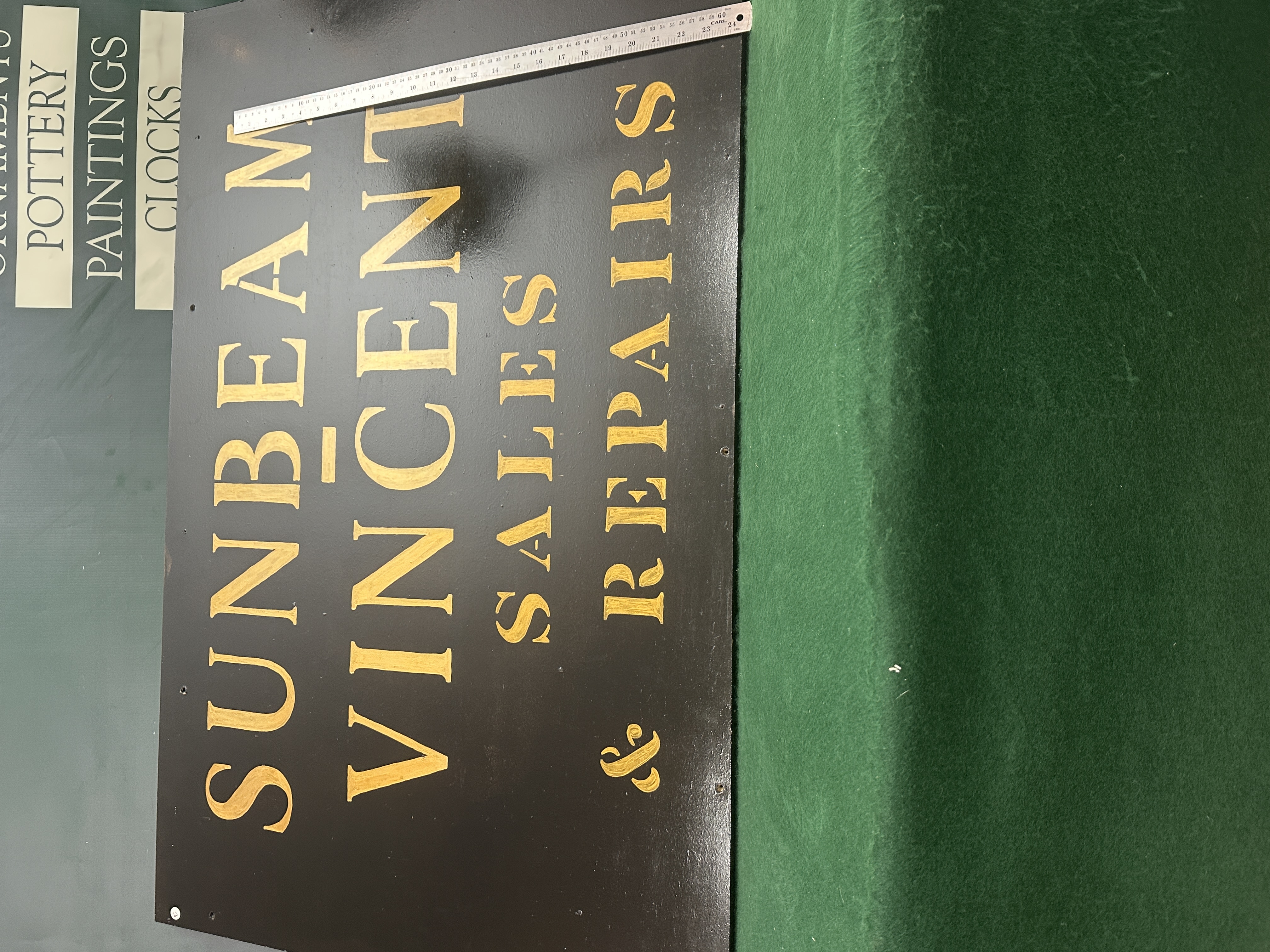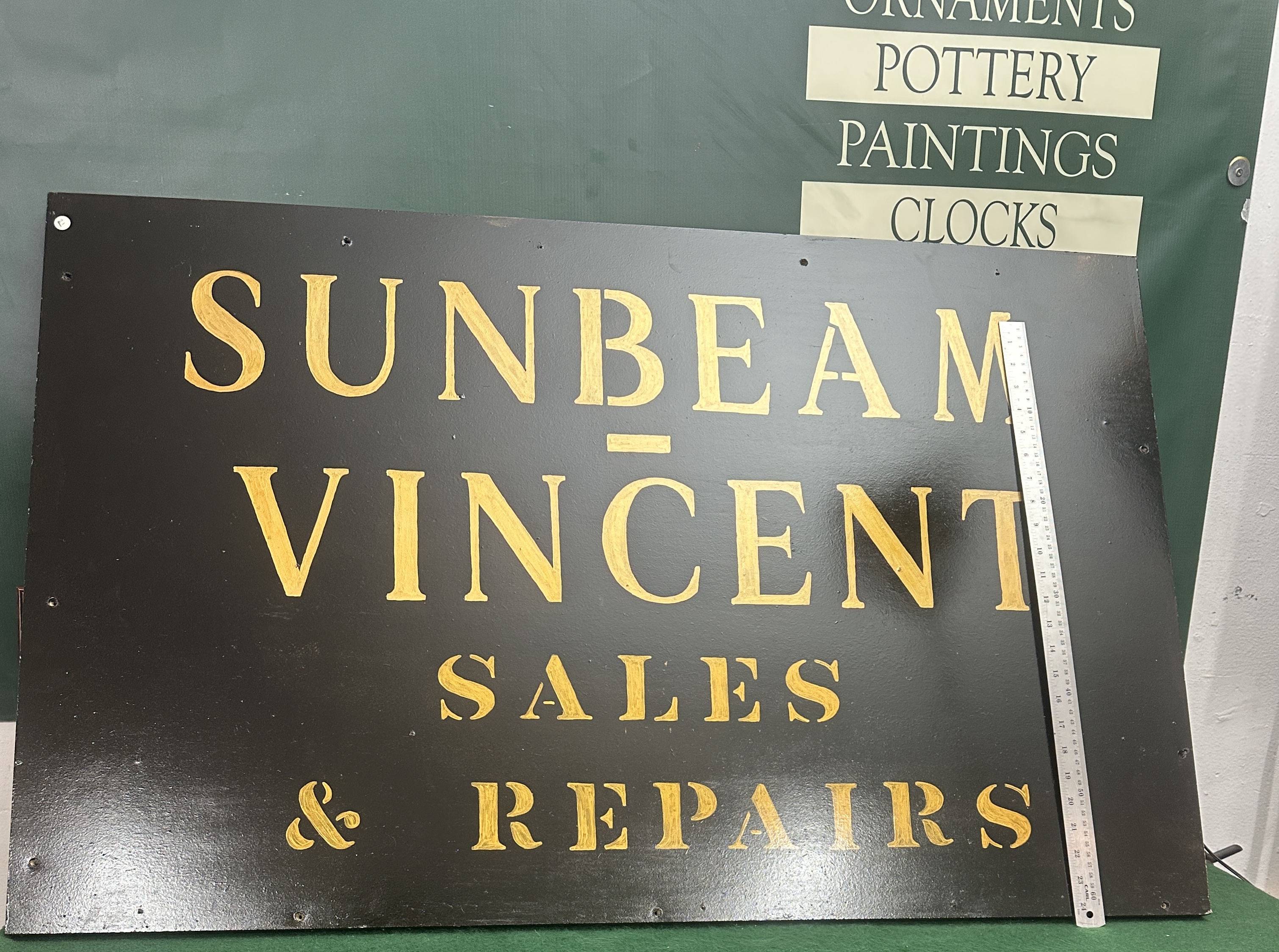This is a large, professionally painted sign advertising sales and repair services for the historic British marques Sunbeam and Vincent. Sunbeam is known for both automobiles and motorcycles, while Vincent is celebrated for high-performance motorcycles. The sign features bold, stenciled gold lettering against a dark background, suggesting use in a workshop or dealership setting. The size and style indicate it was likely intended for external or prominent internal display.