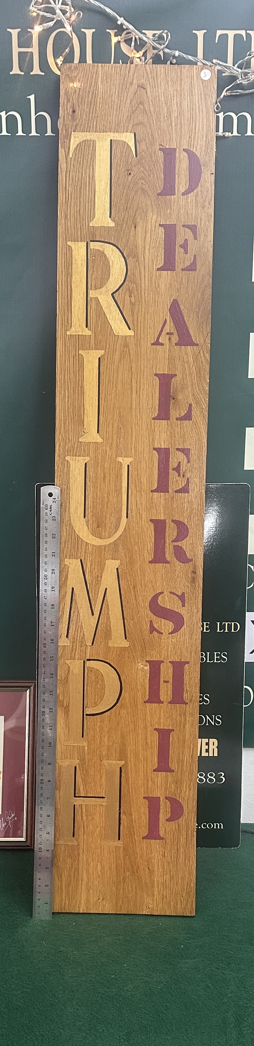 This lot comprises a substantial, vertical wooden plaque featuring deeply carved and painted lettering spelling TRIUMPH DEALERSHIP. The plaque utilizes gold paint for the TRIUMPH lettering and a deep maroon/red paint for DEALERSHIP. The item is finished with a glossy polish, highlighting the natural wood grain. A metal eyelet is affixed to the top edge for hanging display, suggesting use as historical dealership or shop signage.