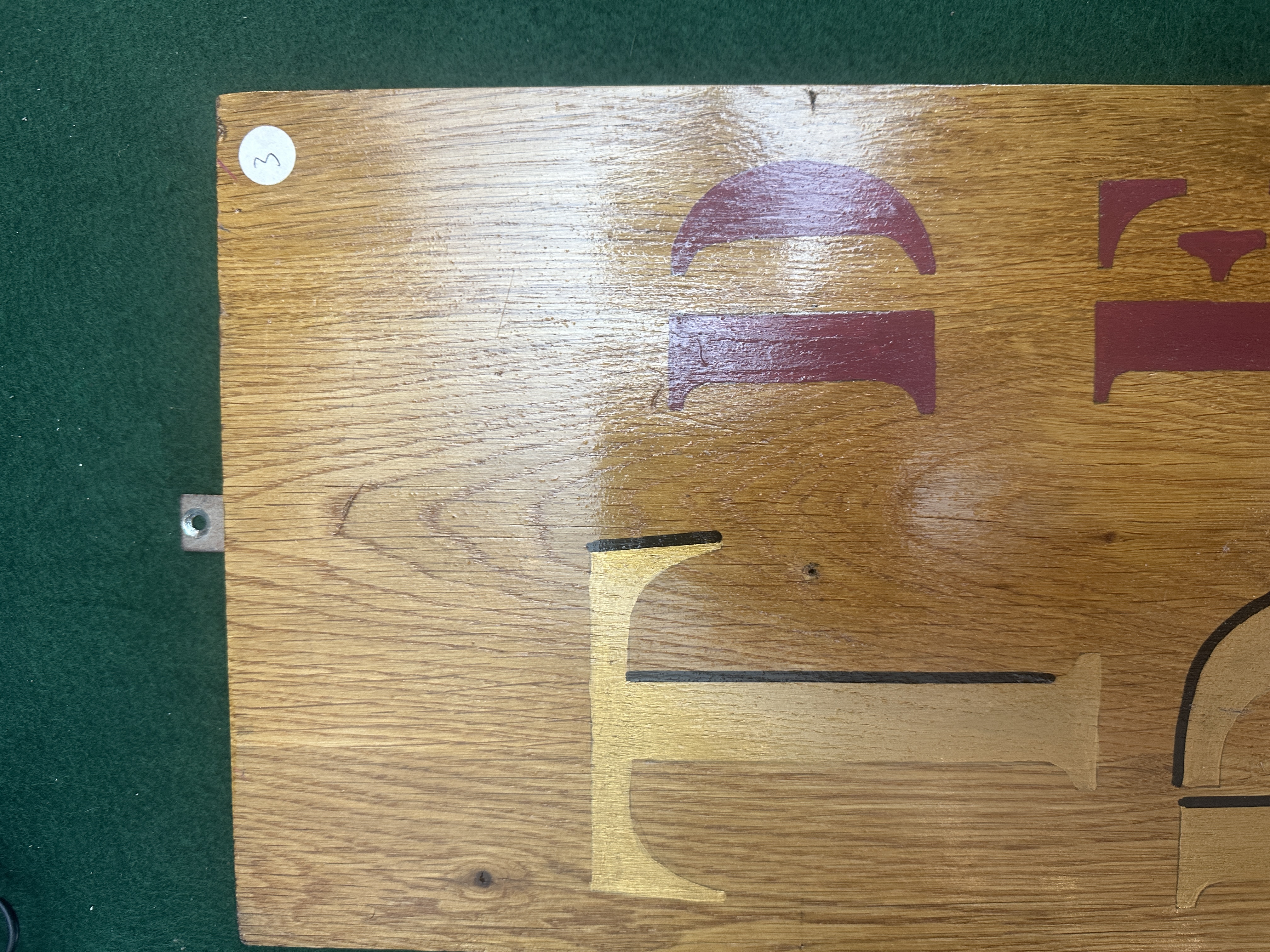 Features – Carved lettering, glossy finish, metal hanging eyelet