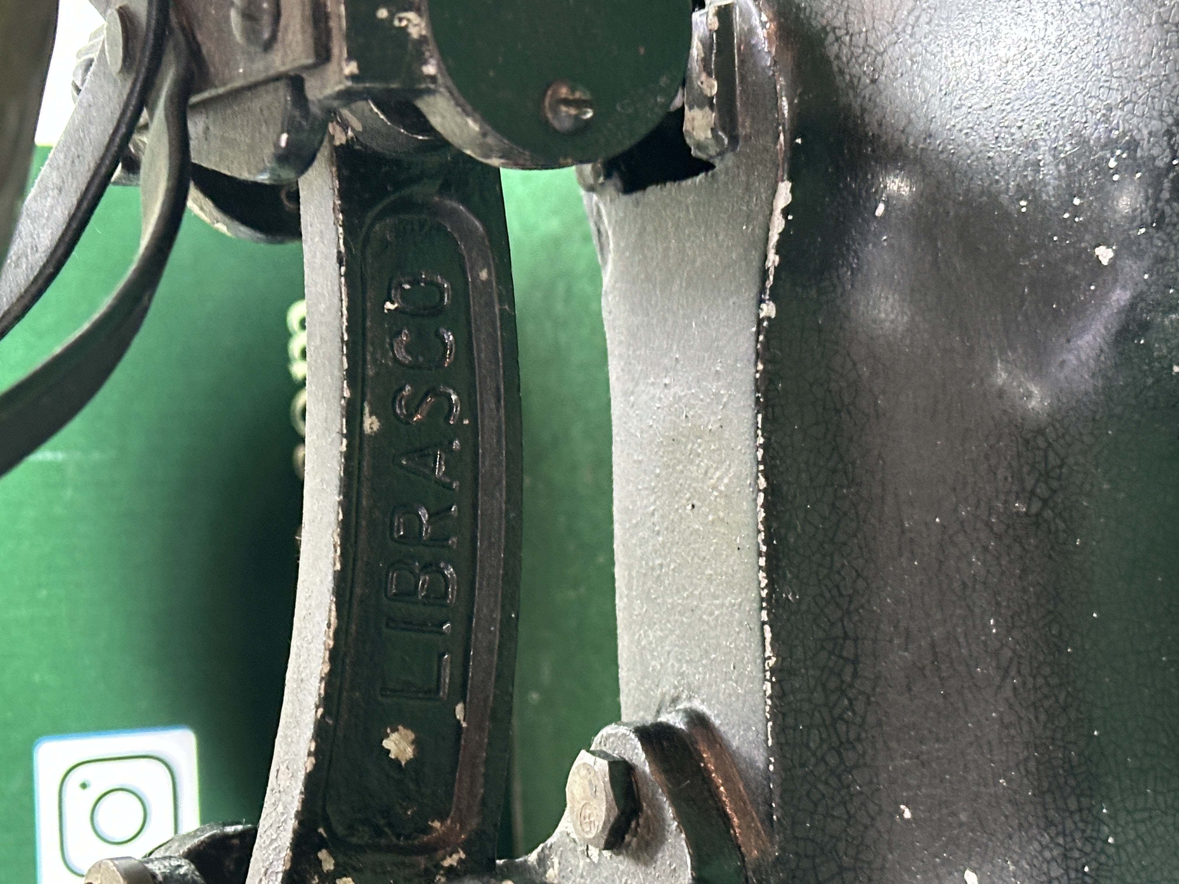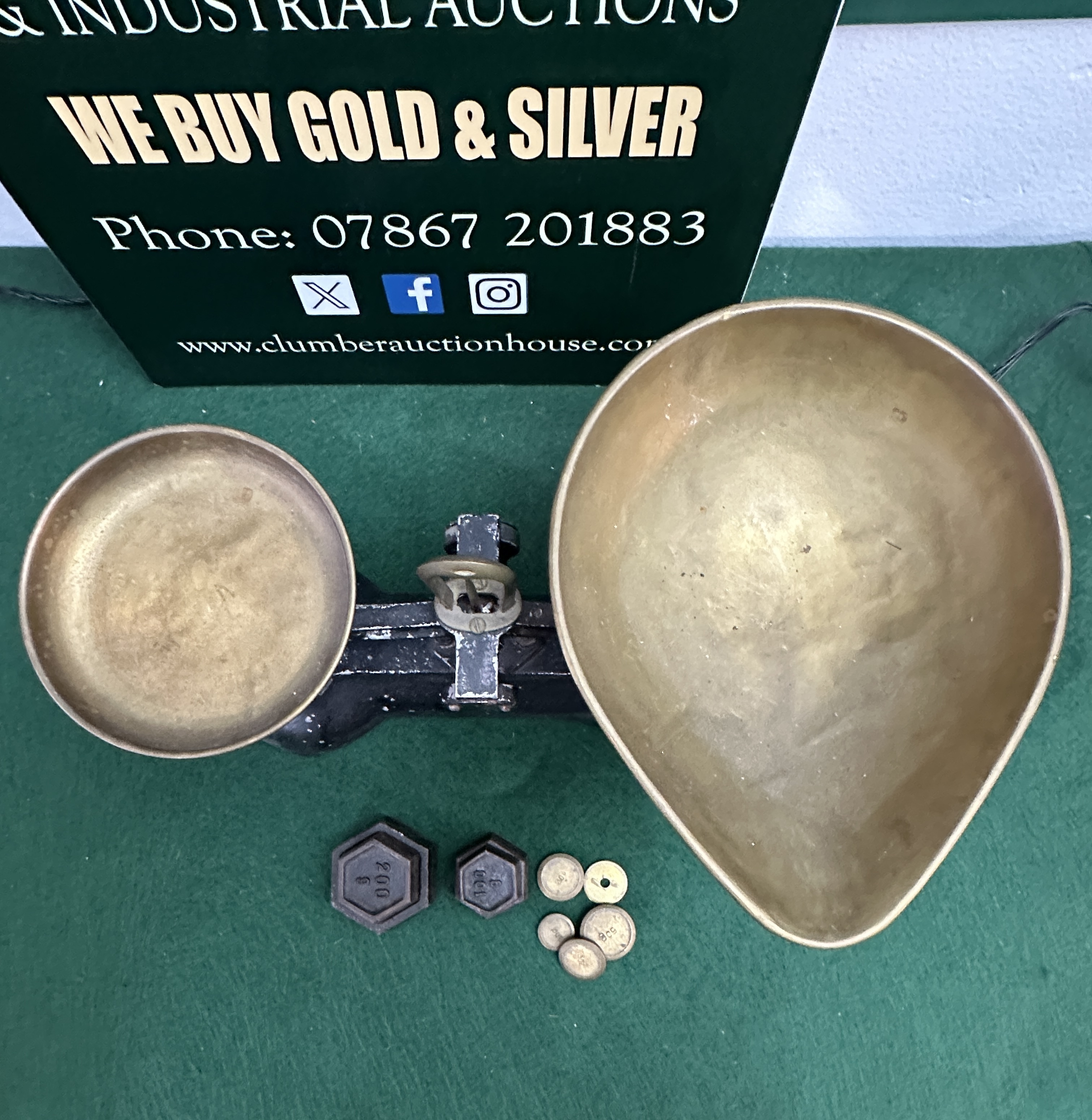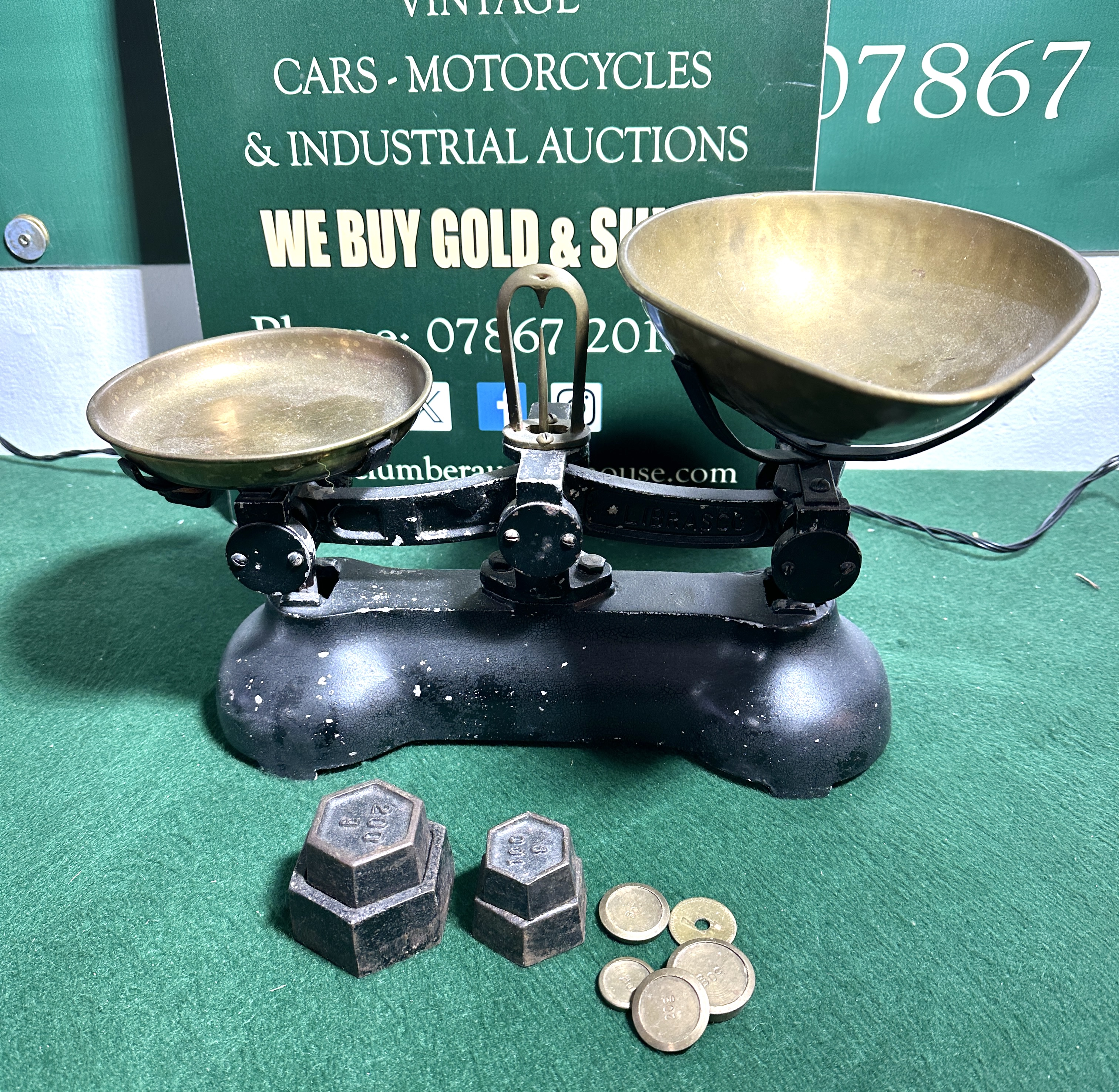 This lot comprises a vintage counter-style mechanical balance scale manufactured by LIBRASCO, featuring a heavy cast iron base and mechanism finished in black paint, paired with two brass weighing pans. The scale is presented with a set of associated hexagonal stackable weights, one of which is marked 700 (unit unknown), and a small assortment of various coins. The overall configuration suggests use in a general store, kitchen, or laboratory setting.