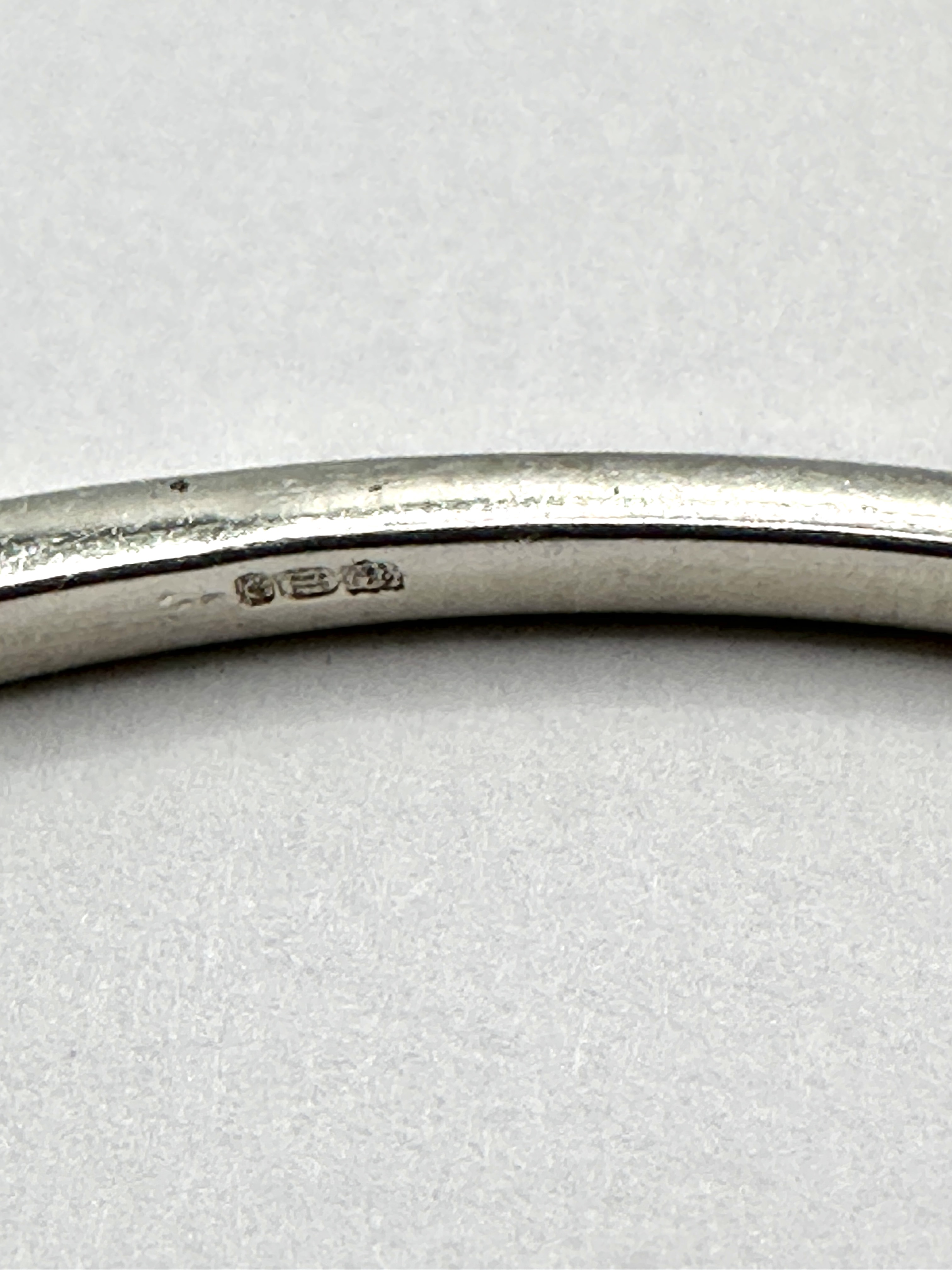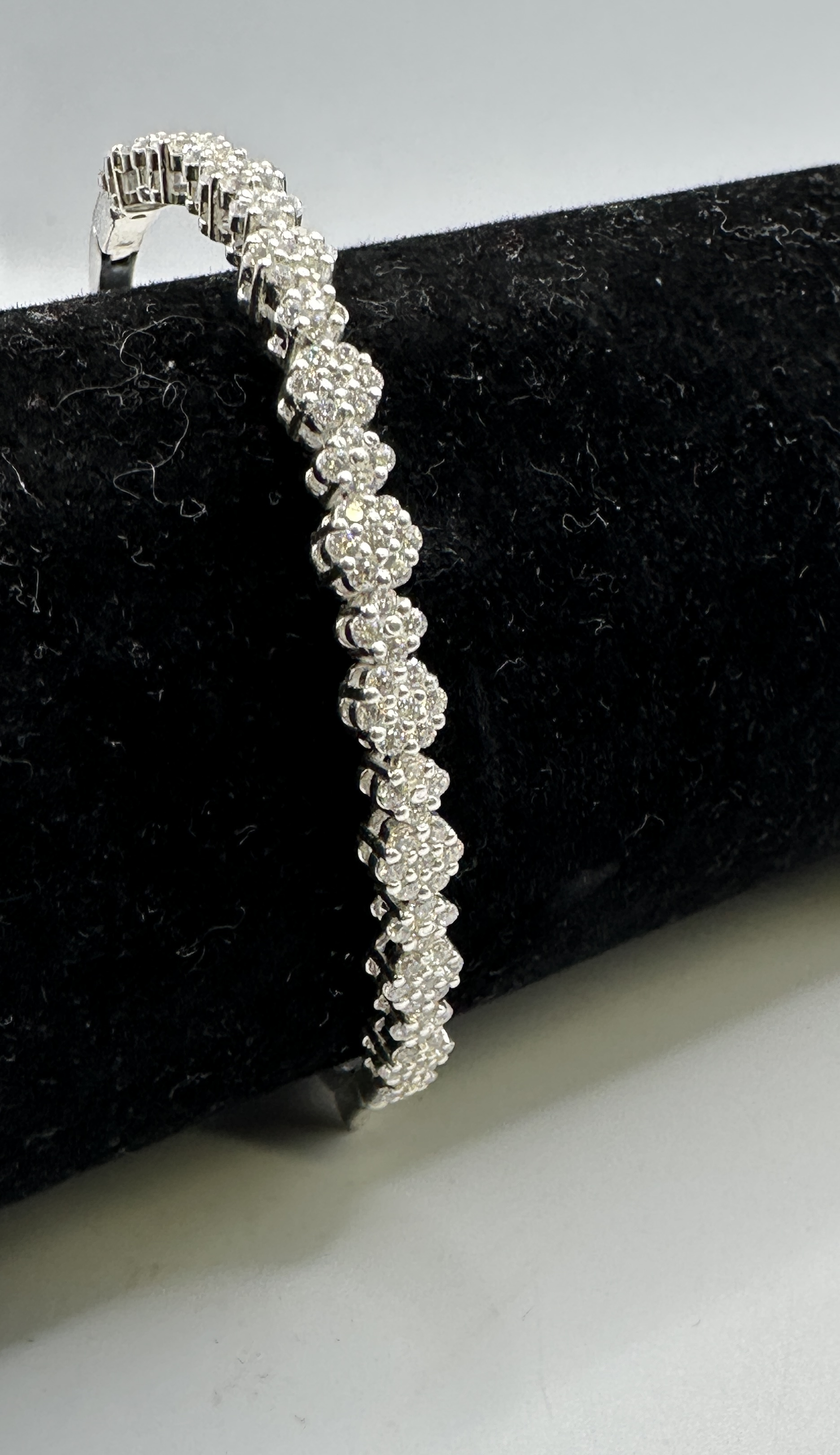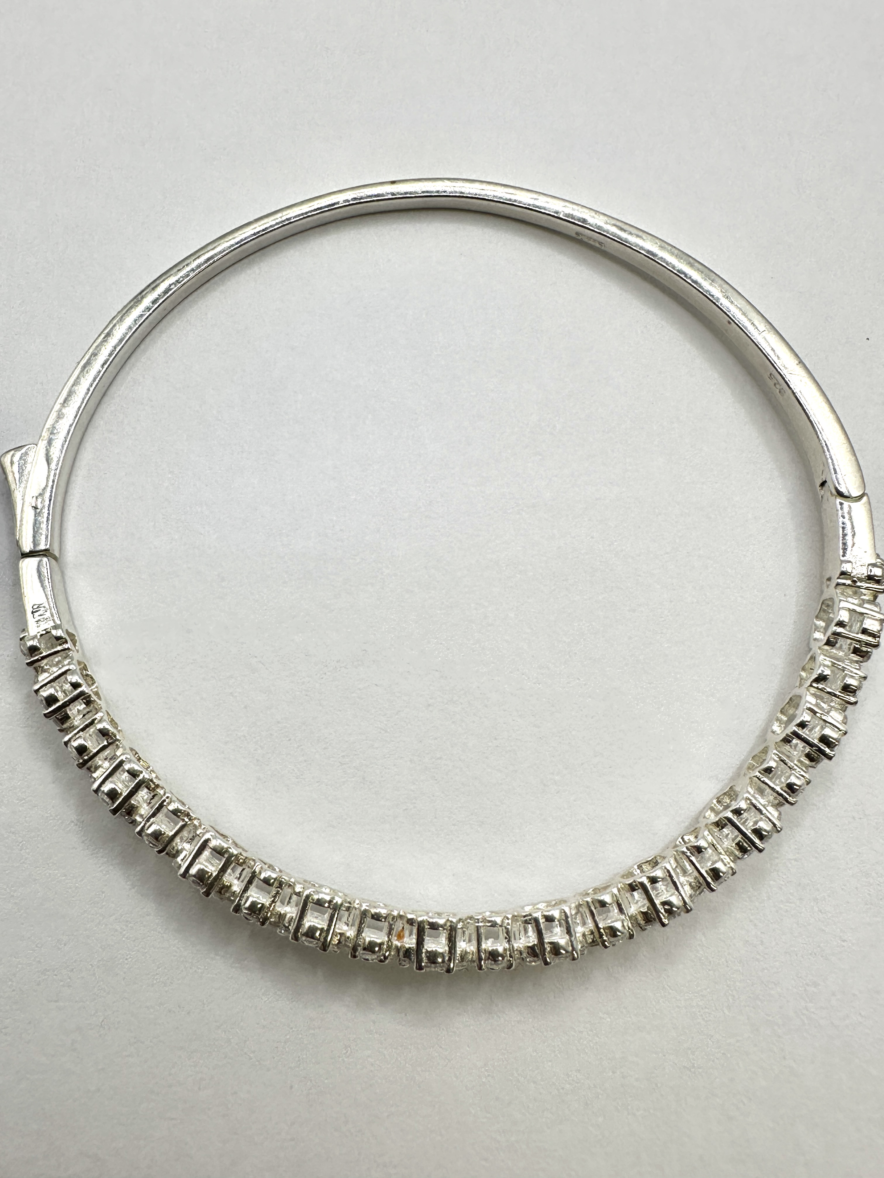 A substantial hinged bangle bracelet confirmed to be crafted from 925 silver. The front half of the cuff is adorned with a continuous line of clear, colorless stones, each set in a multi-stone cluster arrangement resembling a flower or rosette. The design provides a high-carat look. The bangle features a secure hinge mechanism and a visible clasp system. Hallmarks confirming the metal purity are present on the interior surface of the band.