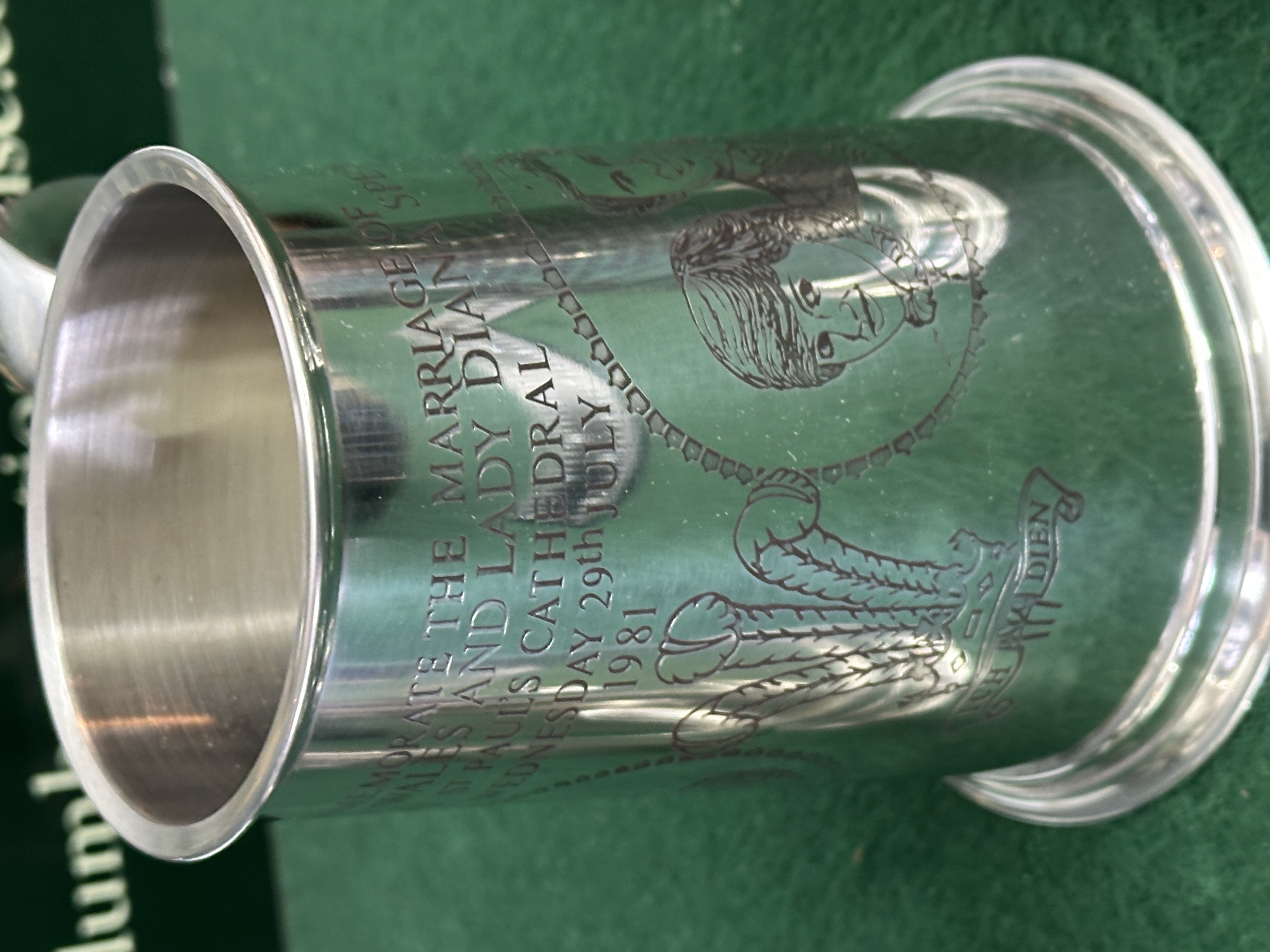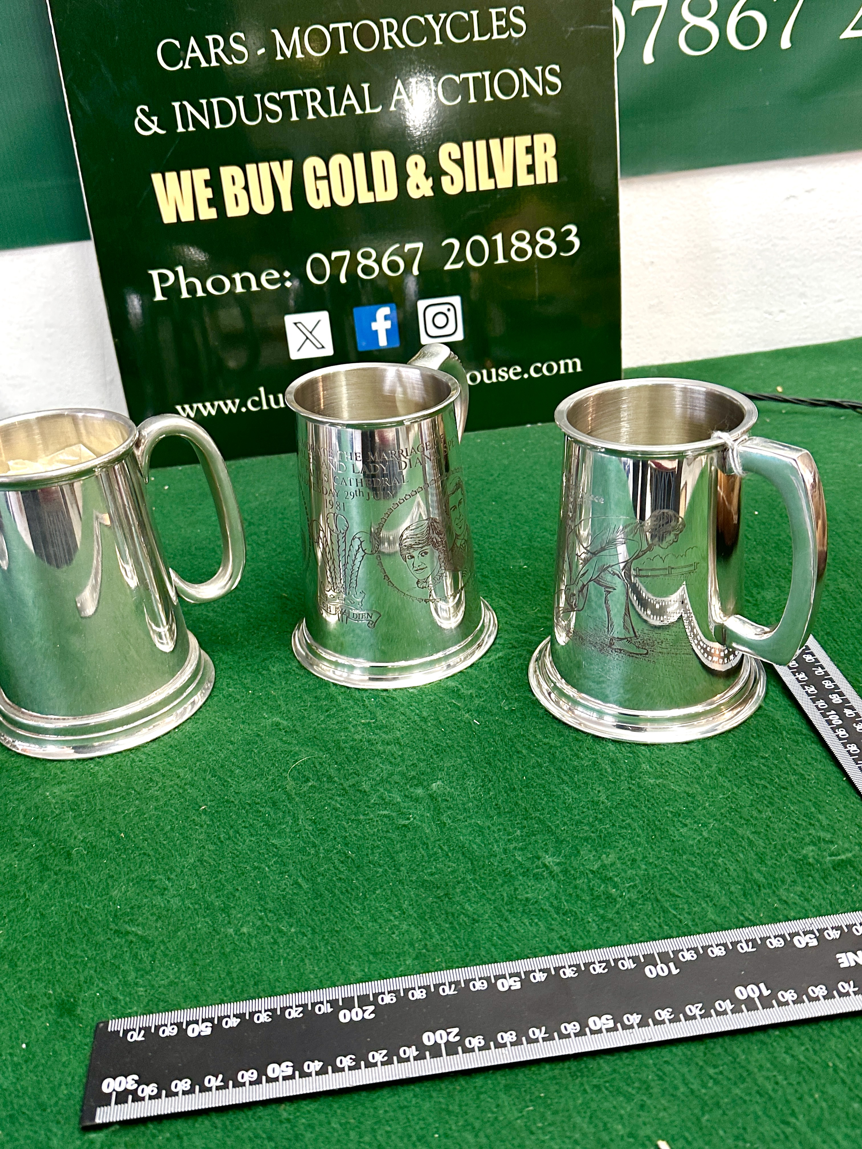 A collection of three metallic tankards confirmed to be constructed from pewter. The set includes two highly detailed commemorative examples. The first tankard celebrates the marriage of Prince Charles and Lady Diana at St Paul’s Cathedral on July 29th, 1981, featuring the Prince of Wales’s feathers and the motto ICH DIEN. The second tankard features an engraved athletic figure and references an event in Greece in 2011. The third tankard appears to be a standard design, presented in a similar finish. The items are displayed on a green felt surface with a ruler visible for scale reference.