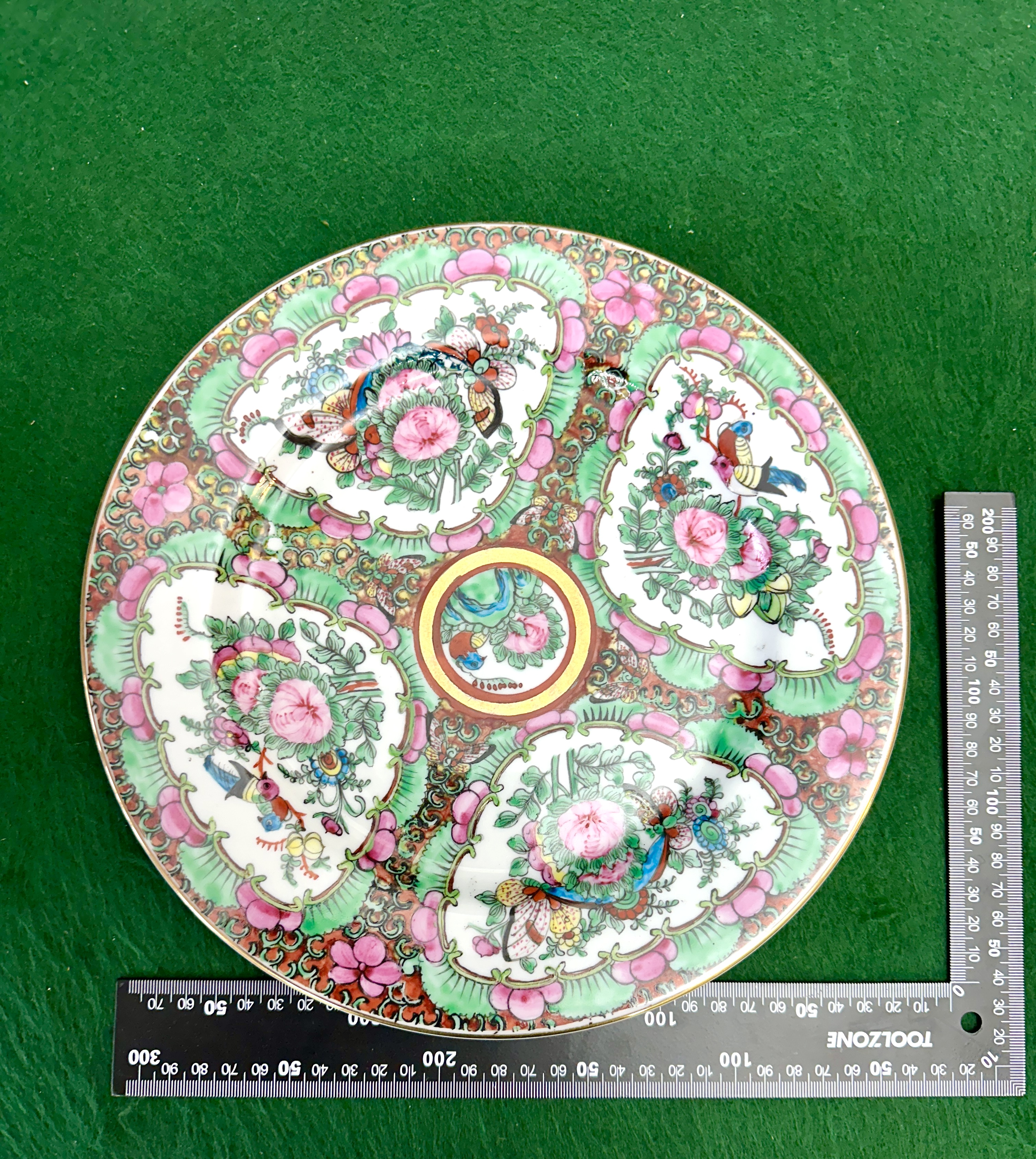 This is a large, circular decorative serving plate or platter executed in the traditional Chinese Famille Rose Medallion style. The design features a vibrant palette of pink, green, yellow, and blue enamels, centered around four distinct panels depicting birds (likely pheasants or peacocks) and large peonies or roses. The piece is marked on the reverse with a red seal indicating Chinese origin, consistent with export porcelain.