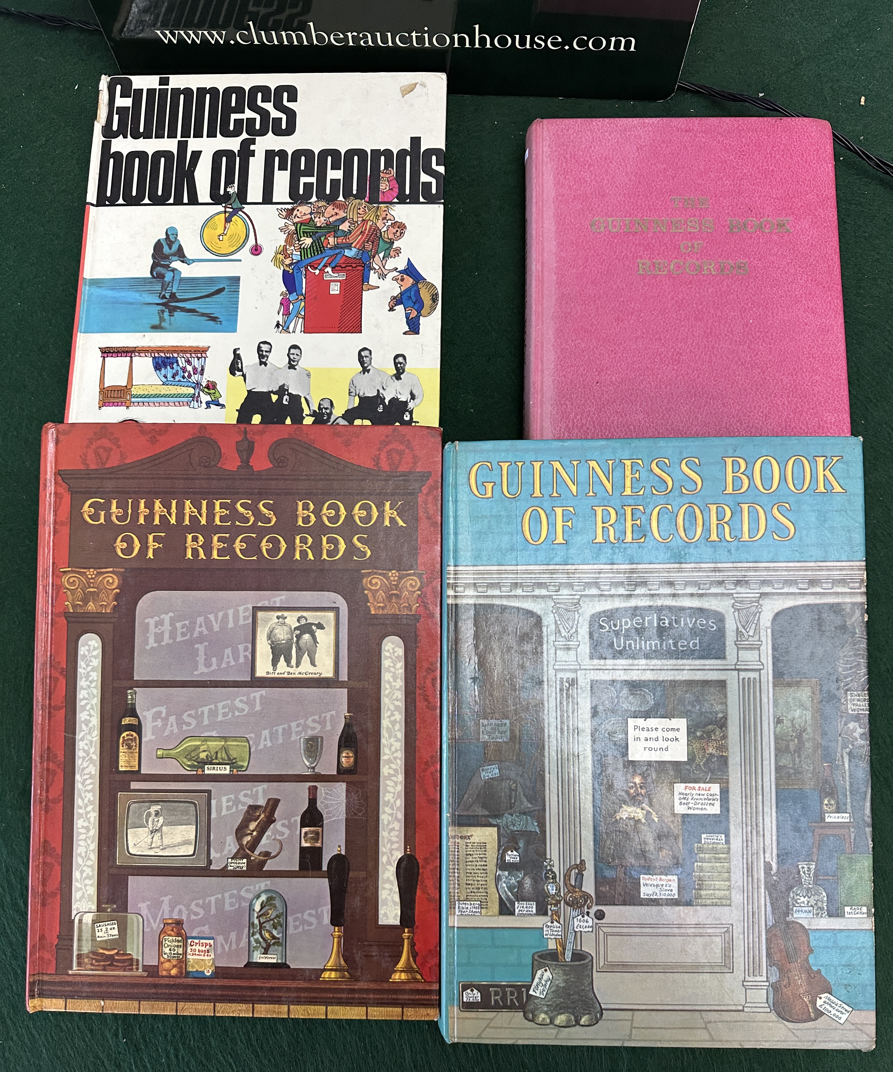A collection of four vintage editions of The Guinness Book of Records, featuring a variety of cover designs and binding styles. The lot includes three hardcover volumes and one paperback volume, representing different publication years, likely from the late 1960s or early 1970s based on cover aesthetics. These editions are typically associated with the authorship of Norris and Ross McWhirter. The covers display iconic illustrations related to world records, including detailed representations of a display case and a shop window labeled Superlatives Unlimited.