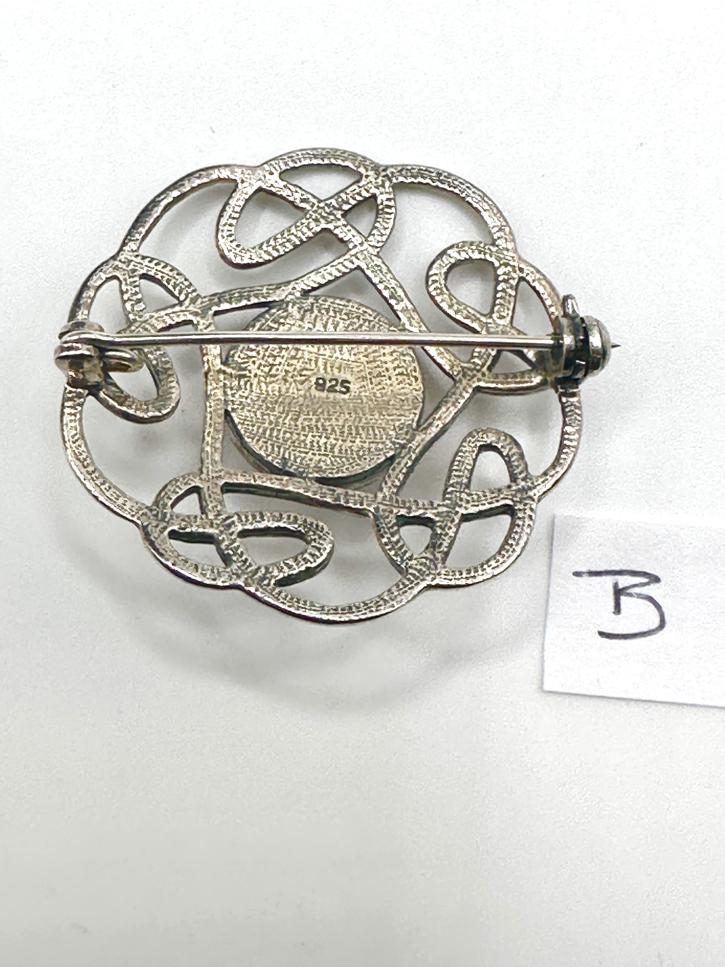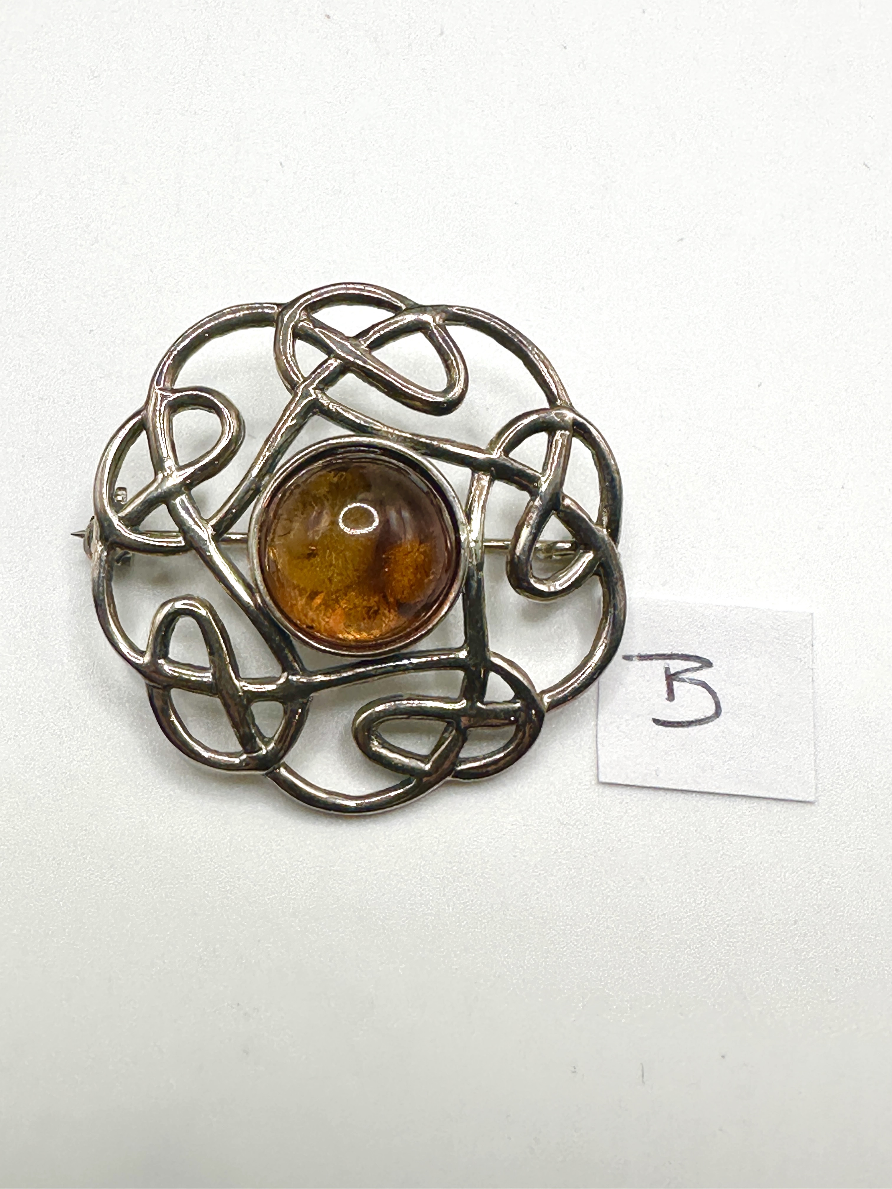 A circular brooch crafted from 925 silver, featuring an intricate openwork design of continuous Celtic knotwork. The centre of the knotwork is set with a single, high-domed, translucent cabochon stone, identified as amber due to its colour and clarity. The reverse of the brooch is fitted with a functional pin stem and a roll-over safety clasp mechanism. The metal is stamped “925” indicating sterling silver purity.