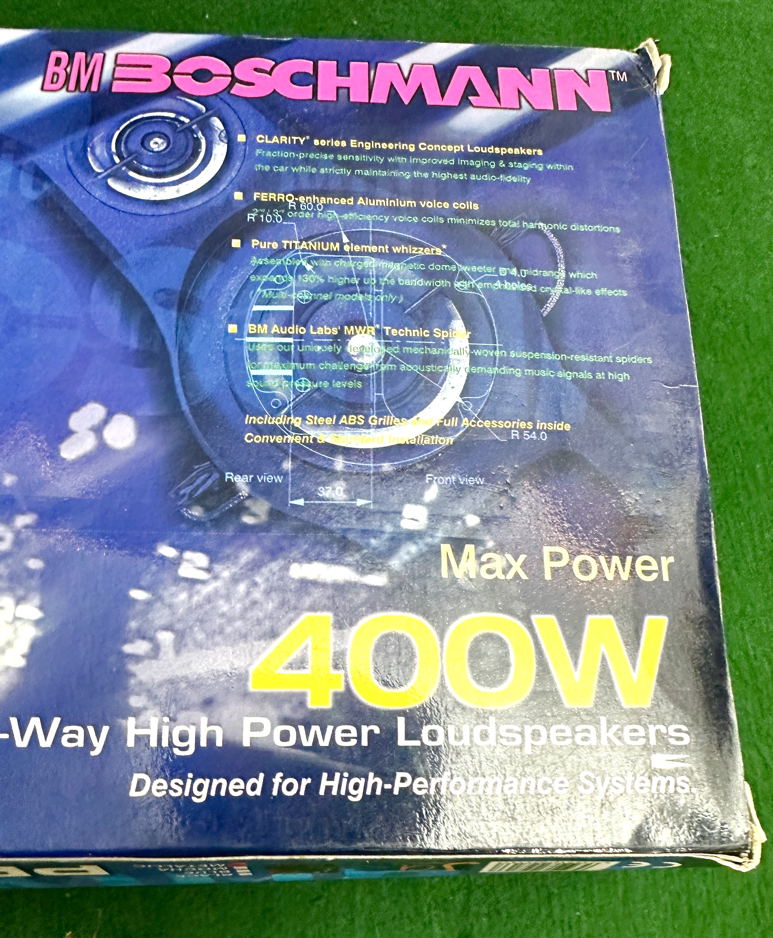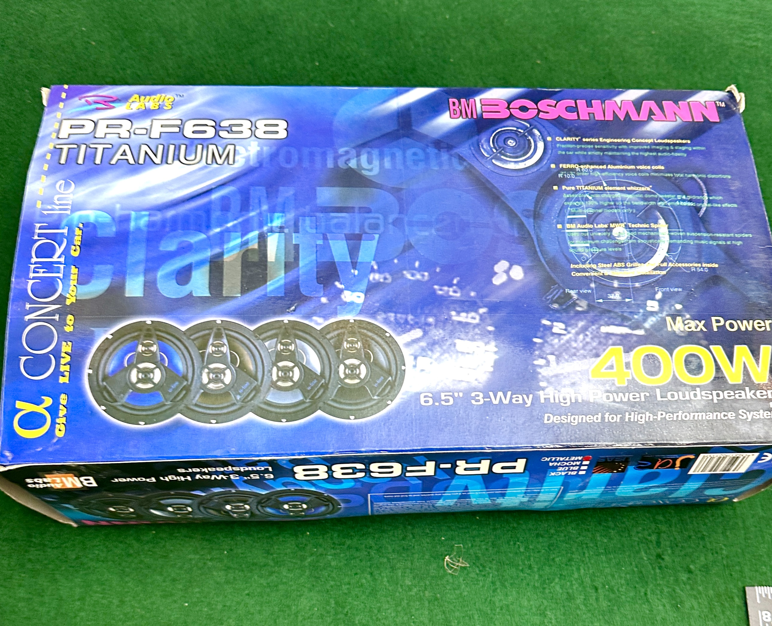 A retail box for a set of BM Boschmann PR-F638 Titanium Clarity series car audio speakers. The cardboard packaging features a blue and silver graphic design and identifies the contents as 6.5 inch 3-way high-power loudspeakers with a maximum power rating of 400 watts. Printed technical specifications on the box highlight features such as ferro-enhanced aluminium voice coils, pure titanium element whizzers, and included steel ABS grilles. The item is part of the Alpha Concert Line and is designed for high-performance systems.