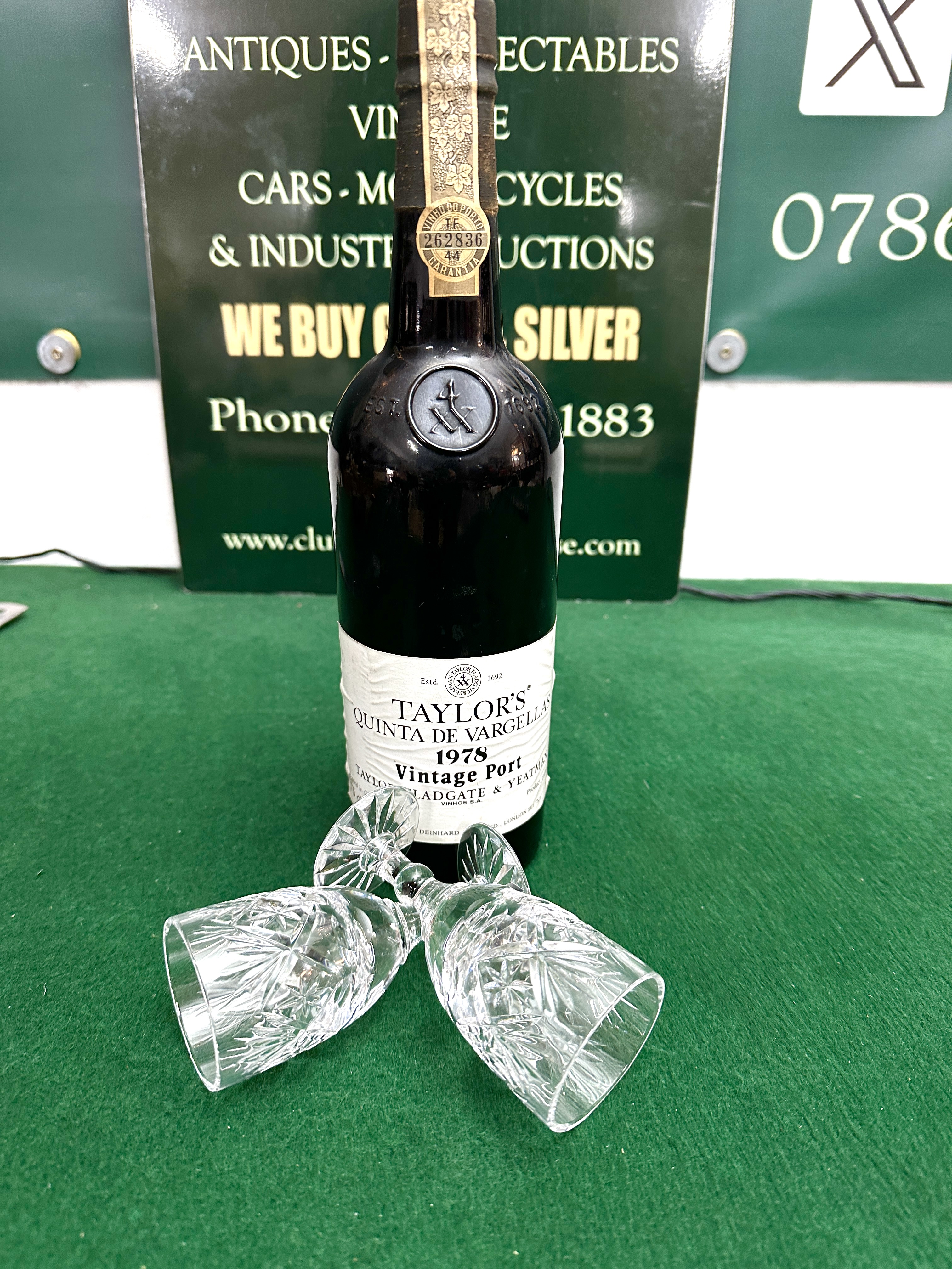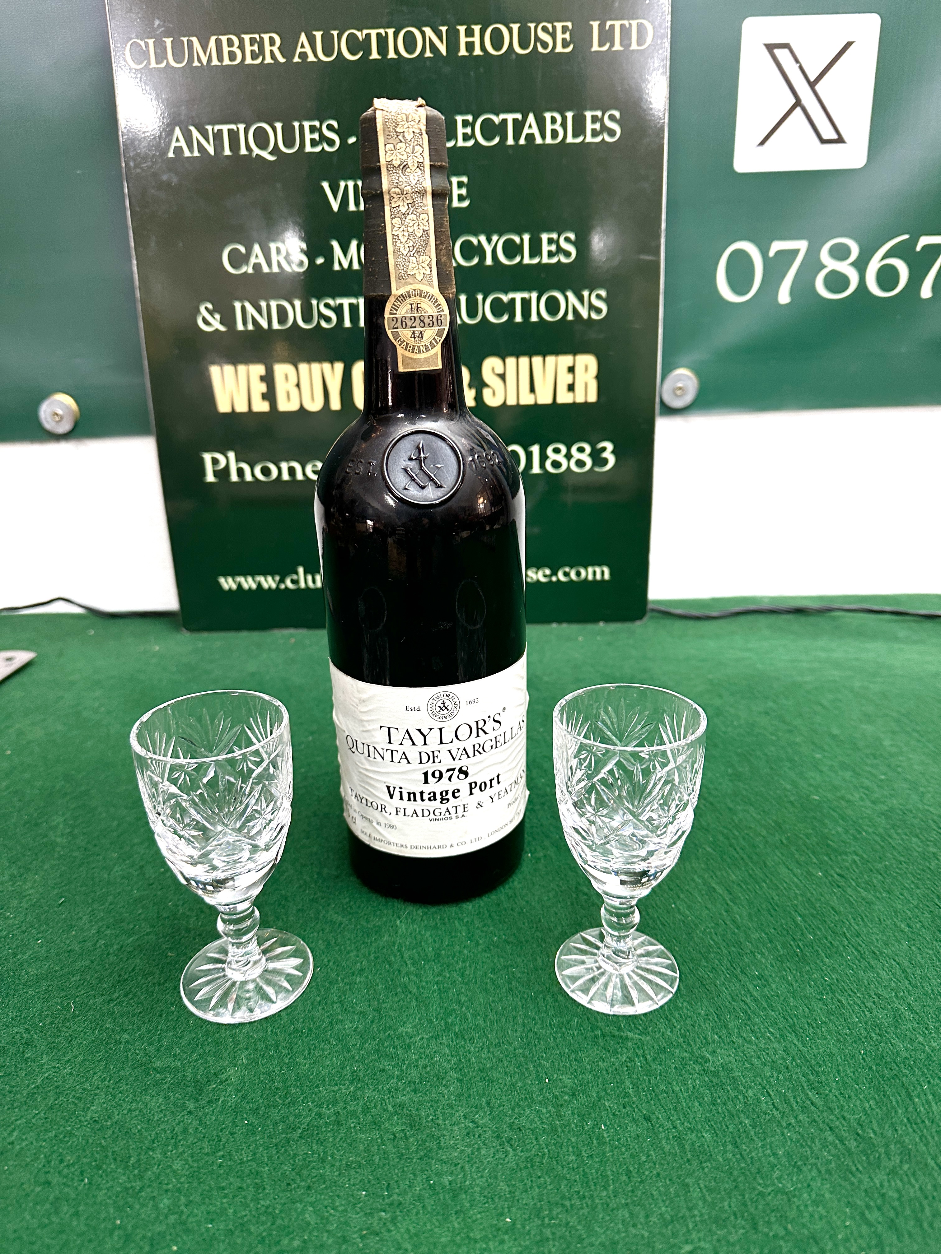A bottle of Taylor, Fladgate & Yeatman Quinta de Vargellas 1978 Vintage Port accompanied by a pair of cut crystal glasses. The dark glass bottle features an embossed seal on the shoulder and a cream-coloured paper label. The label identifies the producer and the 1978 vintage. A paper tax seal is present on the neck, marked Vinho do Porto with the guarantee serial number 262836. The clear crystal glasses feature a deep-cut starburst and diamond pattern to the bowls with faceted stems and star-cut bases.