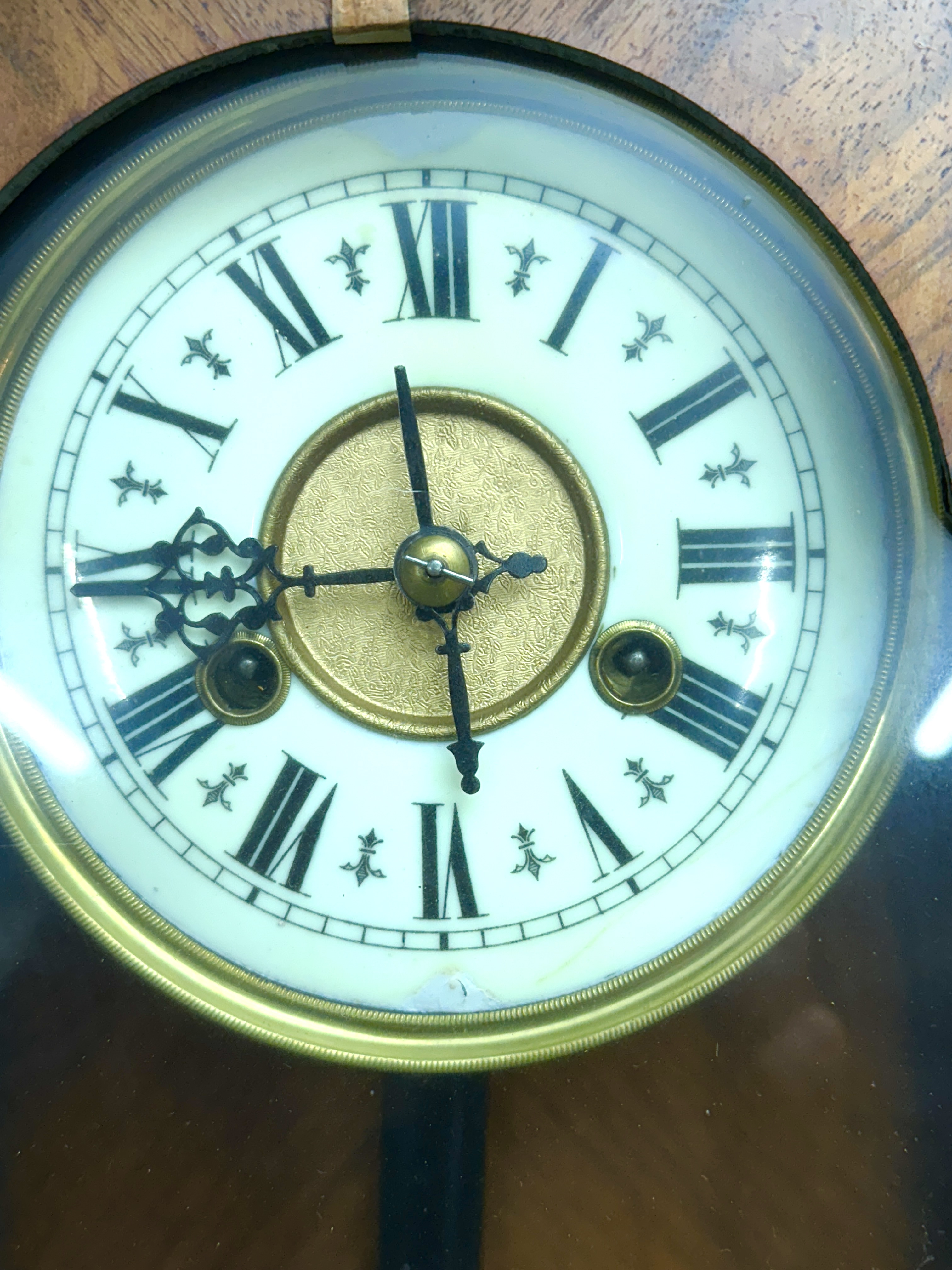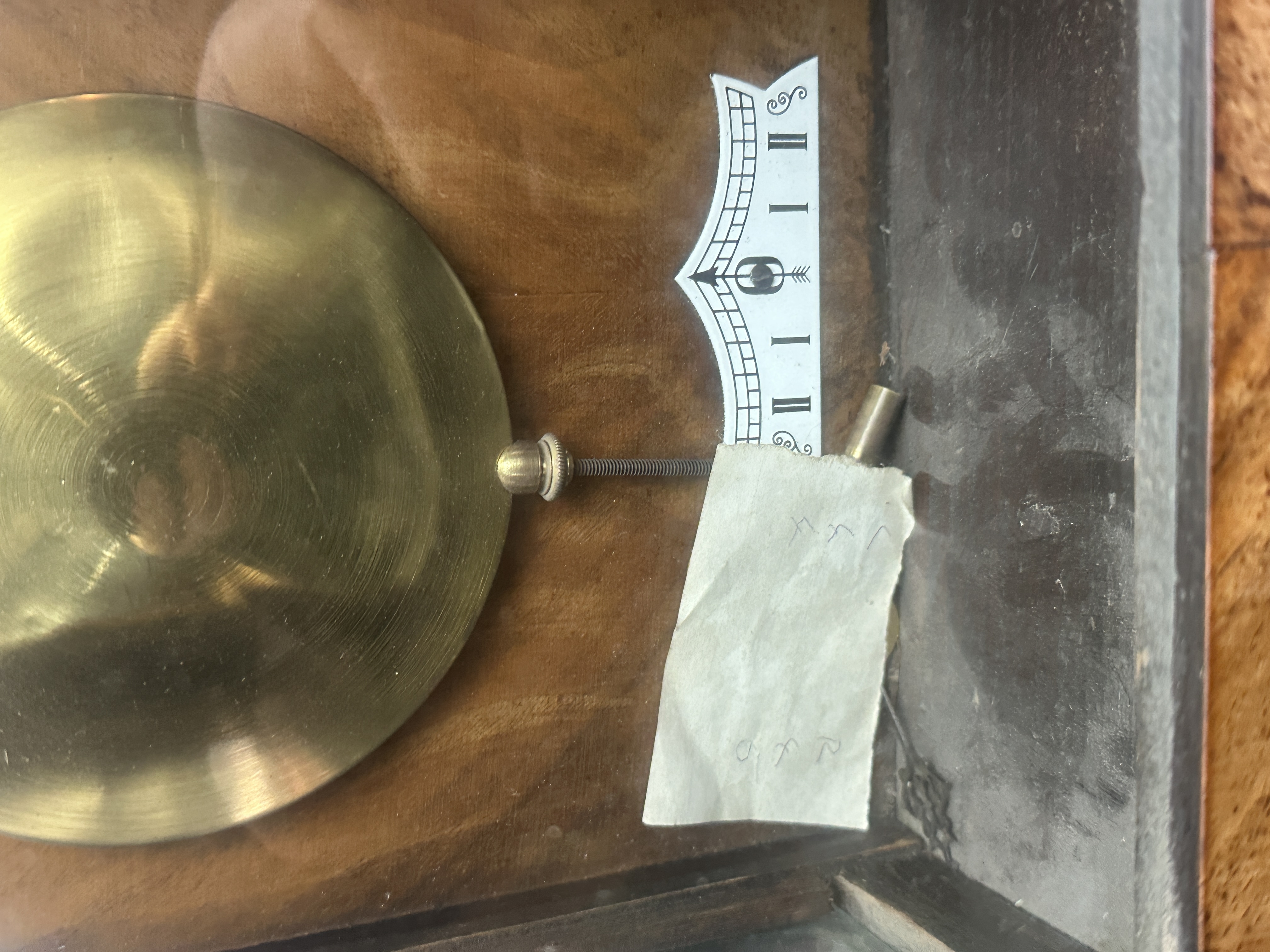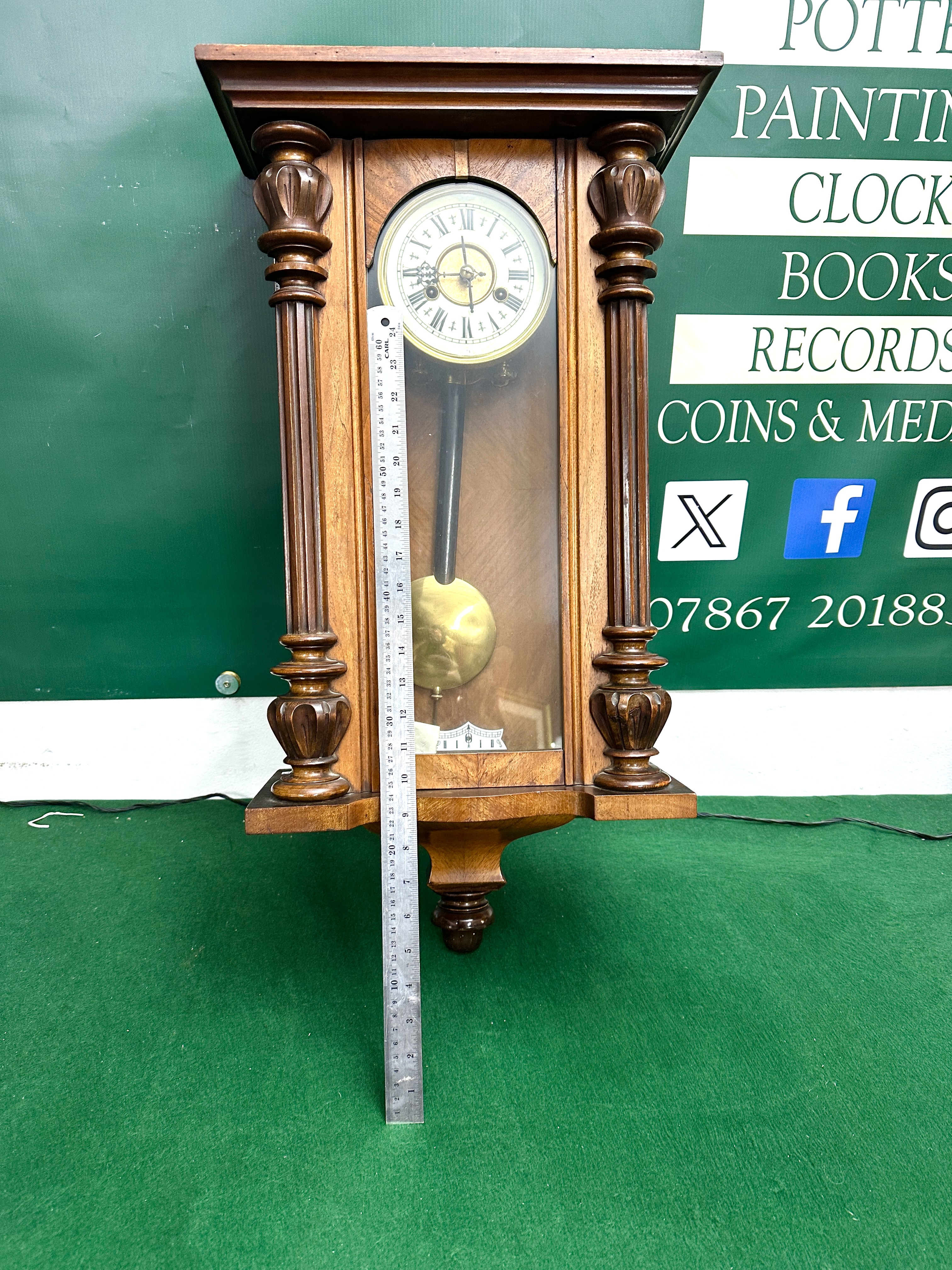 A late 19th or early 20th-century Junghans Vienna regulator-style wall clock. The polished wooden case is constructed with fluted side columns, a pediment-style top, and a turned bottom finial. The white dial features black Roman numerals with fleur-de-lis motifs, a central embossed brass-toned disc, and a brass bezel. The clock is fitted with ornate black steel hands and dual winding holes. A full-length glass panel door reveals a long pendulum with a large circular brass bob, situated above a white beat scale marked with Roman numerals. A winding key and a small hand-written note are present at the base of the case.