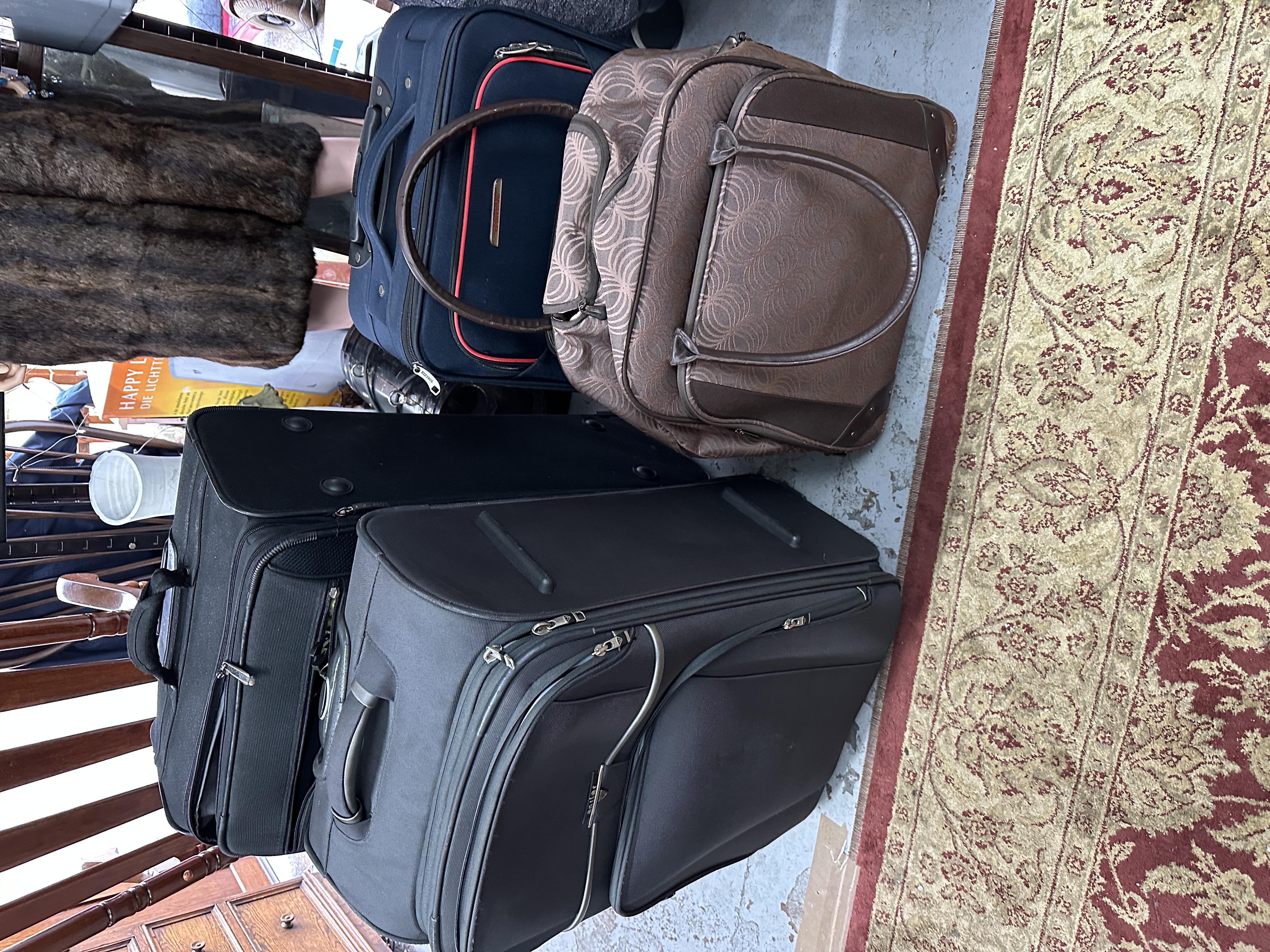 A collection of contemporary soft-sided luggage pieces in various sizes, including suitcases and a patterned carry-on bag. The items are constructed from synthetic fabrics in black, navy blue with red accents, and a brown swirl-patterned material with faux-leather trim. The pieces feature multiple zippered compartments, top and side carrying handles, and integrated wheels on the larger cases. One suitcase displays the brand name Antler on its handle.