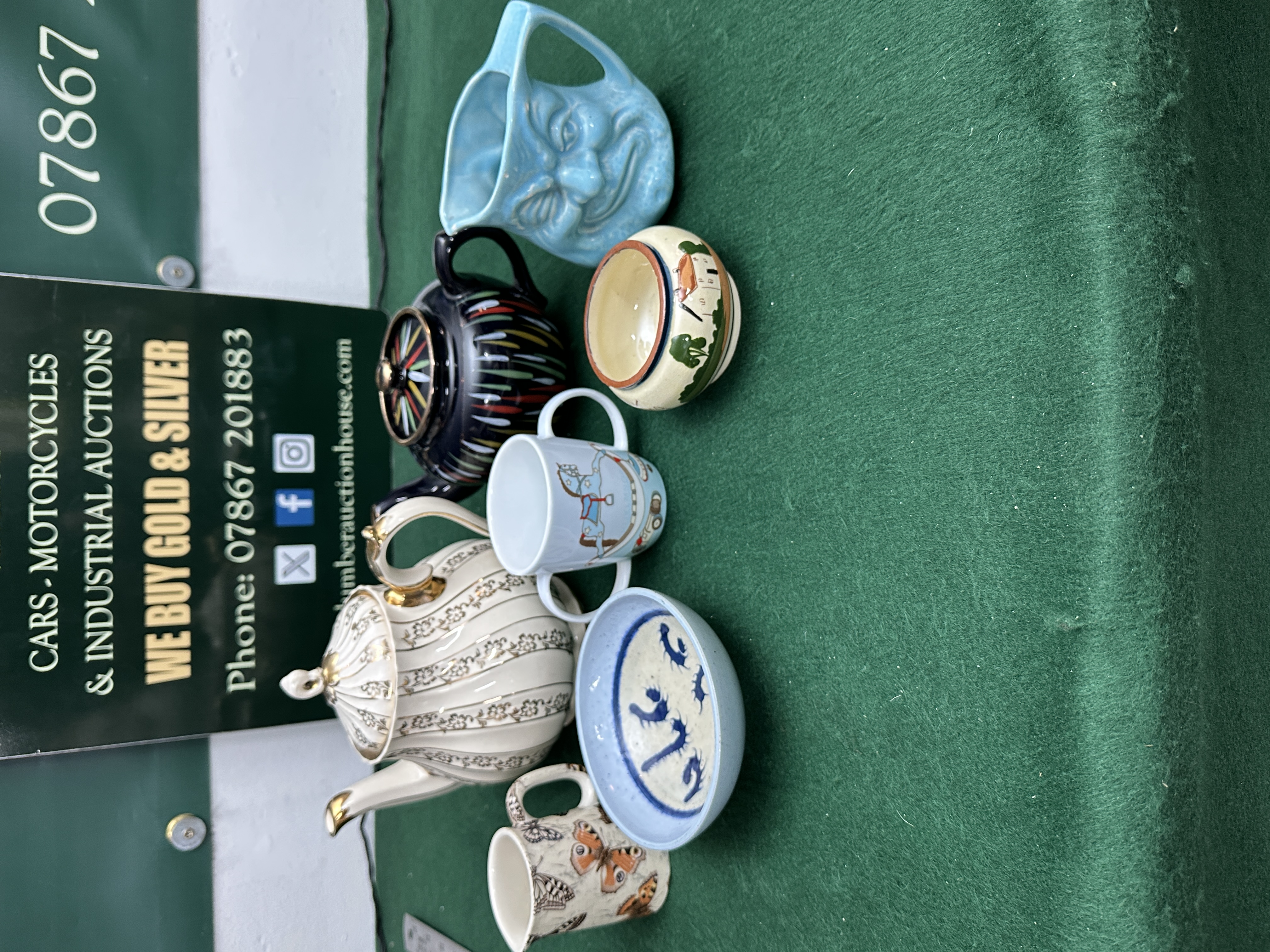 A collection of various ceramic and pottery decorative and functional items. The group includes a white fluted teapot with gilt-toned accents and a dark-bodied teapot decorated with multi-coloured vertical dashes. Also featured is a light blue glazed character pitcher with a moulded face, a two-handled child’s mug depicting a rocking horse, and a mug with butterfly motifs. The assortment includes a small bowl hand-painted with a rural landscape and a further bowl with blue interior designs. The items are crafted from a mix of porcelain and earthenware.