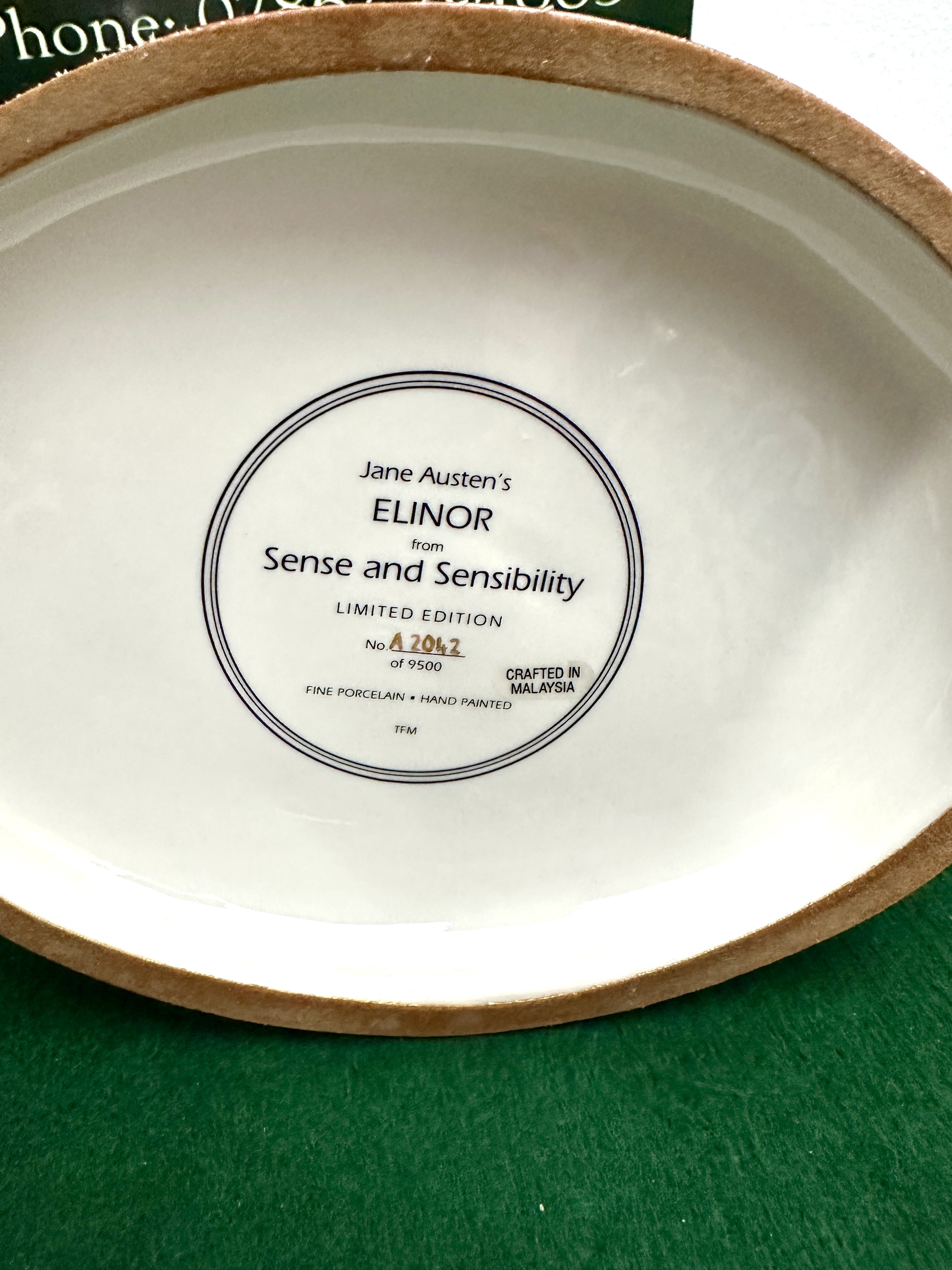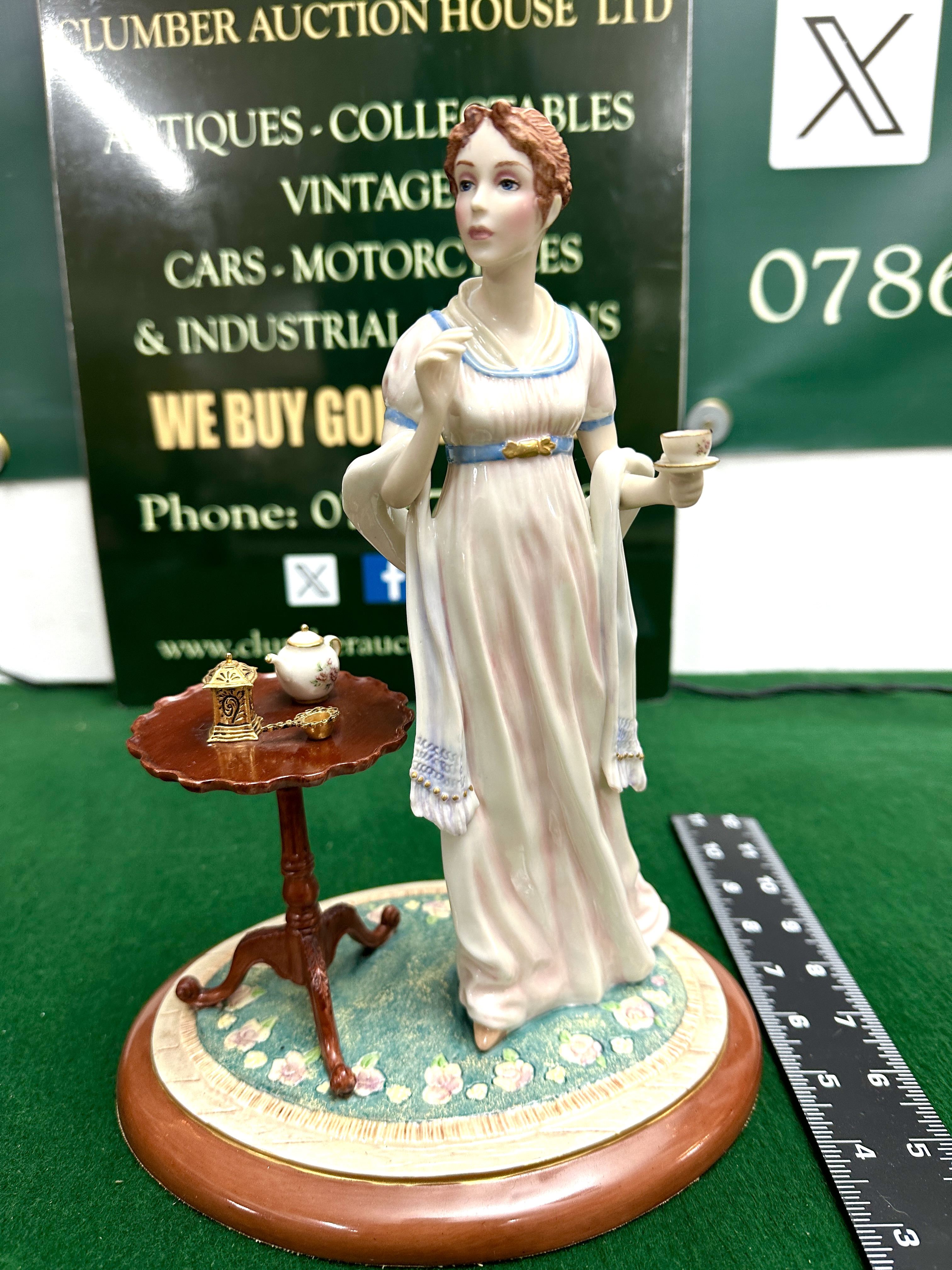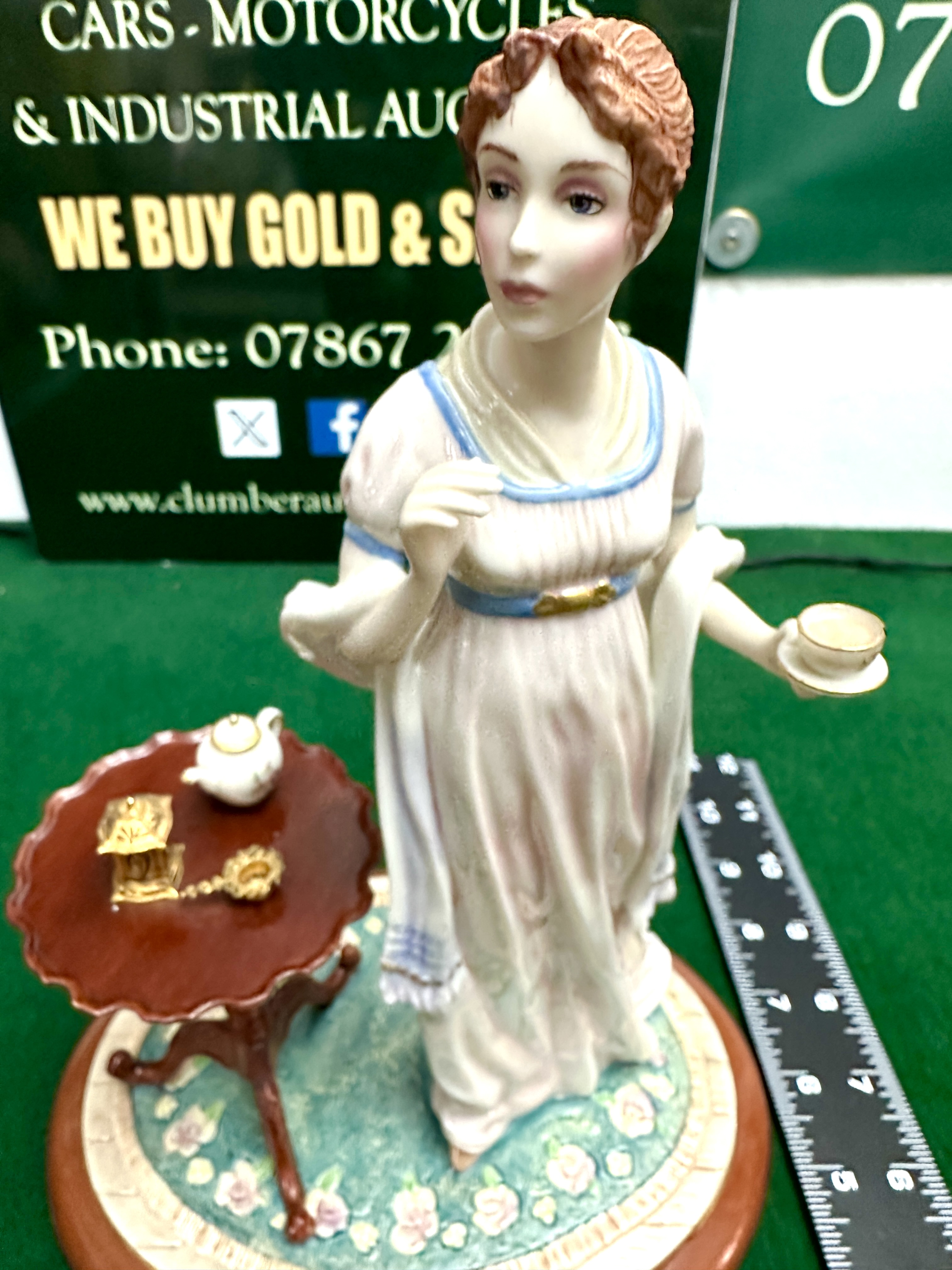 Franklin Mint Jane Austen’s Elinor from Sense and Sensibility hand-painted fine porcelain figurine. The figure is depicted in Regency-period costume, wearing a high-waisted cream dress with light blue accents and a white shawl. She is positioned on a circular base with a floral rug motif, standing beside a dark wood-style tripod tea table which supports a miniature teapot and accessories. The figure holds a small teacup and saucer. The underside features a black circular mark identifying the piece as a limited edition, numbered A 2042 of 9500, and specifies it was crafted in Malaysia for TFM.
