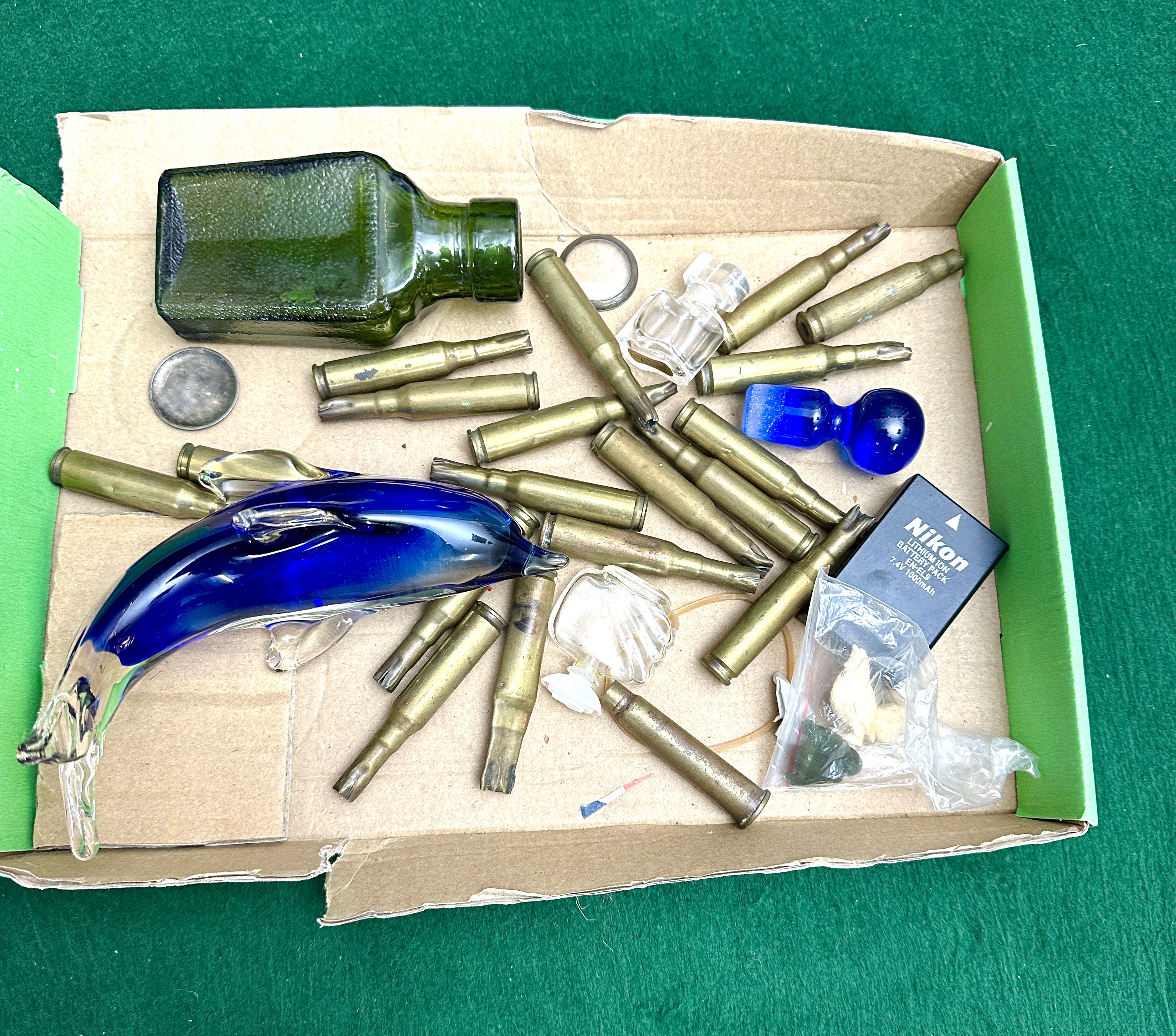 An assortment of miscellaneous items presented in a cardboard tray, The collection includes a blue and clear glass dolphin figurine, a green textured glass bottle, clear glass vials, and a blue glass stopper. The lot features multiple brass ammunition casings of various calibres, many of which show distinct signs of crushing and mechanical deformation. Also present is a Nikon EN-EL9 7.4V 1000mAh lithium-ion battery, a small metal disk, a metal ring, and a plastic bag containing unidentified materials.